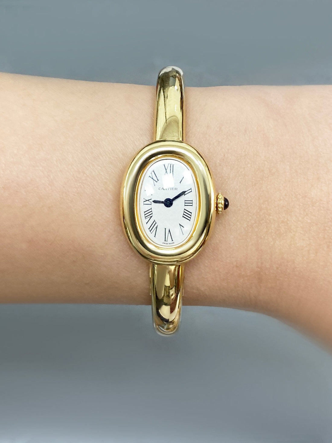Cartier Baignoire WGBA0018 Size 15 Ladies Watch. 18.7mm 18K yellow gold case. Silver dial with blue hands and black Roman numeral hour markers. 18K yellow gold bracelet with 18K yellow gold hidden clasp. Will fit up to a 5.75-inch wrist. Sapphire crystal. 18K yellow gold case back. Quartz: Battery powered movement. This watch comes with original Box and Papers.