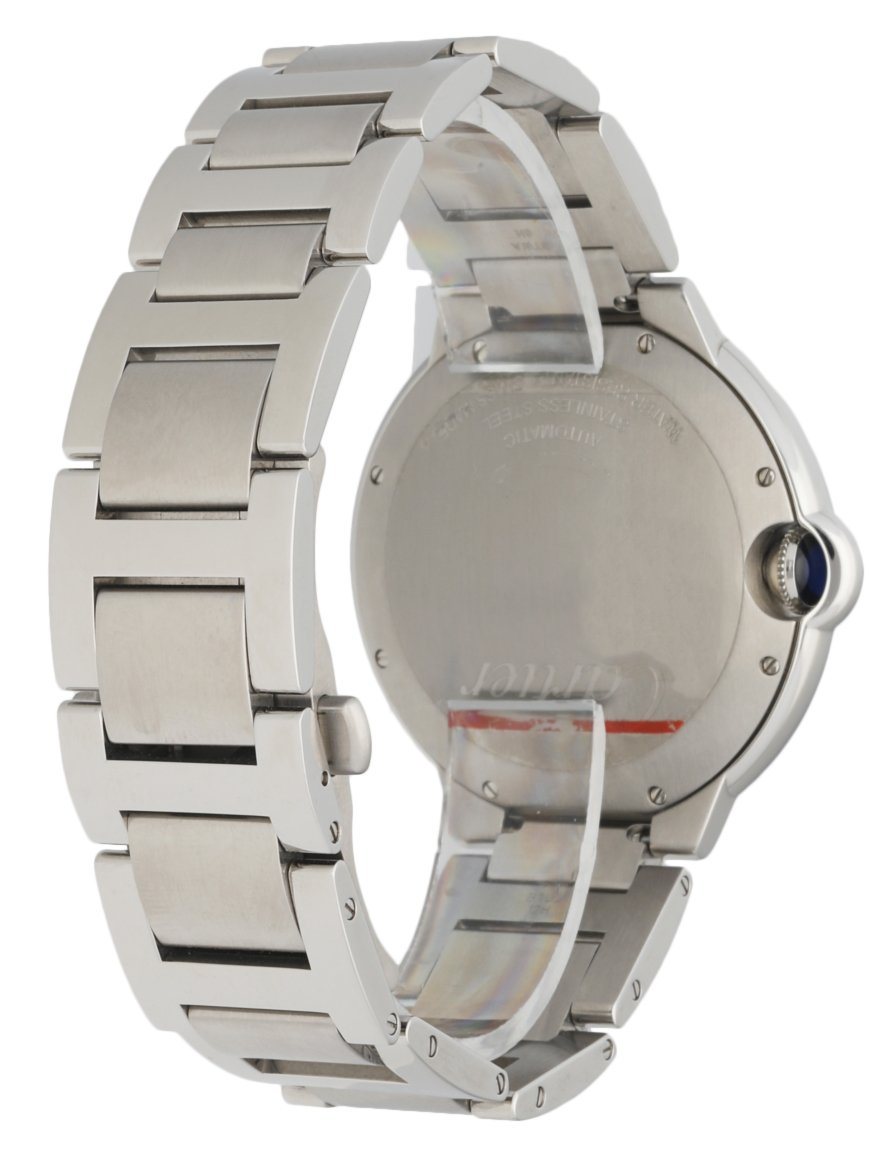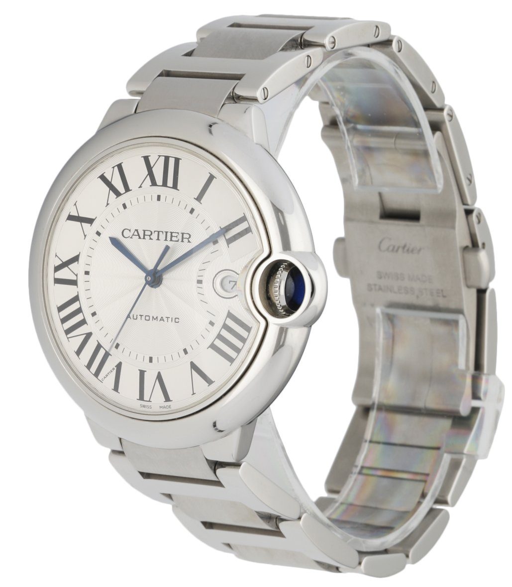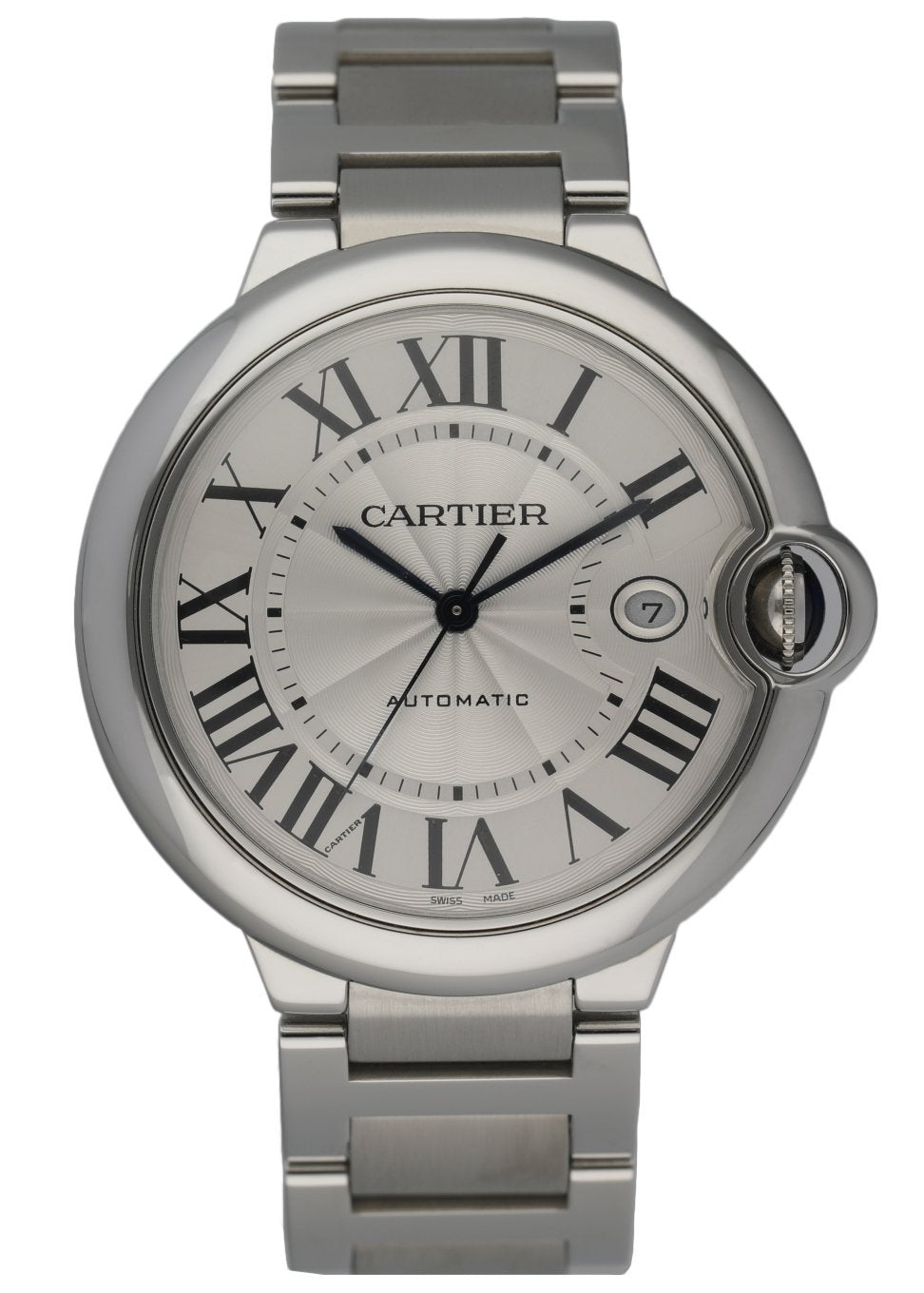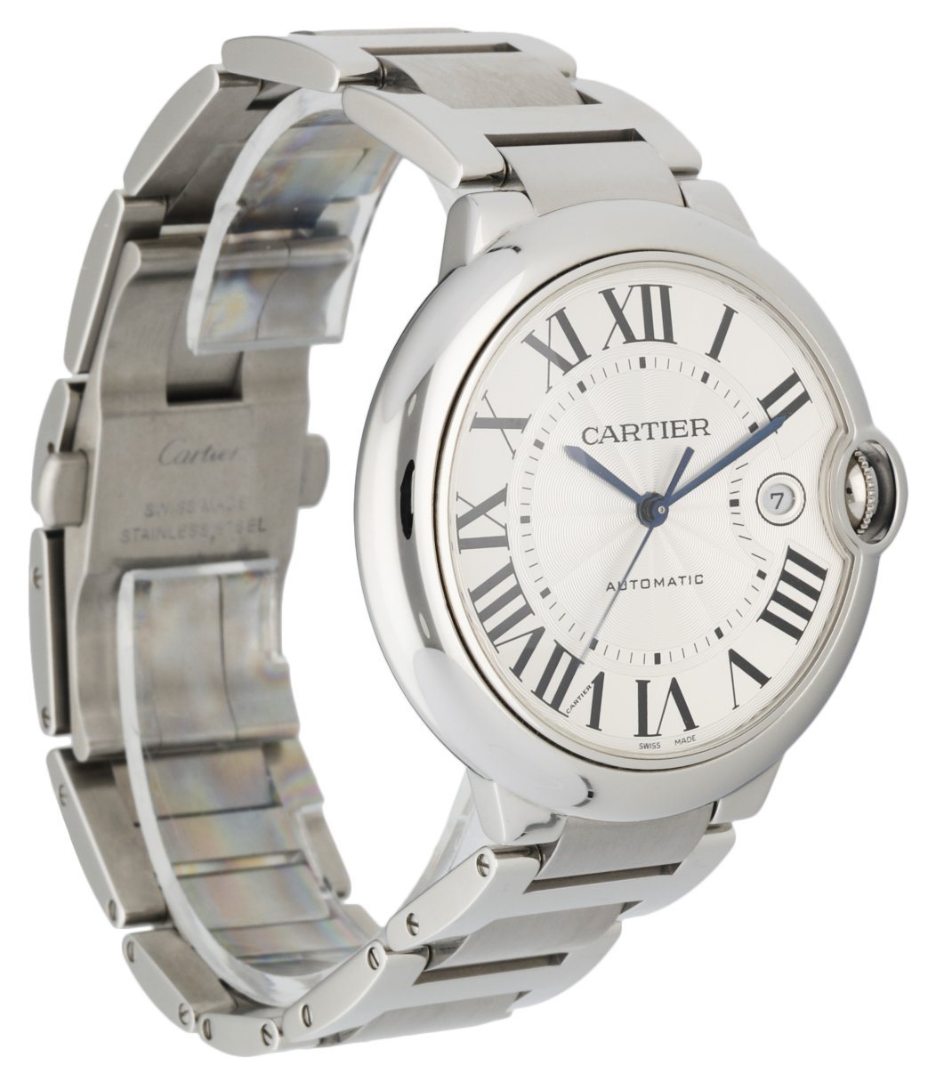 Cartier Ballon Bleu 3765 Men's Watch. 42mm stainless steel case with fixed smooth bezel. Silver dial with blue steel hands and Black Roman numeral hour markers. Minute marker around the inner dial. Date display at the 3 o'clock position. Stainless steel bracelet with hidden butterfly push button clasp. Will fit up to a 7.5-inch wrist. Sapphire crystal, stainless steel case back. Automatic self-winding movement with a 42-hour power.