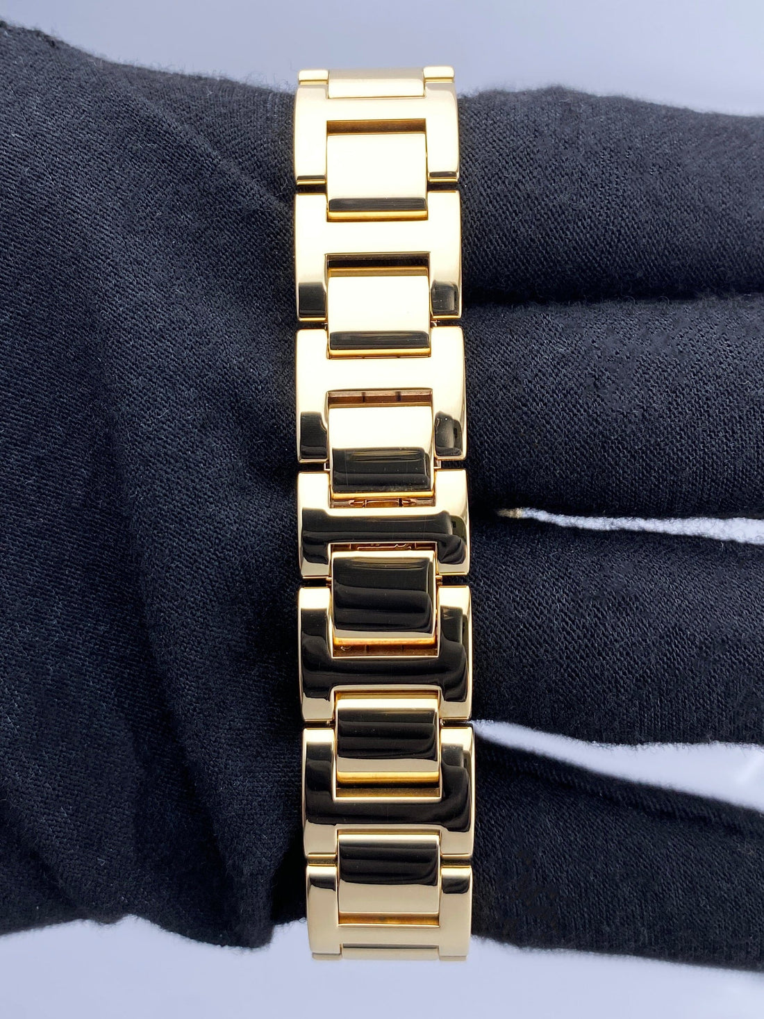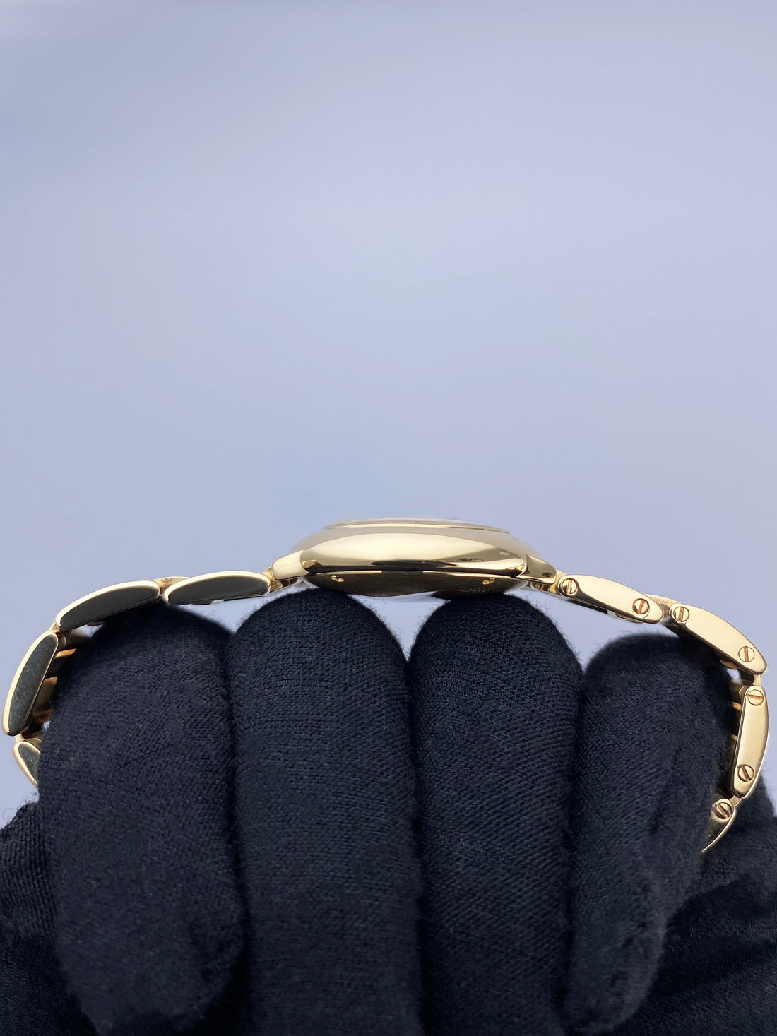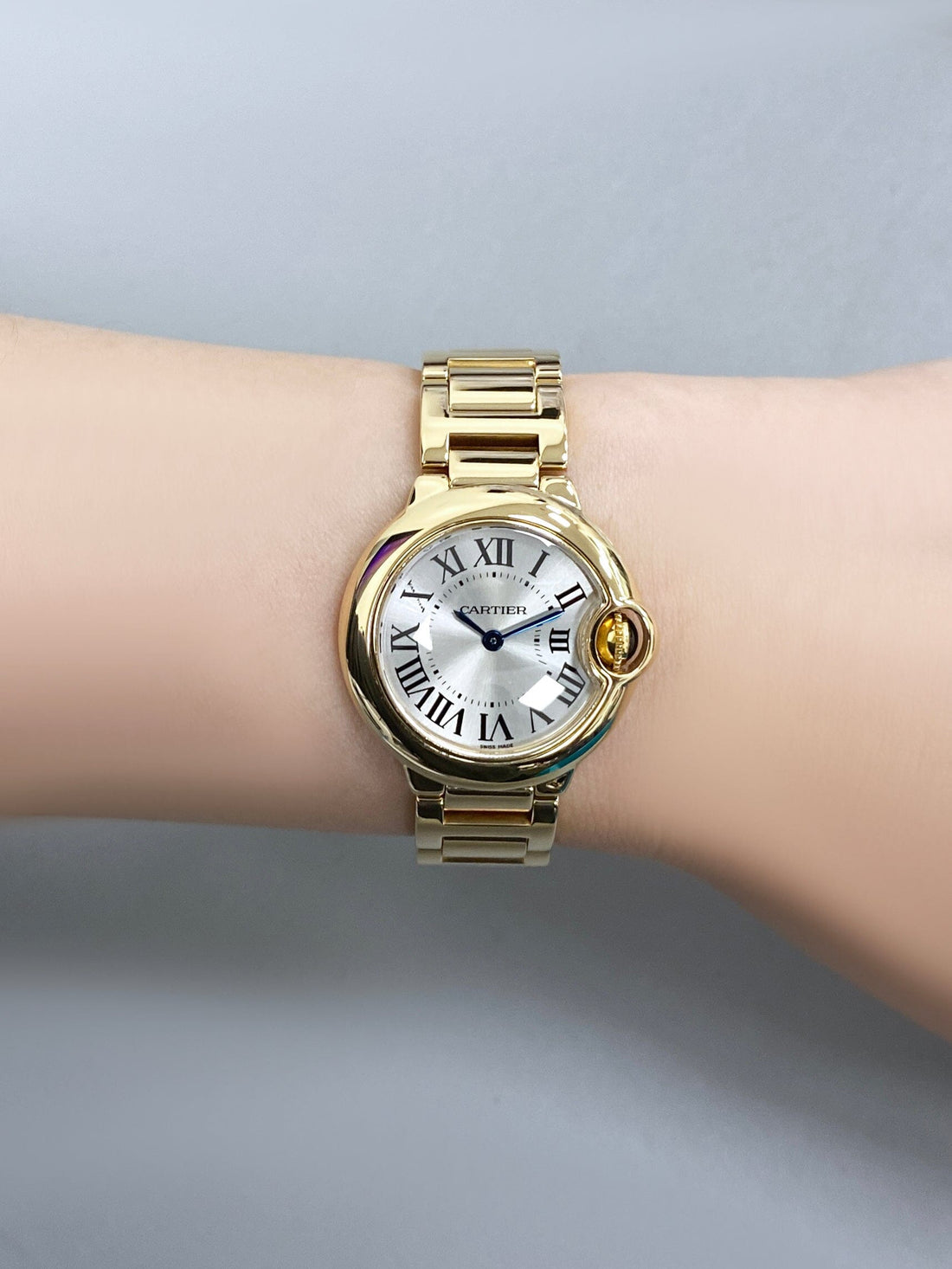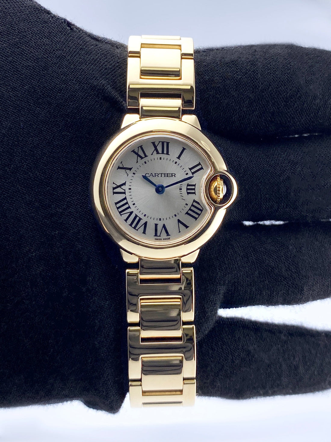 Cartier Ballon Bleu W69001Z2 / 3006 Watch. 28mm 18K yellow gold case. 18K yellow gold bezel. Silver dial with blue steel hands and Roman numeral hour markers. Minute markers on the inner dial. 18K yellow gold bracelet with hidden butterfly clasp. Will fit up to a 6-inch wrist. Sapphire crystal. 18K yellow gold case back. Quartz: Battery powered movement.