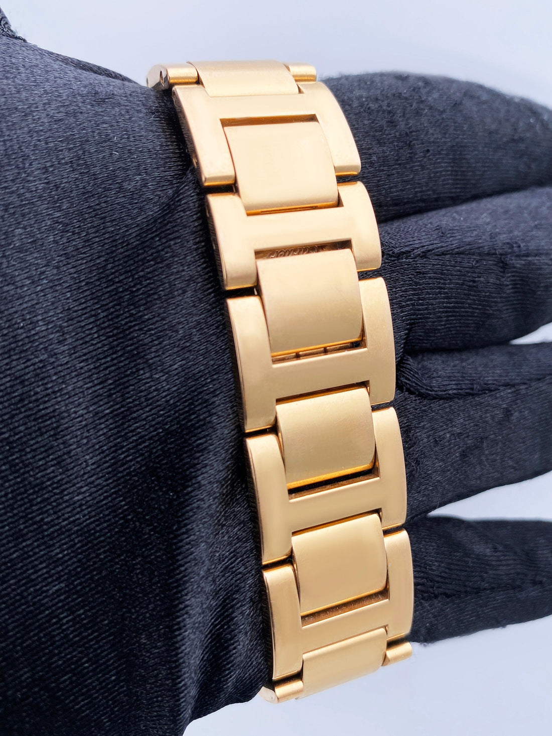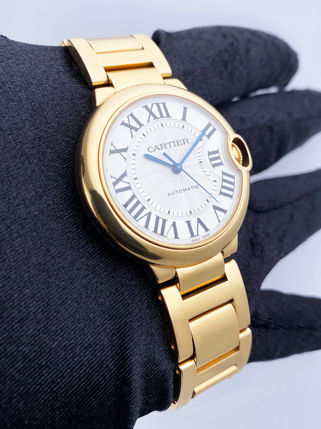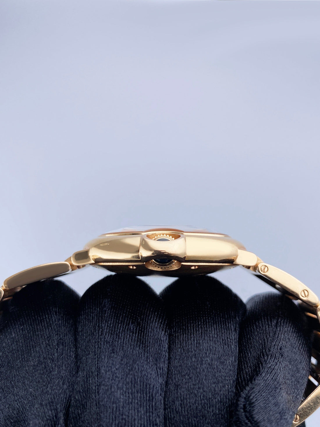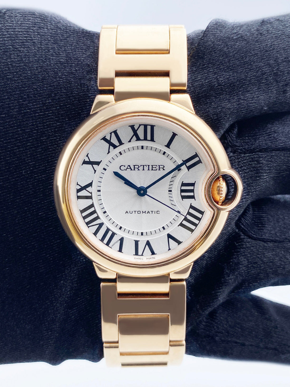 Cartier Ballon Bleu W69004Z2 / 3003 Mens Watch. 36mm 18K rose gold case. 18K rose gold bezel. Silver dial with blue steel hands and Roman numeral hour markers. Minute markers on the inner dial. 18K rose gold bracelet with hidden butterfly clasp. Will fit up to a 6-inch wrist. Sapphire crystal. 18K rose gold case back. Automatic self-winding movement. This watch comes with original Box and Papers.