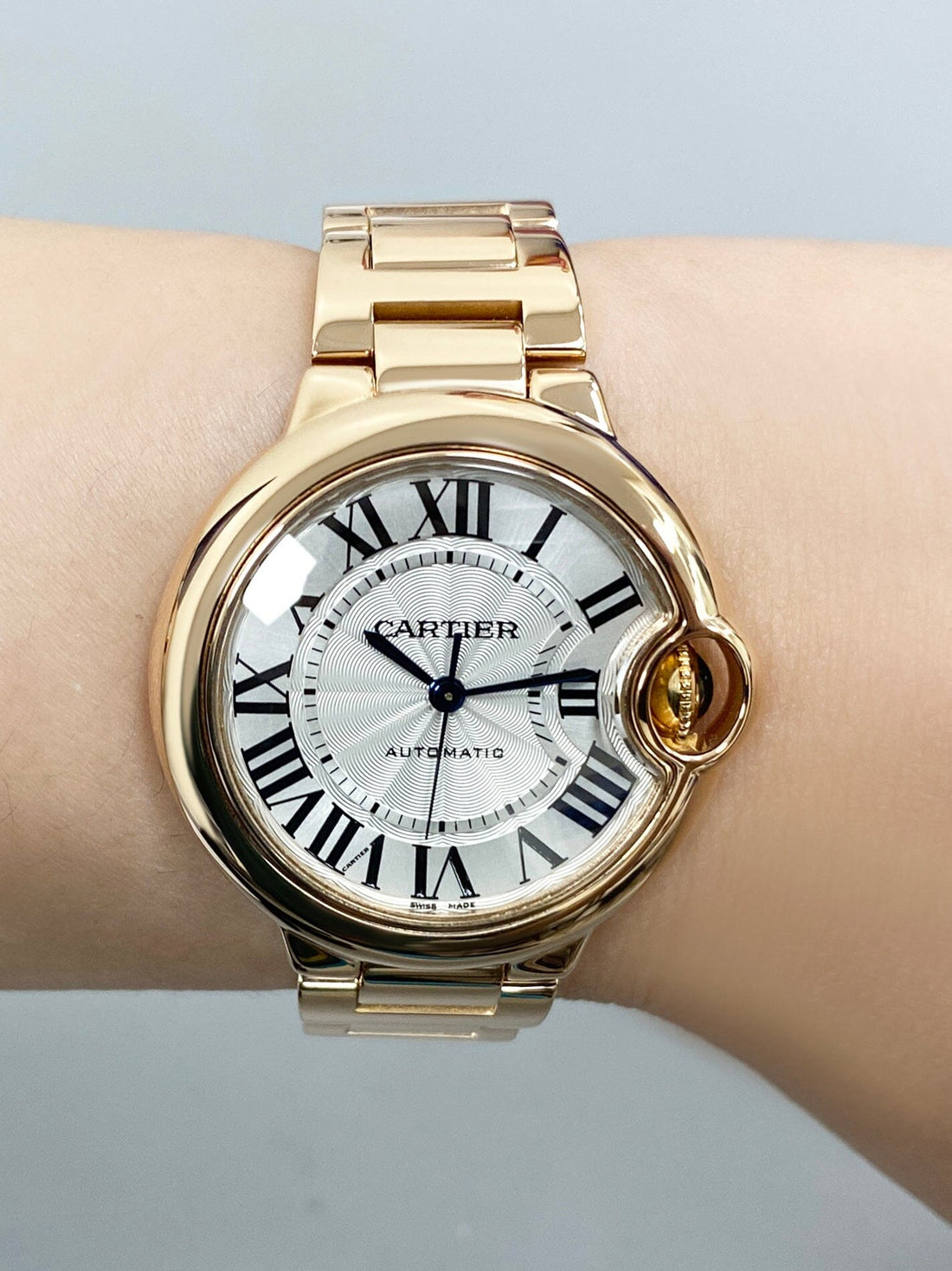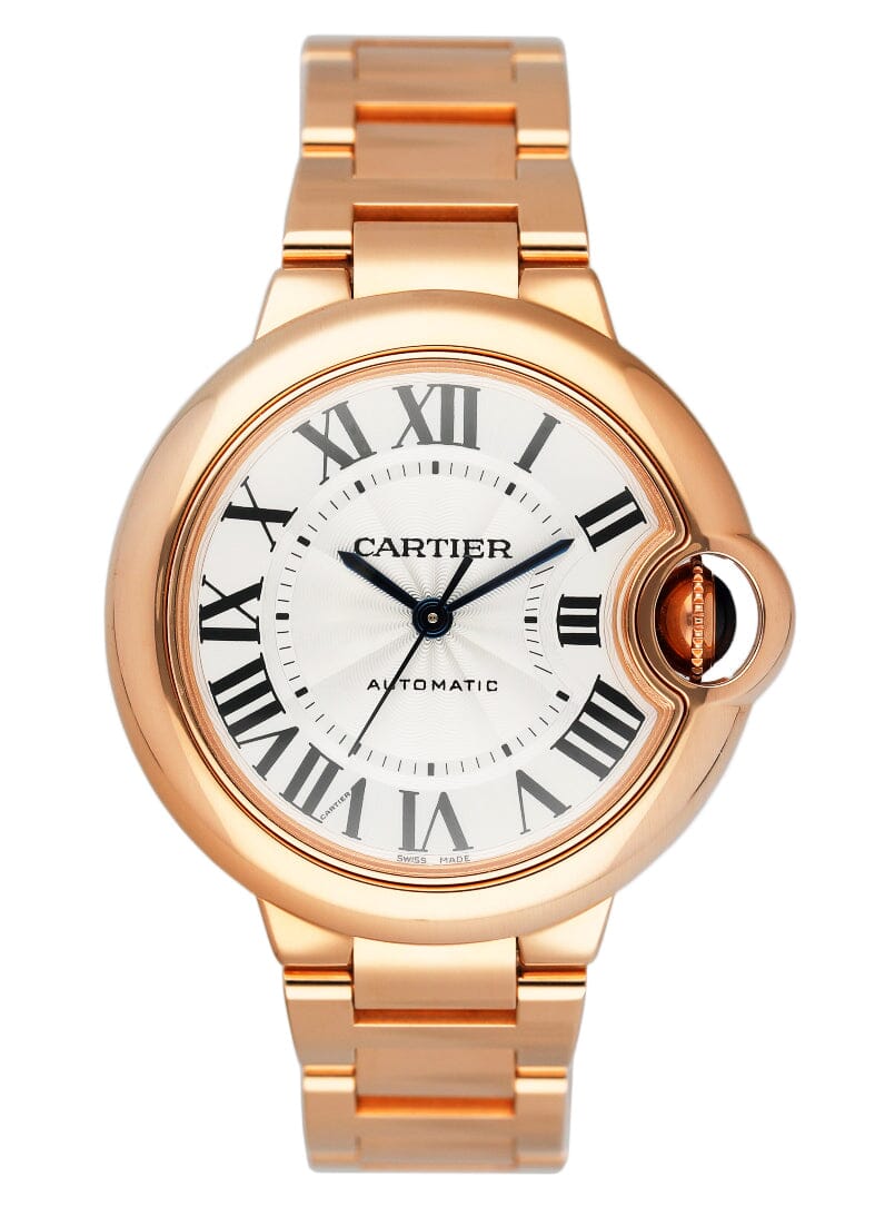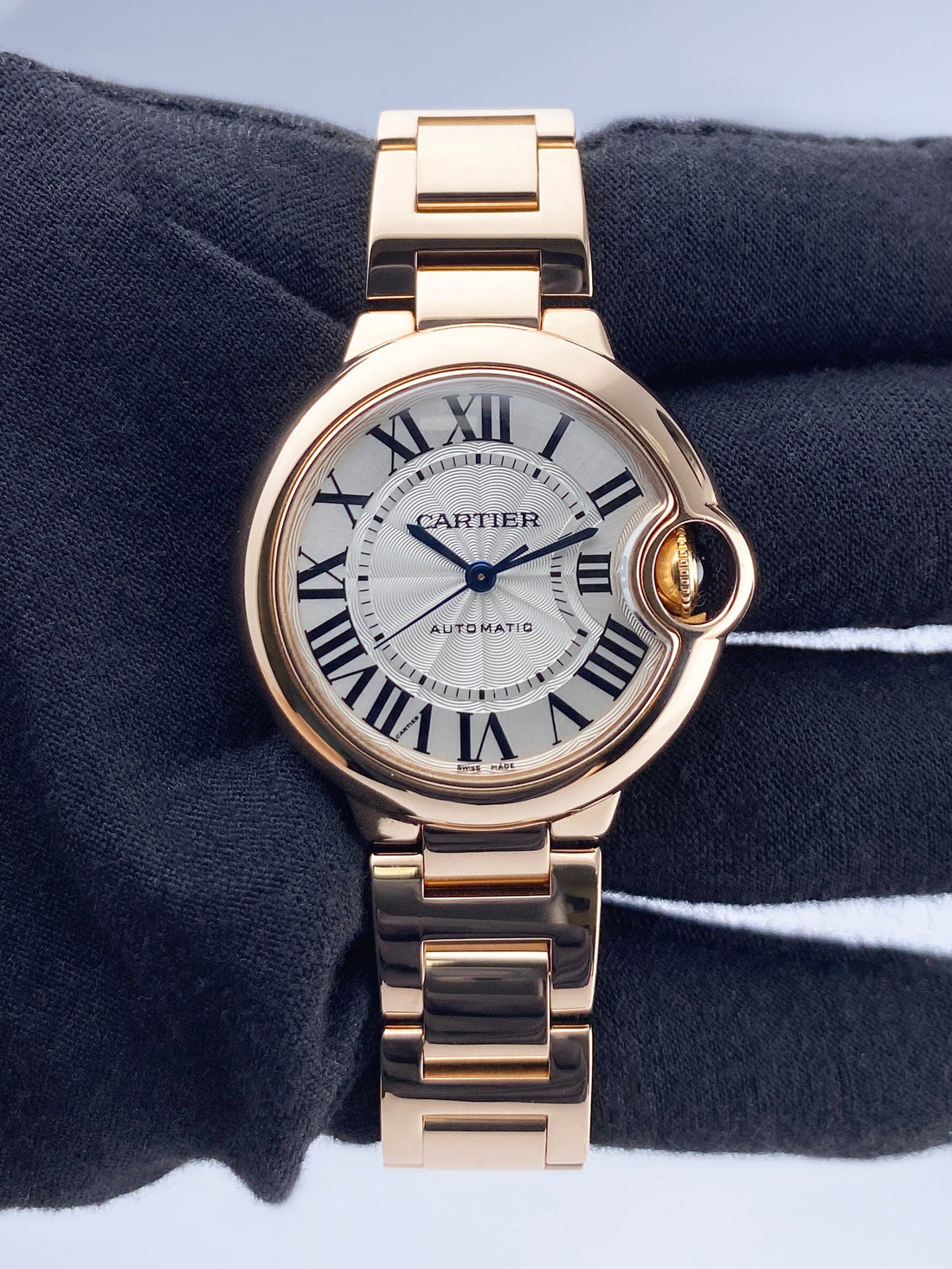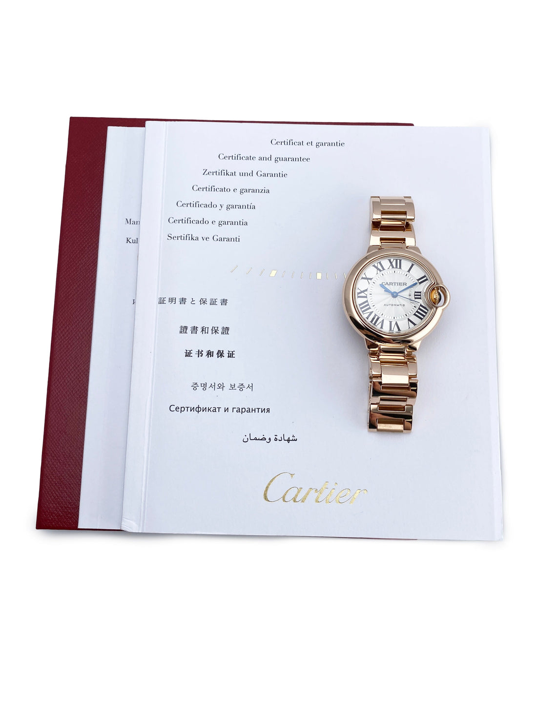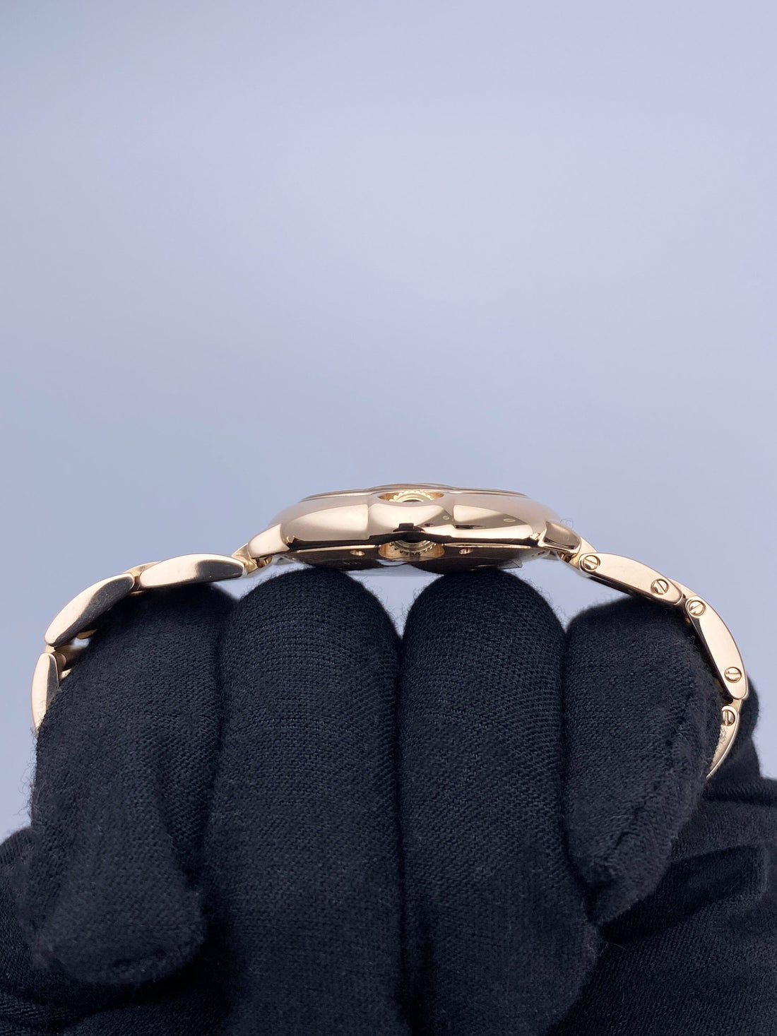 Cartier Ballon Bleu W6920068 / 3490 Ladies Watch. 33mm 18K rose gold case. 18K rose gold bezel. Silver dial with blue steel hands and Roman numeral hour markers. Minute markers on the inner dial. 18K rose gold bracelet with hidden butterfly clasp. Will fit up to a 6-inch wrist. Sapphire crystal. 18K rose gold case back. Automatic self-winding movement. This watch comes with original Box and Papers.
