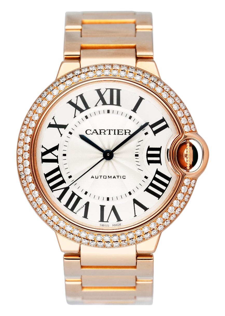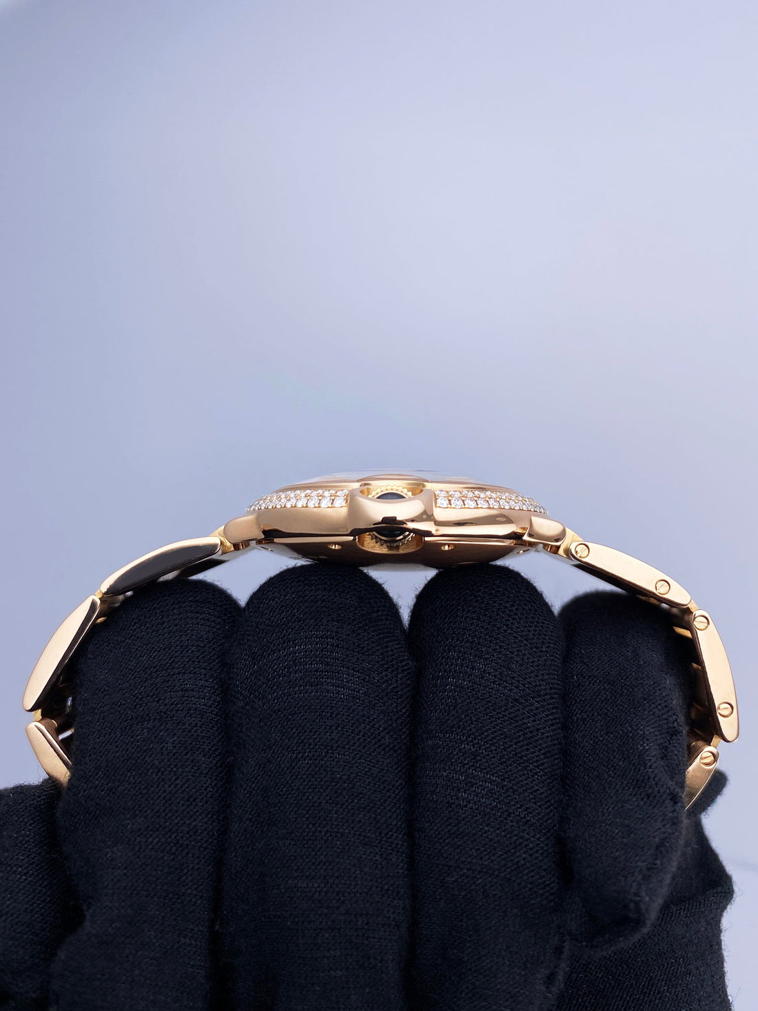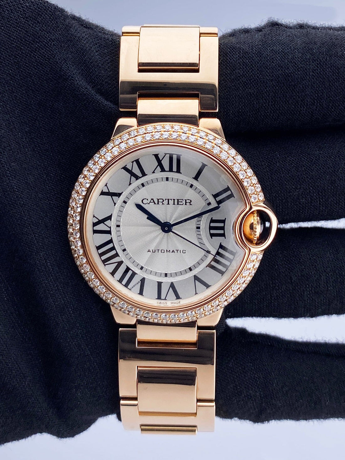 Cartier Ballon Bleu WE9005Z3 / 3003 Ladies Watch. 36mm 18K rose gold case. 18K rose gold bezel with factory diamond. Silver dial with blue steel hands and Roman numeral hour markers. Minute markers on the inner dial. 18K rose gold bracelet with hidden butterfly clasp. Will fit up to a 6-inch wrist. Sapphire crystal. 18K rose gold case back. Automatic self-winding movement.