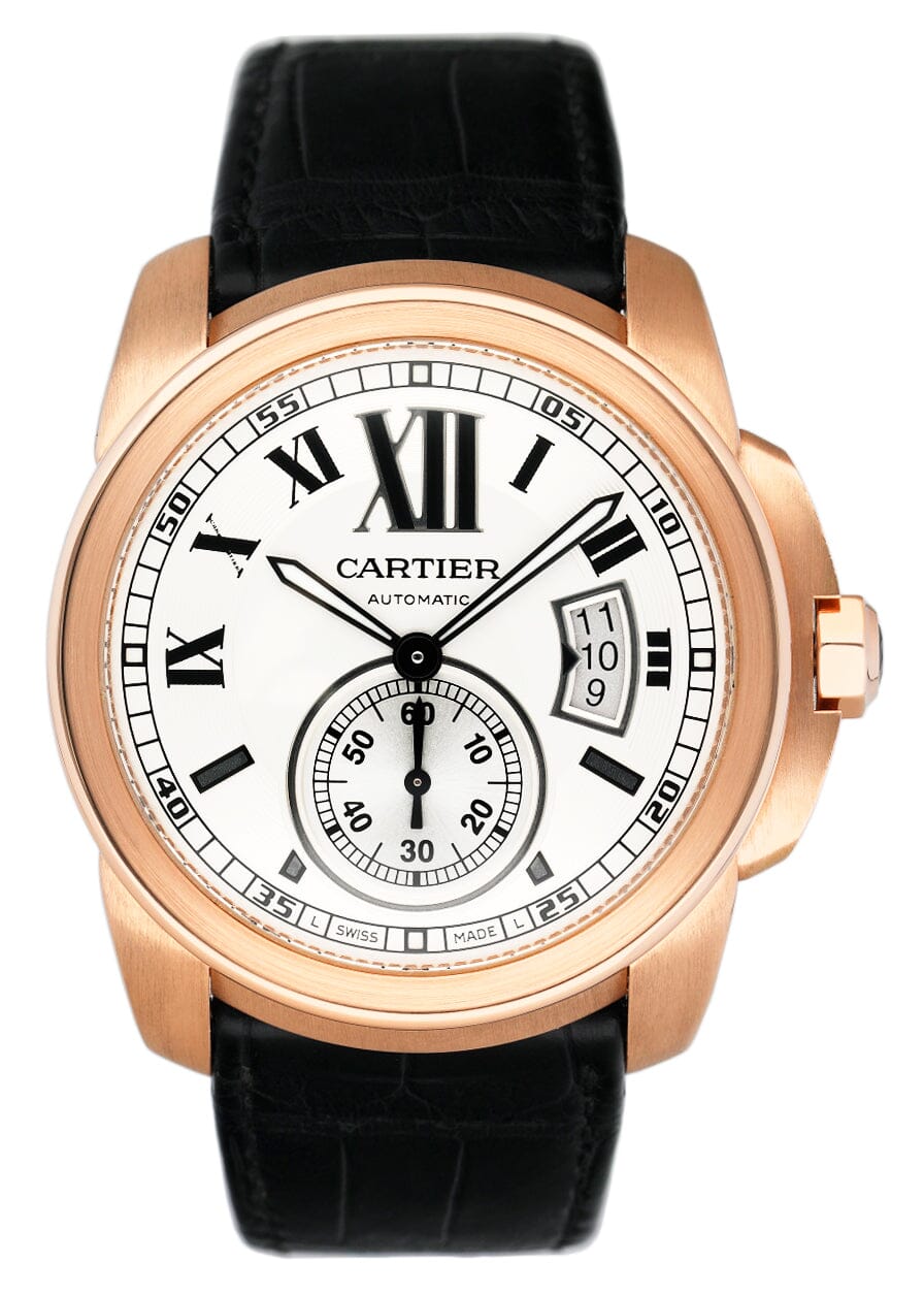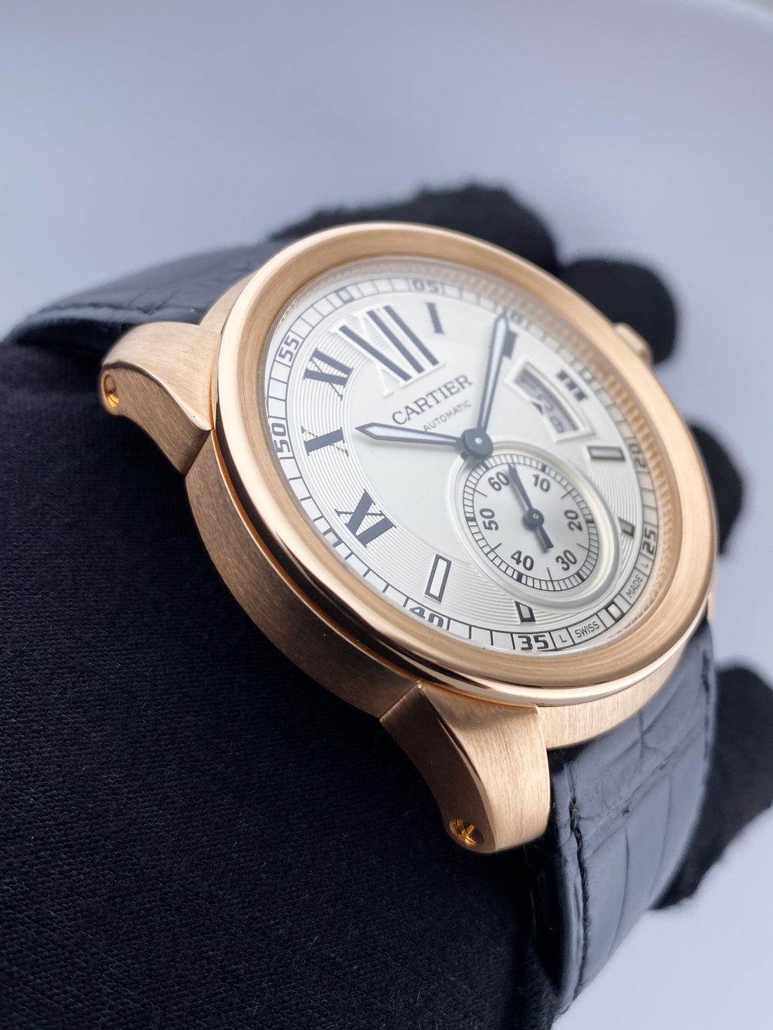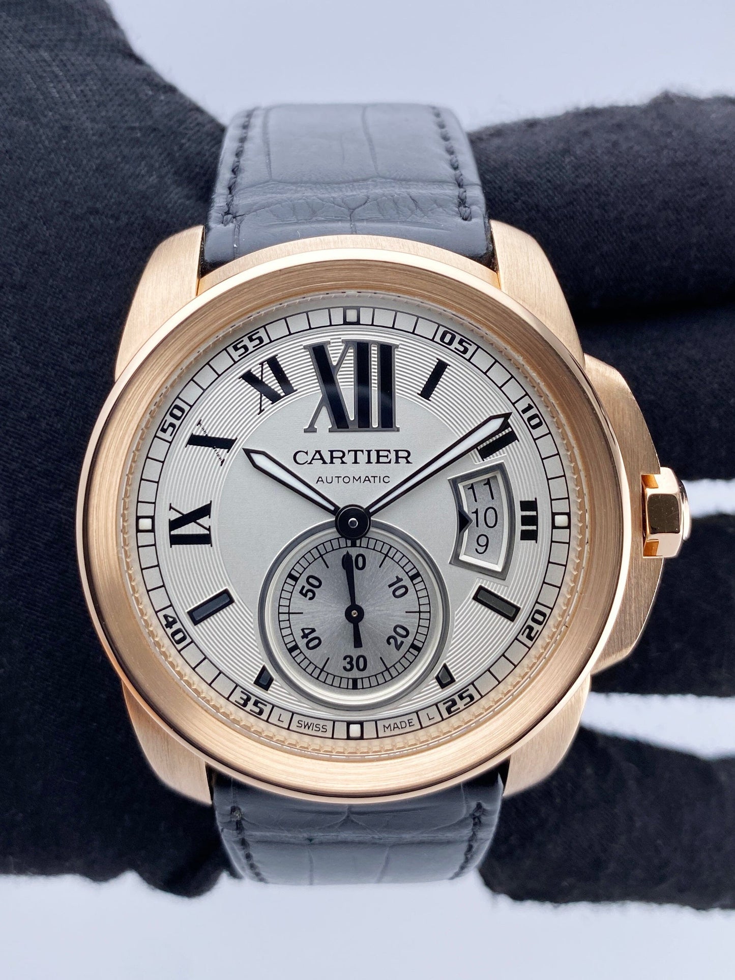 Cartier Calibre W7100009 / 3300 Mens Watch. 42mm 18K rose gold case. 18K yellow gold bezel. Silver dial with rose gold hands and Roman numerals & index hour markers. Small second at 6 o'clock. Date display at the 3 o'clock. Black strap with deployment clasp. Will fit up to a 7.5-inch wrist. Sapphire crystal. Transparent sapphire crystal case back. Automatic self-winding movement.