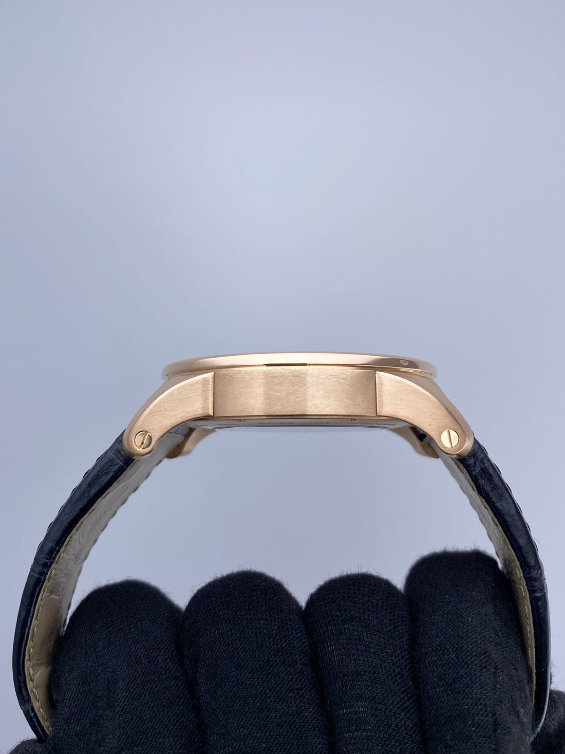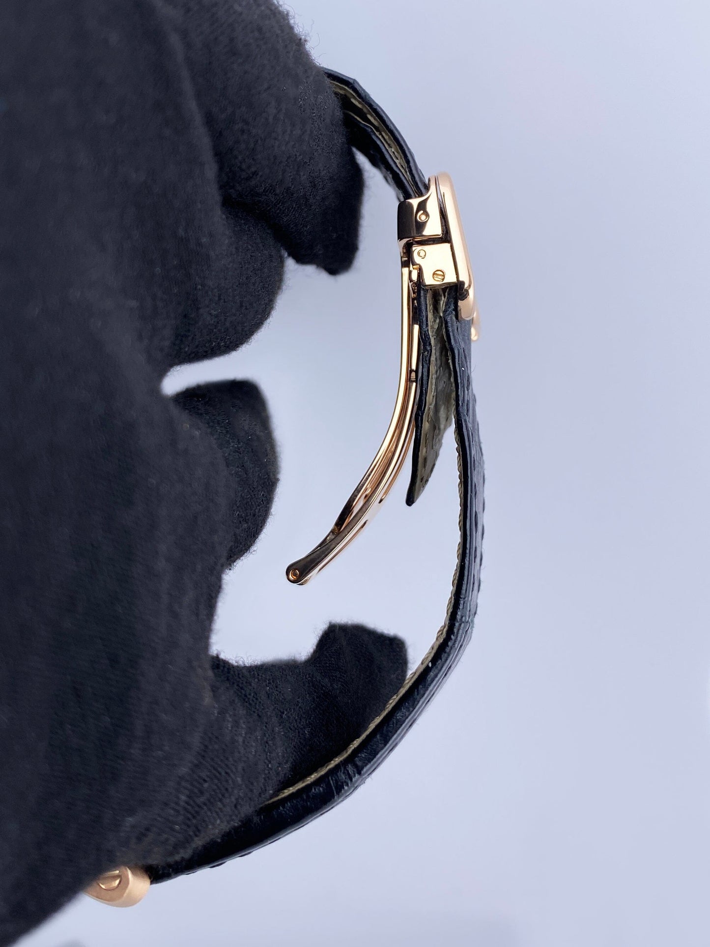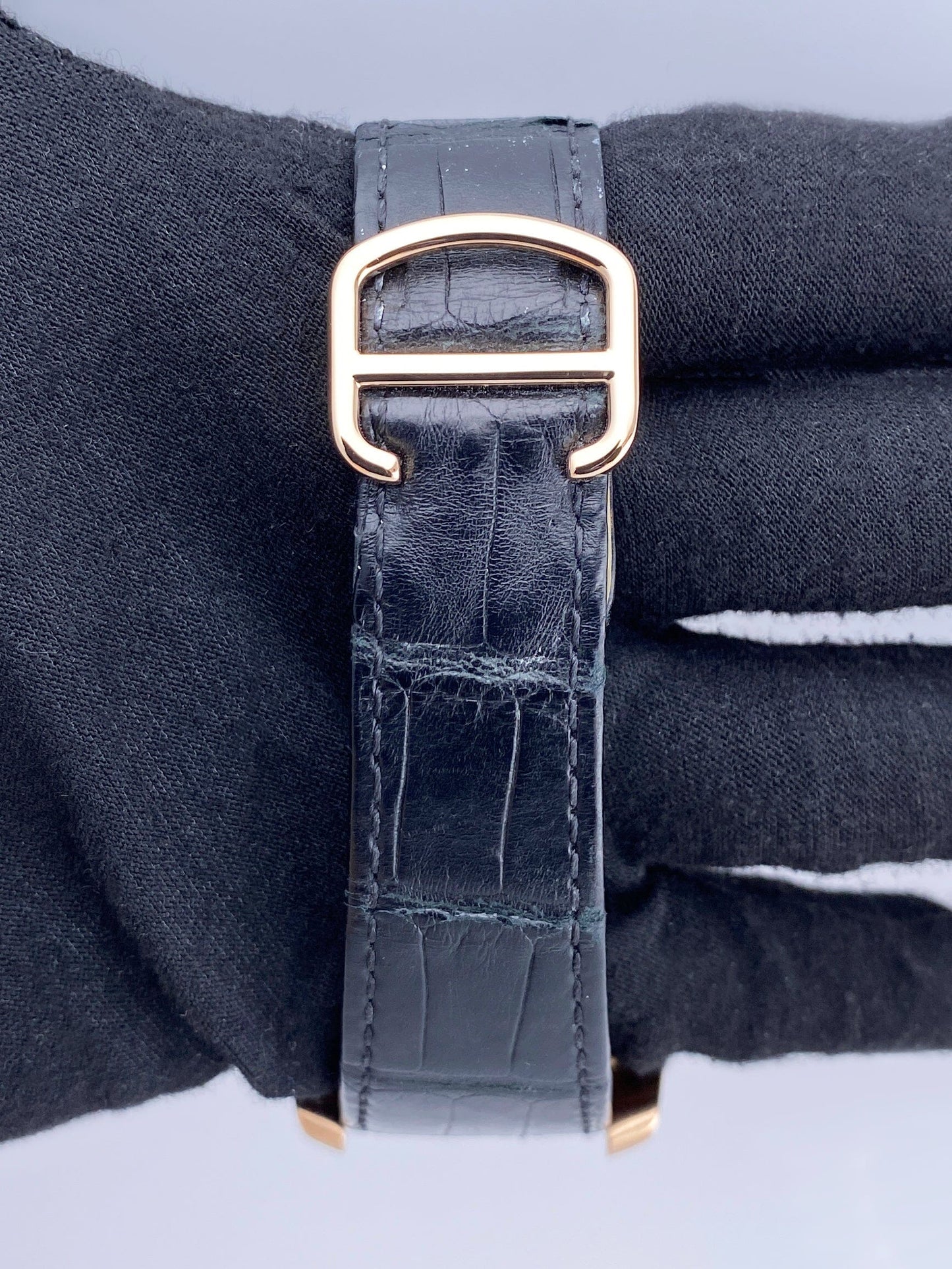 Cartier Calibre W7100009 / 3300 Mens Watch. 42mm 18K rose gold case. 18K yellow gold bezel. Silver dial with rose gold hands and Roman numerals & index hour markers. Small second at 6 o'clock. Date display at the 3 o'clock. Black strap with deployment clasp. Will fit up to a 7.5-inch wrist. Sapphire crystal. Transparent sapphire crystal case back. Automatic self-winding movement.