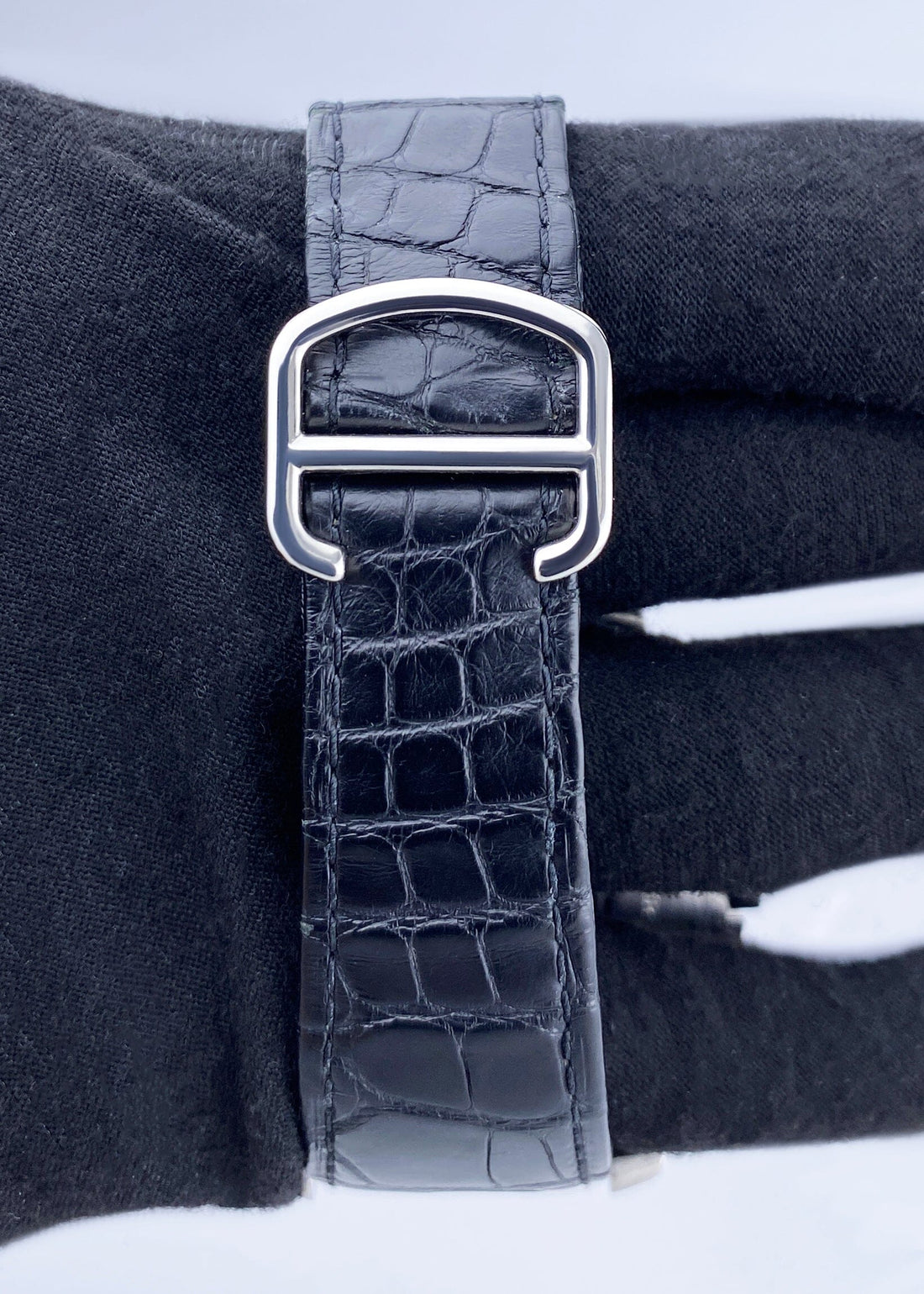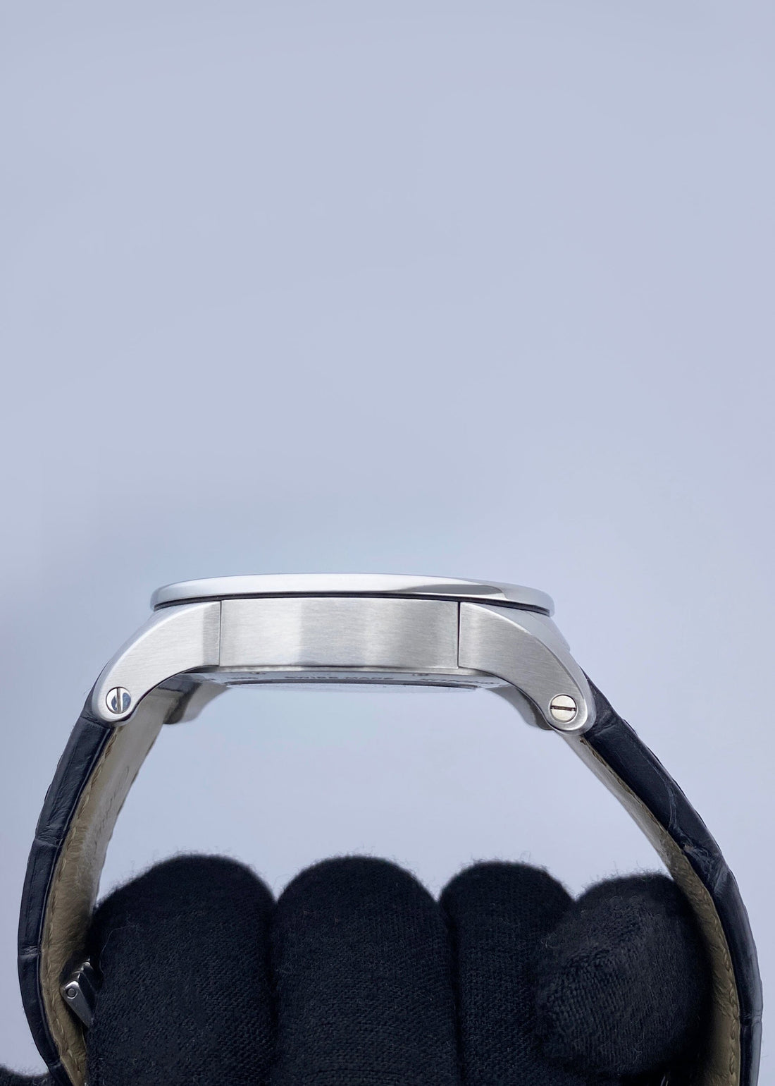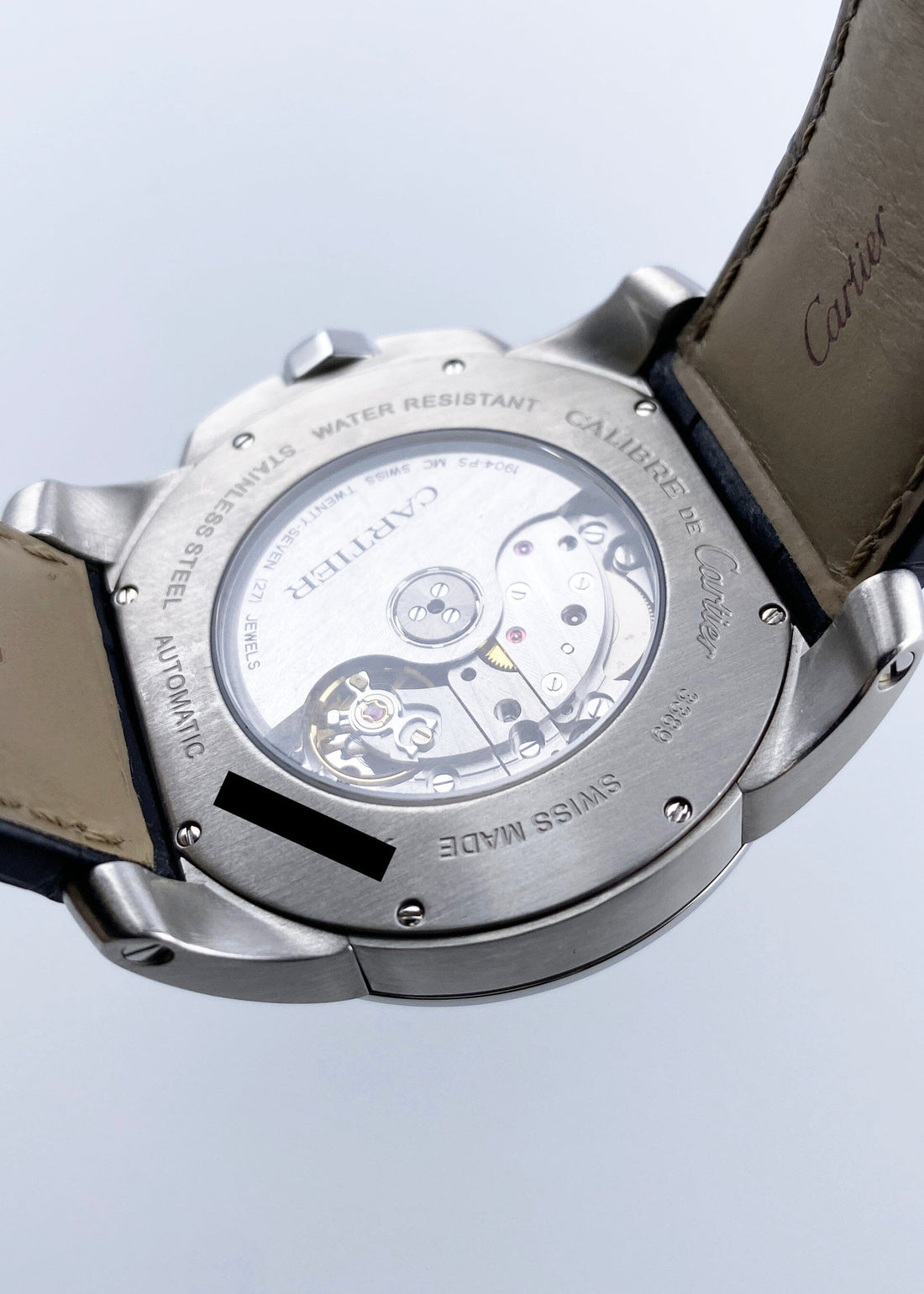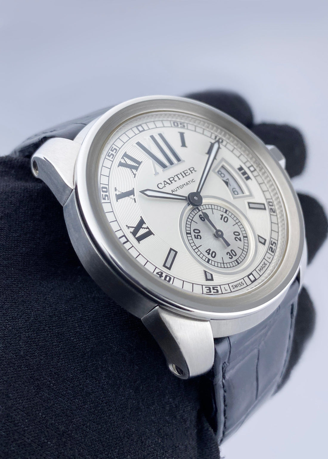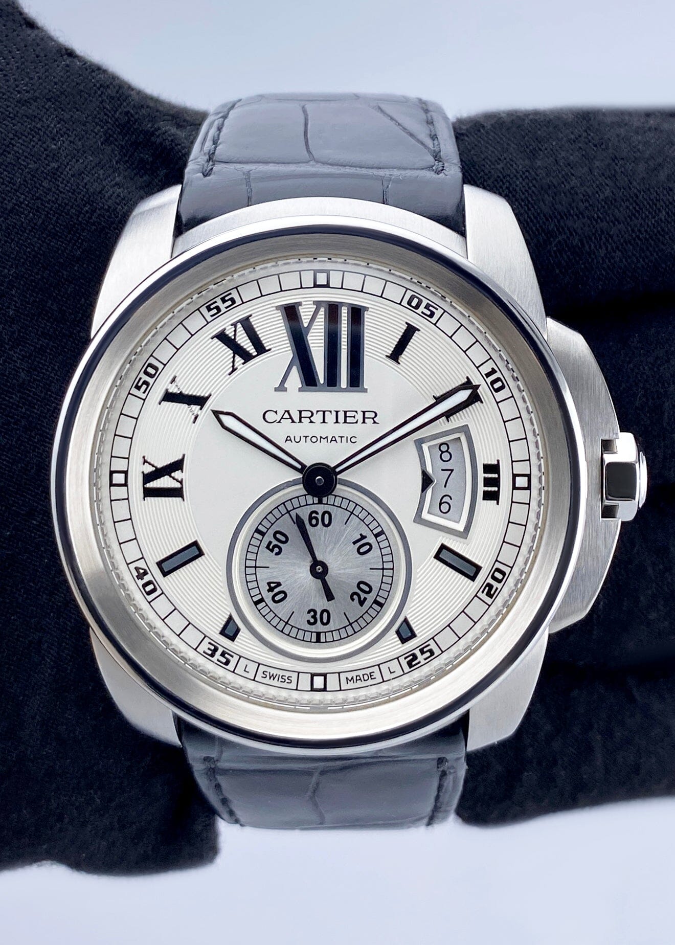 Cartier Calibre W7100015 / 3389 Mens Watch. 42mm stainless steel case. Stainless steel bezel. Silver dial with steel hands and Roman numeral & index hour markers. Small second sub-dial. The date is displayed at 3 o'clock position. Black leather strap with deployment clasp. Will fit up to a 7-inch wrist. Sapphire crystal. Transparent sapphire crystal. Automatic self-winding movement.