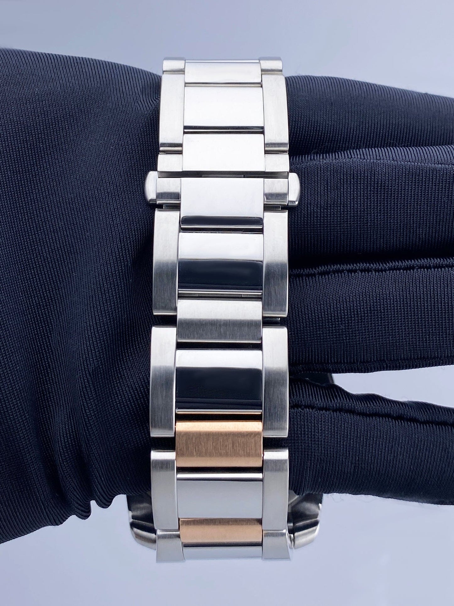 Cartier Calibre W7100036 / 3389 Mens Watch. 42mm stainless steel case. 18K rose gold bezel. Silver dial with black hands and Roman numeral & index hour markers. Small second sub-dial. The date is displayed at 3 o'clock position. 18K rose gold & stainless steel bracelet with fold over clasp with double push button safety. Will fit up to a 7.5-inch wrist. Sapphire crystal. Transparent sapphire crystal. Automatic self-winding movement.