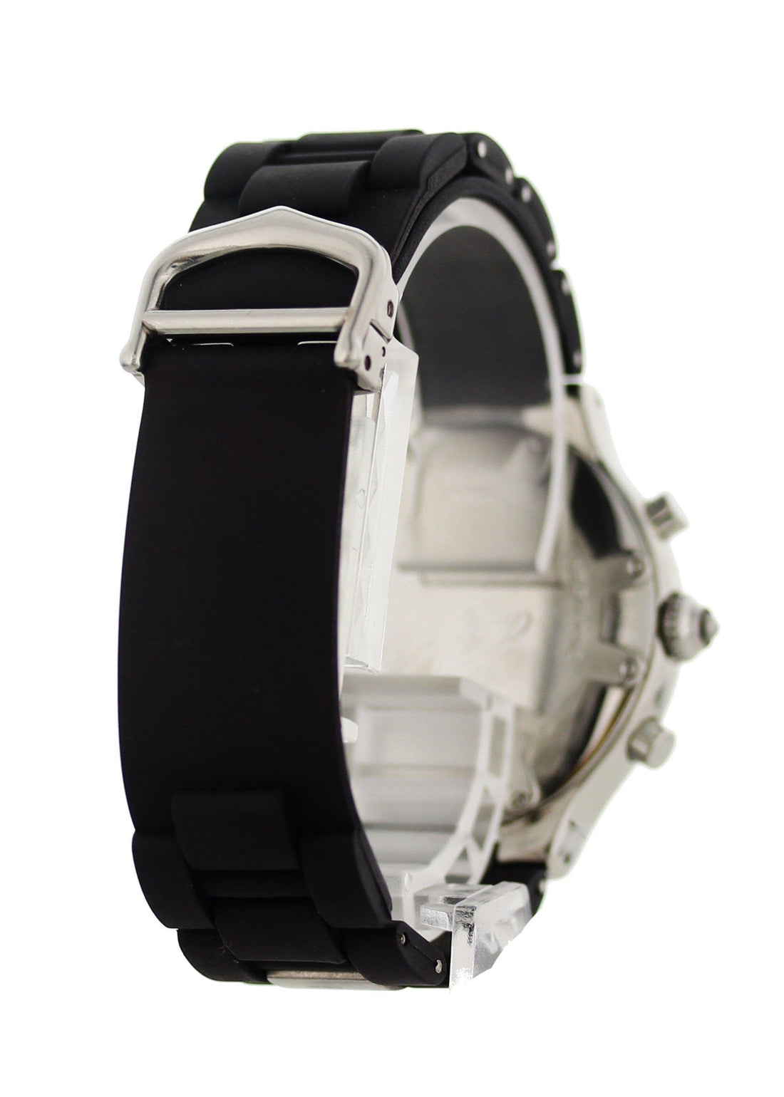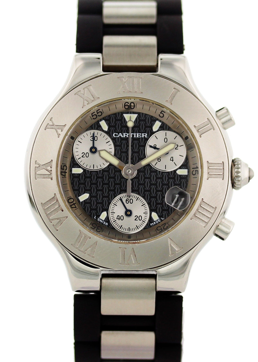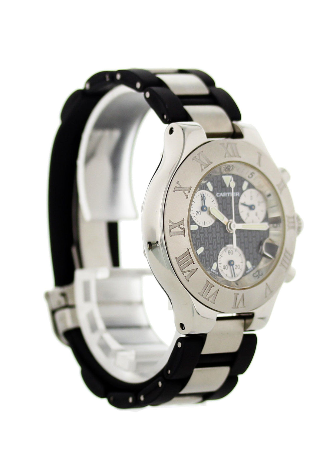Men's Cartier Chronoscaph 21. Reference 2424. Stainless Steel 38mm case. Stainless Steel bezel with Roman numerals. Black dial with date aperture at 4 o'clock, luminous hands and markers. Sapphire crystal glass. Rubber and steel strap will fit up to an 6.75- inch wrist. Quartz battery movement.