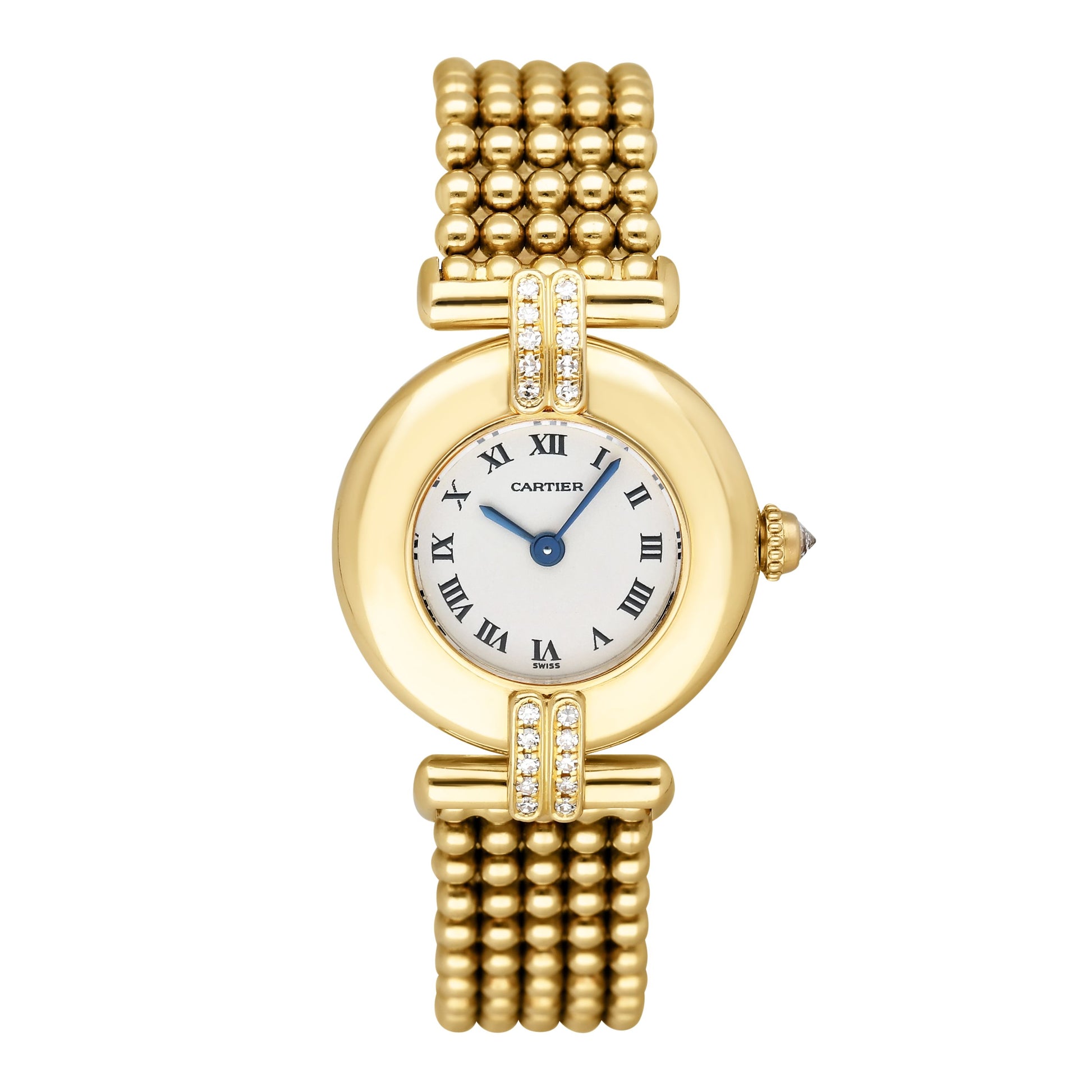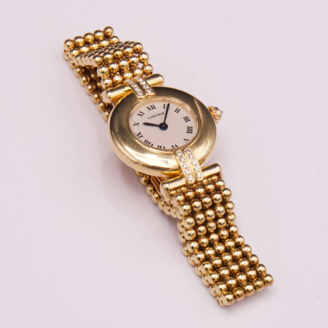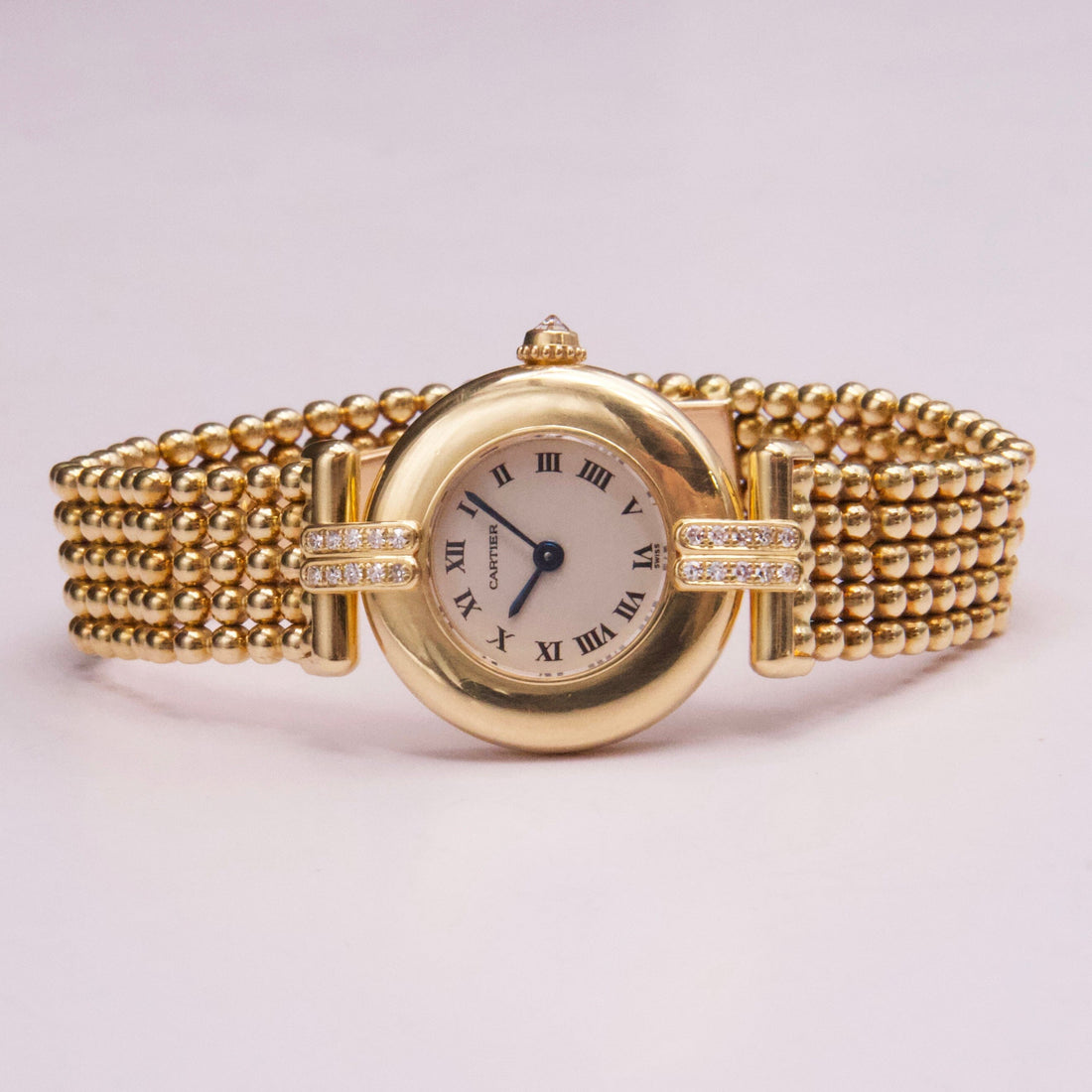 Cartier COLISÉE WB1019A8 / 1980 Ladies Watch. 24mm 18K yellow gold case with factory diamond. Off-White dial with blue hands and Roman numeral hour markers. 18k yellow gold bracelet with hidden fold over clasp. Will fit up to a 6-inch wrist. Sapphire crystal. 18K yellow gold case back. Quartz: battery powered movement.