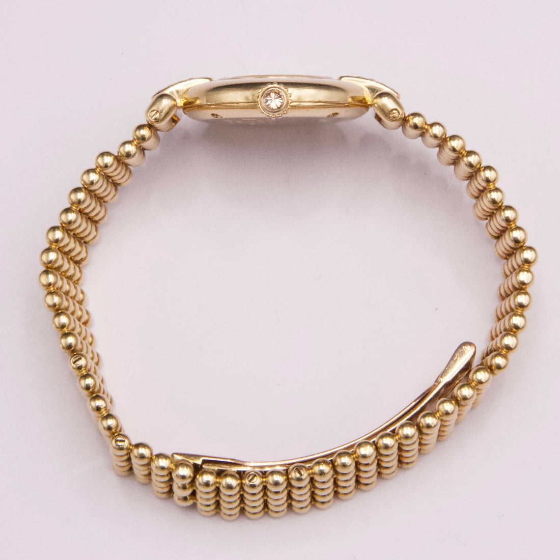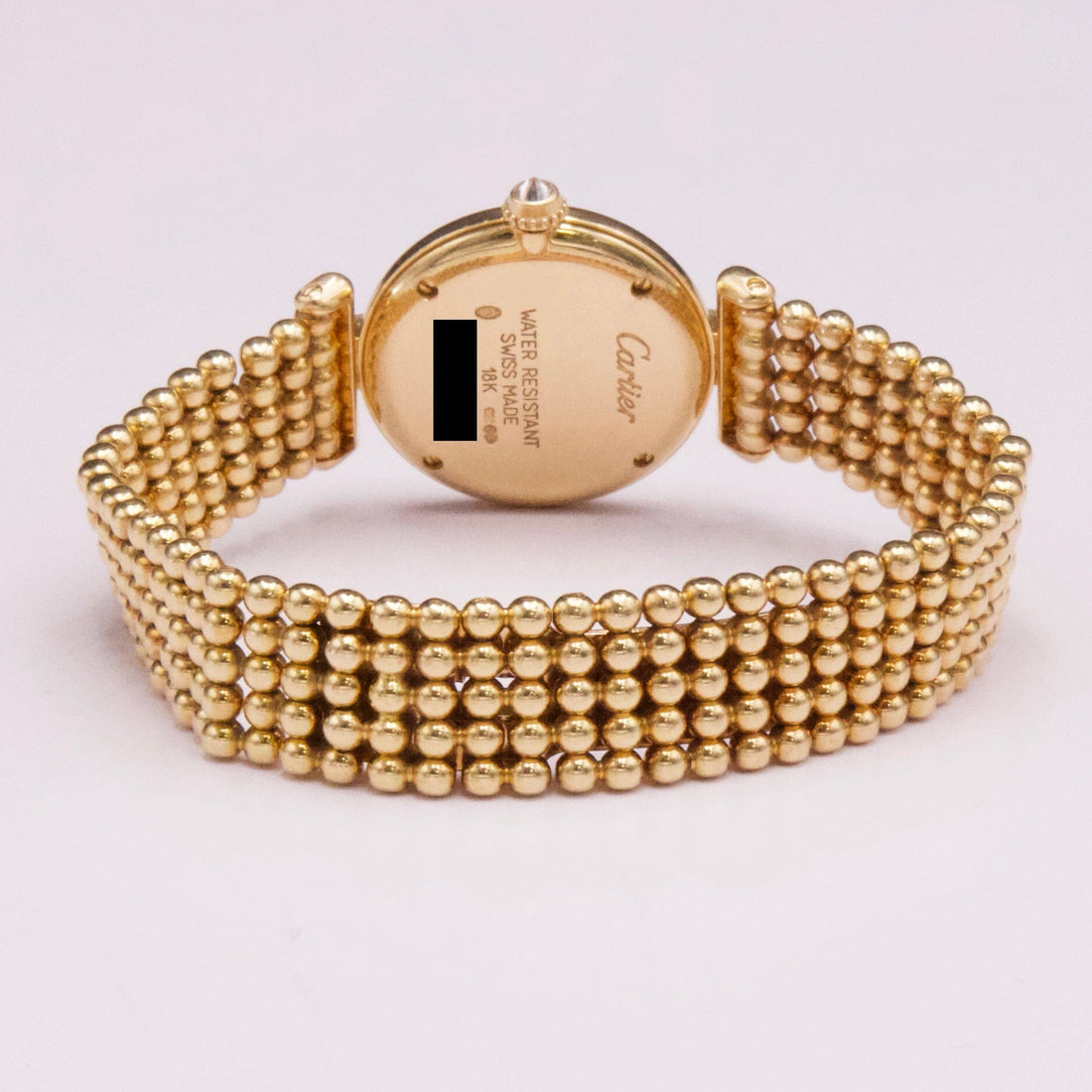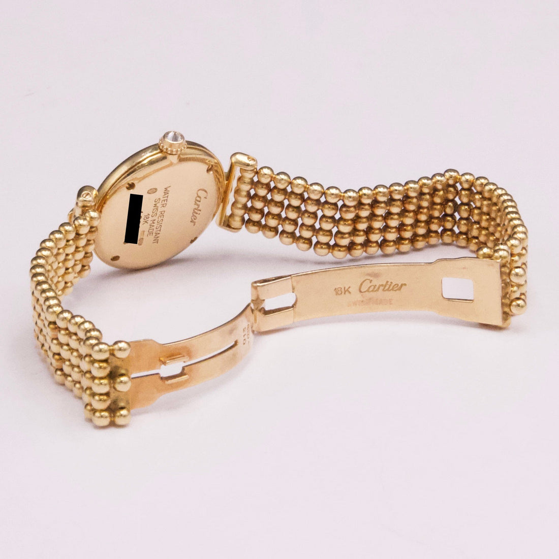 Cartier COLISÉE WB1019A8 / 1980 Ladies Watch. 24mm 18K yellow gold case with factory diamond. Off-White dial with blue hands and Roman numeral hour markers. 18k yellow gold bracelet with hidden fold over clasp. Will fit up to a 6-inch wrist. Sapphire crystal. 18K yellow gold case back. Quartz: battery powered movement.