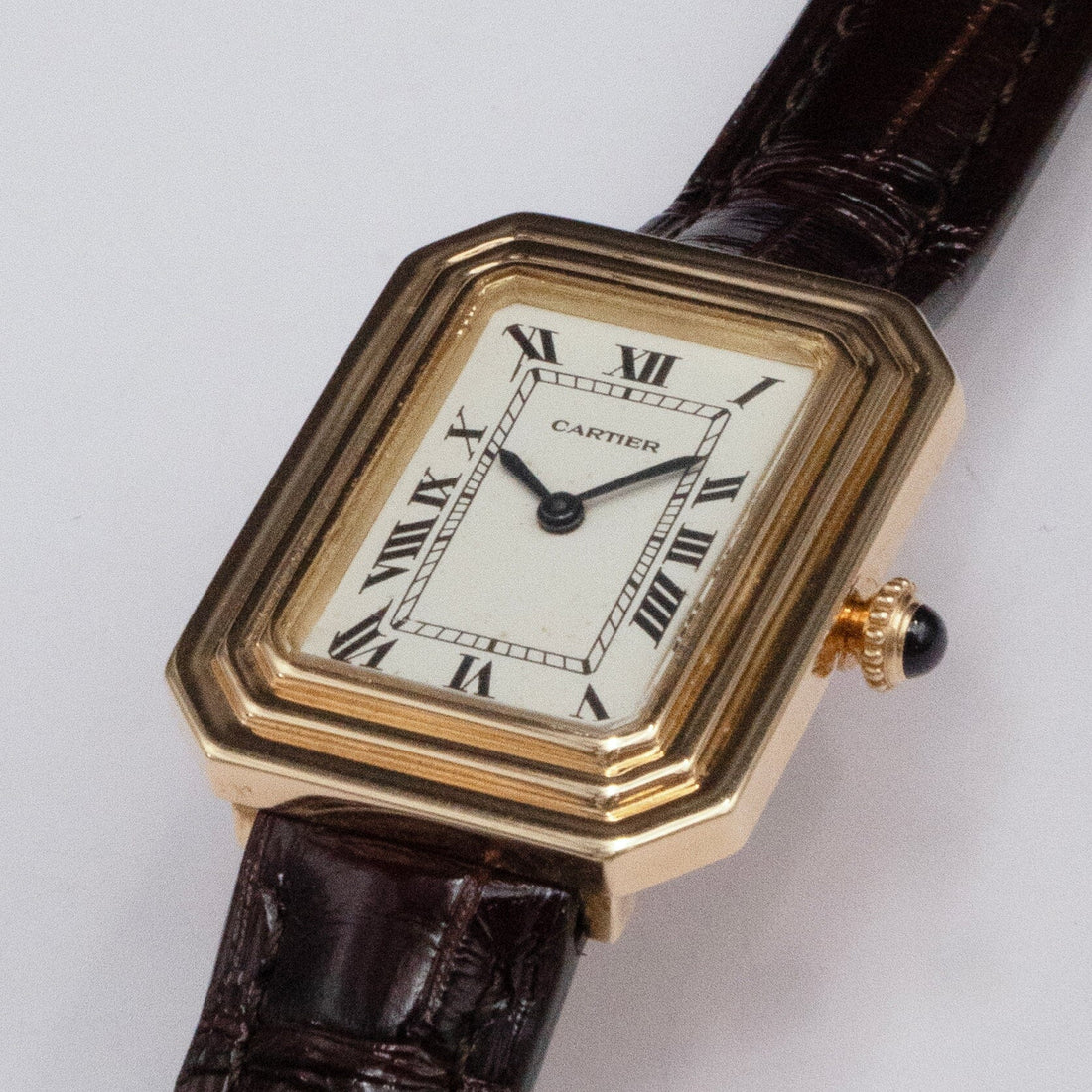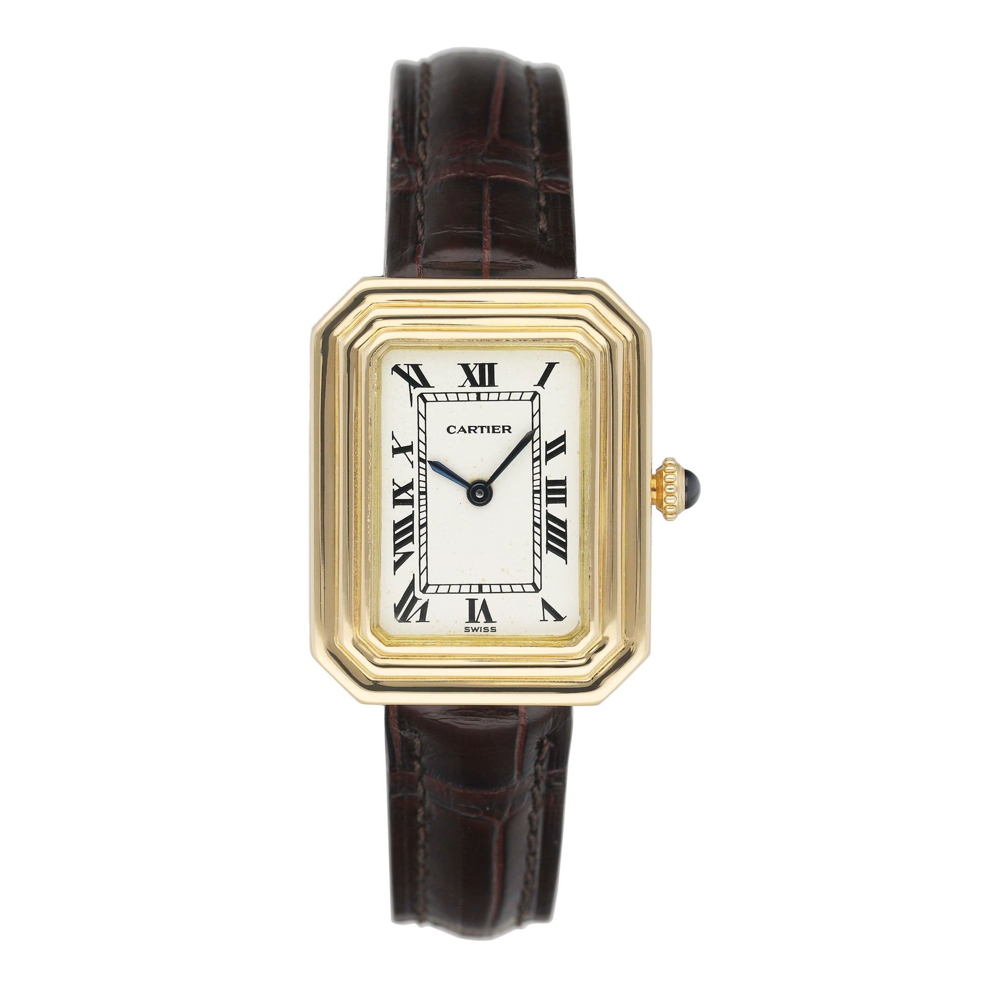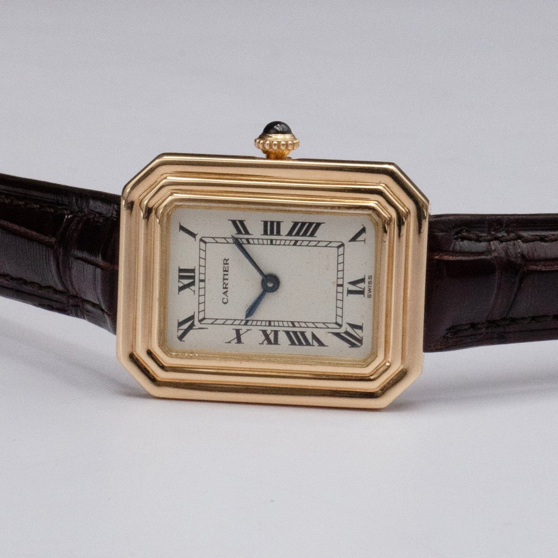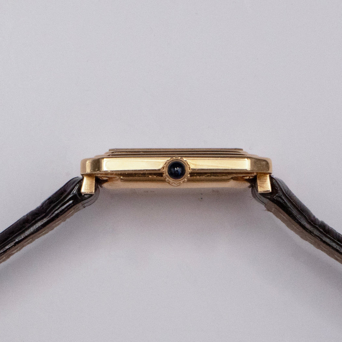 Cartier Cristallor Tank 78095 Mens Watch. 24mm 18K yellow gold case. White "Paris" lacquered dial with blue hands and black Roman numerals hour marker. Minute marker in the inner dial. Brown Aftermarket leather strap with 18K yellow gold buckle. Will fit up to a 6-inch wrist. Acrylic crystal. 18K yellow gold case back. Mechanical hand-winding movement. This watch comes with original Box and Papers.