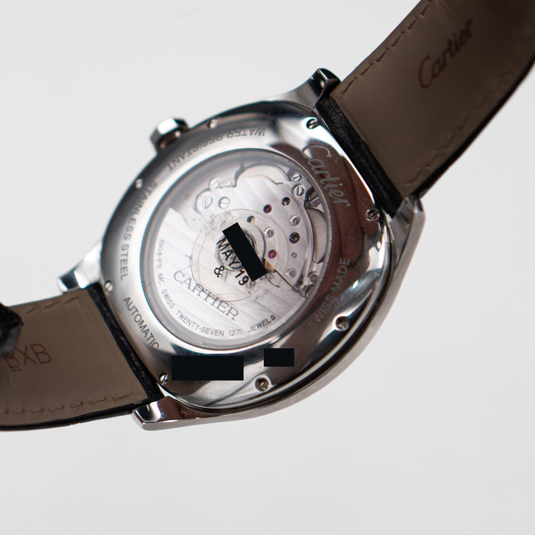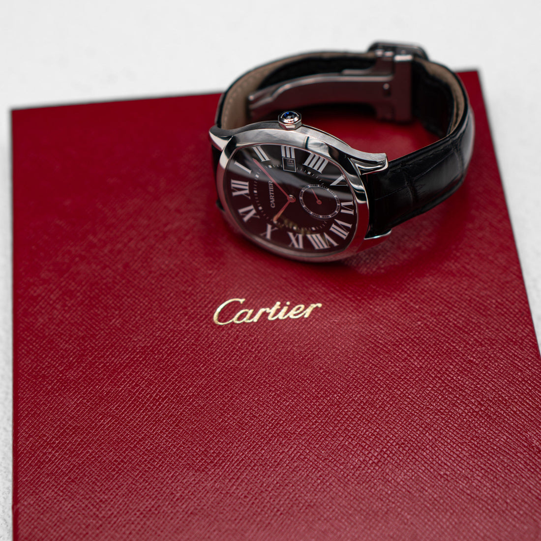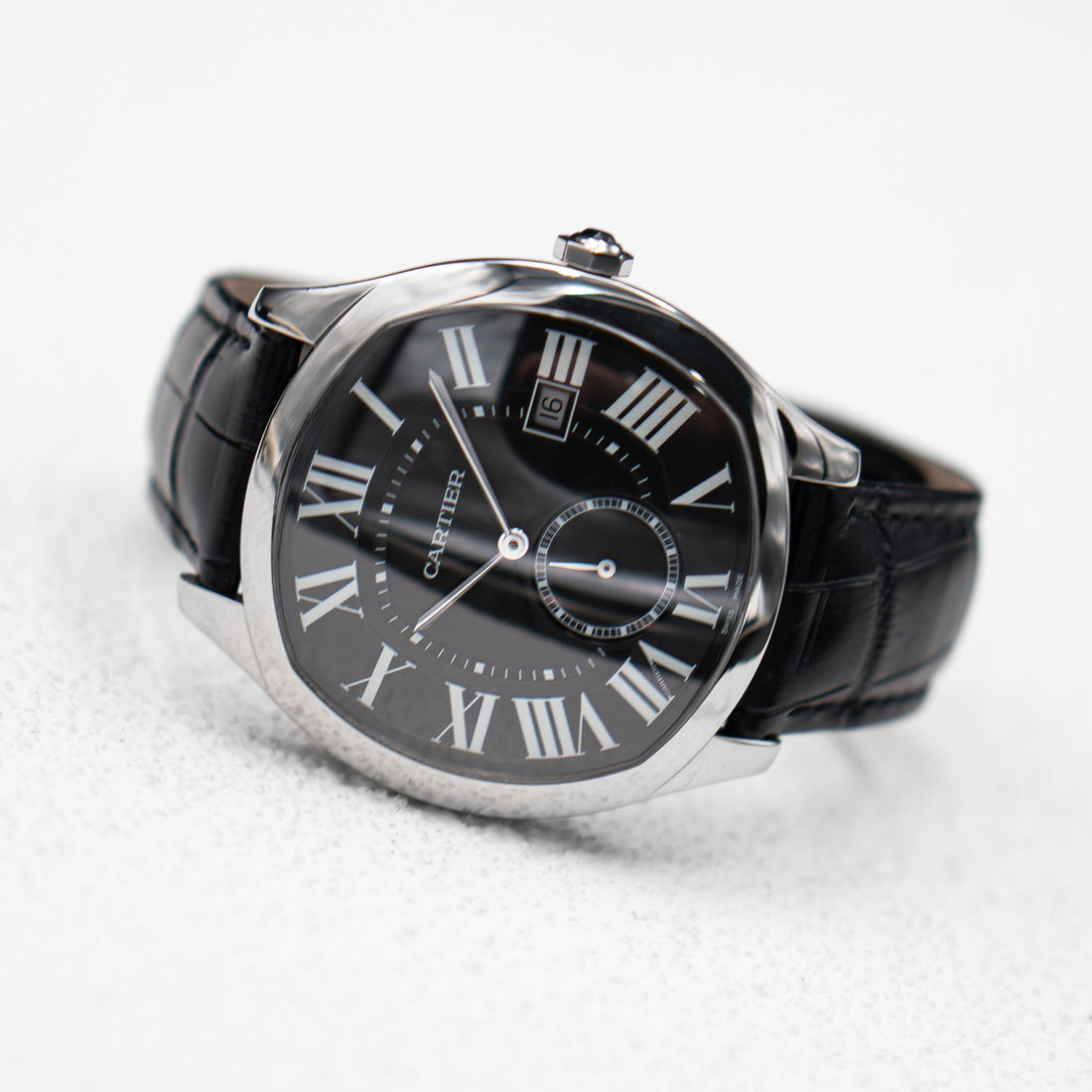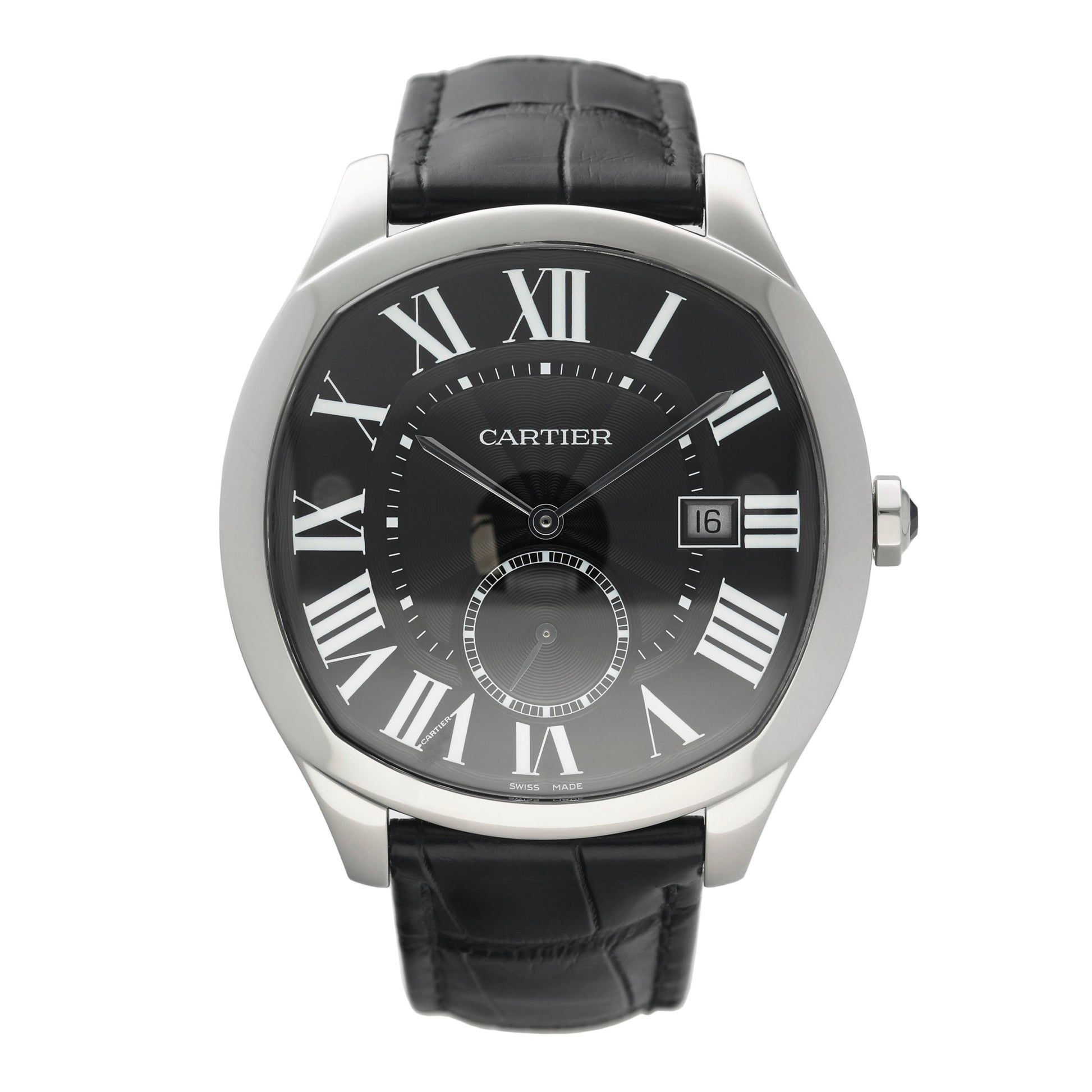 Cartier Drive De Cartier WSNM0009 Mens Watch. 41.00mm stainless steel case. stainless steel bezel. Black dial and roman numeral hour markers. Date Indicator. Small Second. Black leather strap with stainless steel deployment clasp. Will fit up to 6.50-inch wrist. Sapphire crystal. Transparent sapphire crystal case back. Automatic movement. Original Box & Papers.