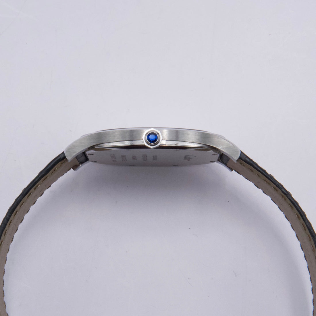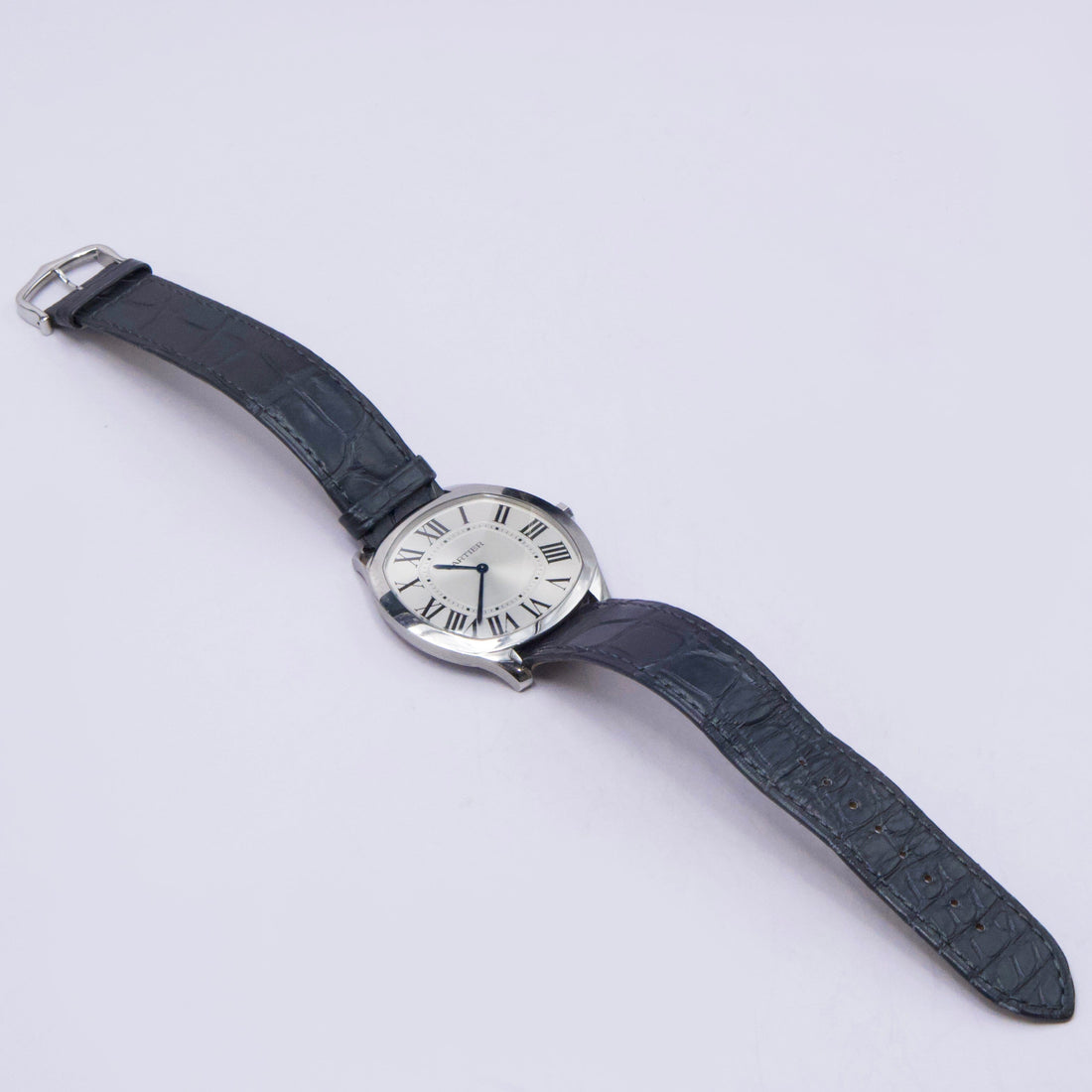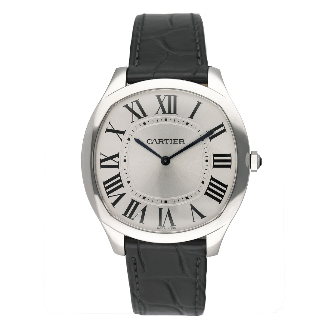 Cartier Drive De Cartier WSNM0011 Mens Watch. 39mm stainless steel case. Stainless steel bezel. Silver dial with blue steel hands and Roman numeral hour markers. Minute markers at inner dial. Grey leather strap with stainless steel buckle. Will fit up to a 7.5-inch wrist. Sapphire crystal. Mechanical hand-winding movement. This watch comes with original Box and Papers.