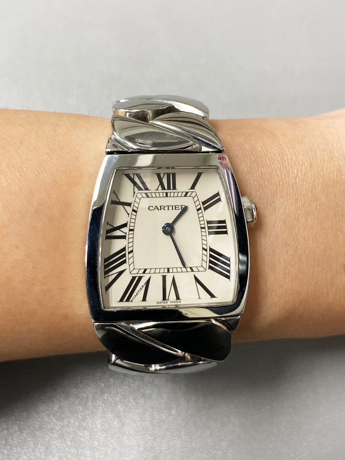 Cartier La Dona W6600221 Ladies Watch. 28mm (at the widest point) Stainless Steel case. Stainless Steel bezel. White dial with blue steel hands and Roman numeral hour markers. Minute markers on the inner dial. Stainless Steel Bracelet with stainless steel hidden Butterfly Clasp. Will fit up to a 6.25-inch wrist. Sapphire Crystal, Stainless steel case back. Quartz movement.