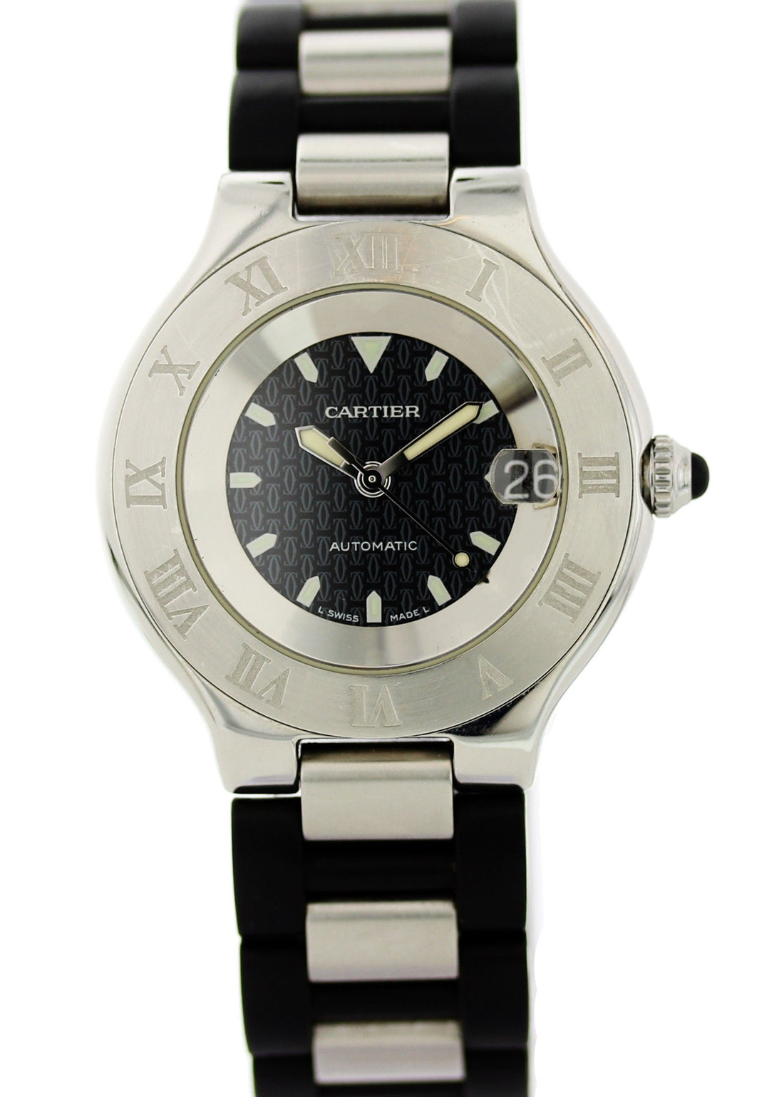 Cartier Must 21 Autoscaph 2427 Unisex Watch. 35mm stainless steel case. Stainless steel bezel engraved with roman numeral hour markers. Black dial with luminous hands and indexes. Date display at the three O'clock position. Rubber and stainless steel strap. Will fit up to a 7 inch wrist. This watch is backed by our two year warranty.