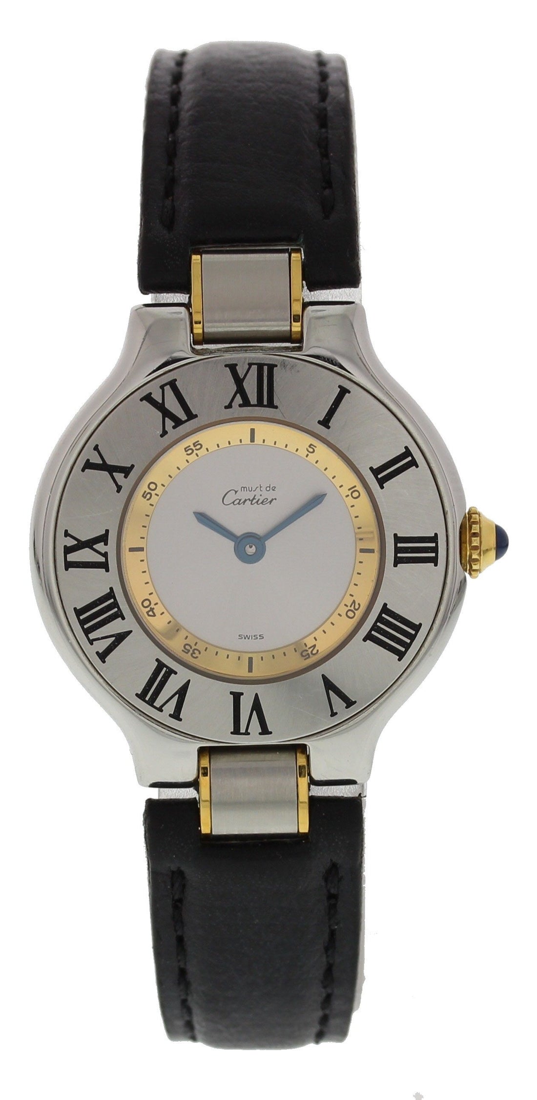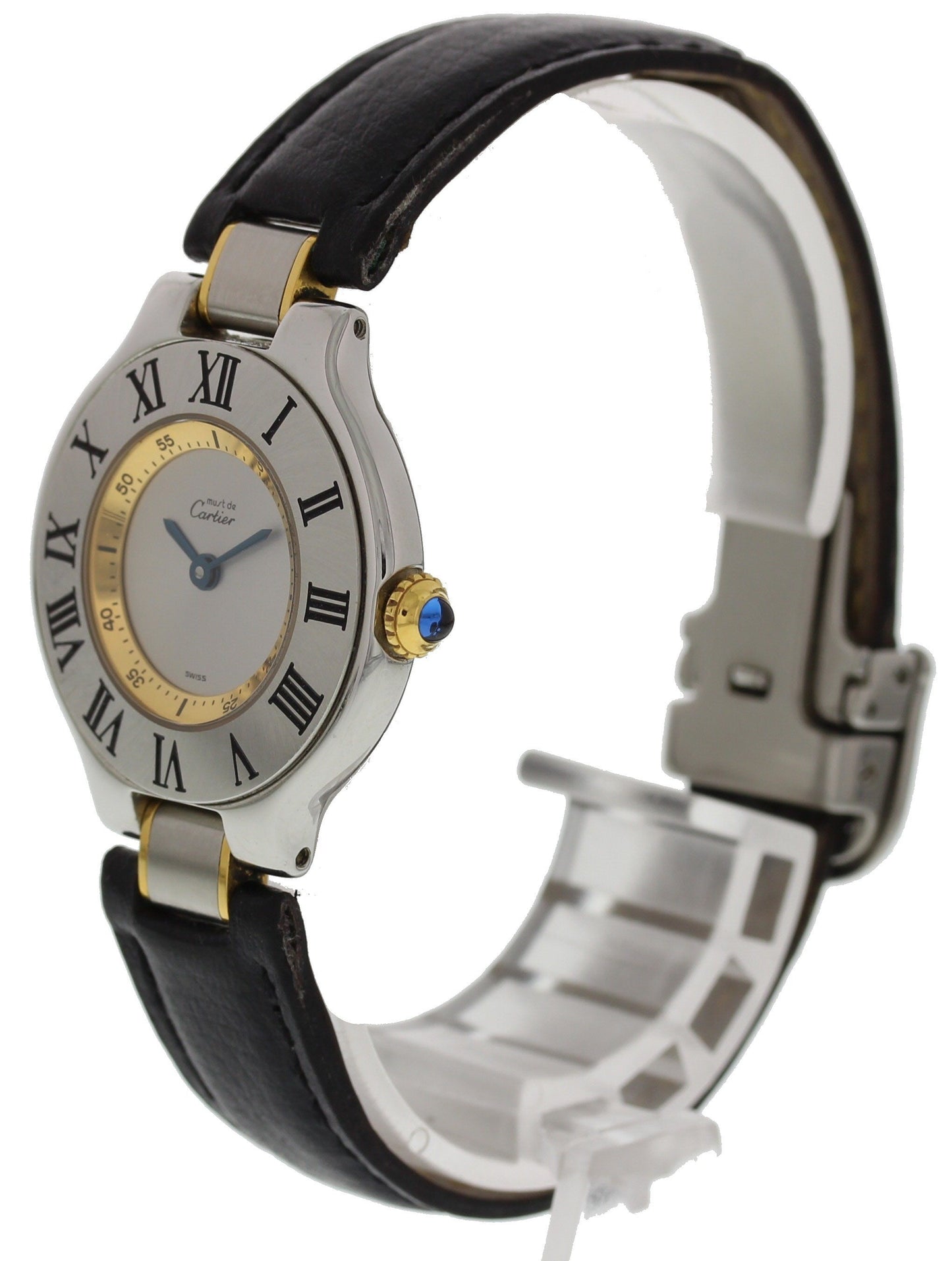 Cartier Must 21 SS/18K YG 1340. 28 mm stainless steel case. Stainless steel bezel with black Roman numeral markers. Silver dial with blue hands and yellow gold markers. Blue sapphire cabochon crown. Black calfskin leather band with a stainless steel deployment clasp. Will fit up to a 6 inch wrist. Quartz battery movement. Sapphire crystal glass. This watch is backed by our two year warranty.