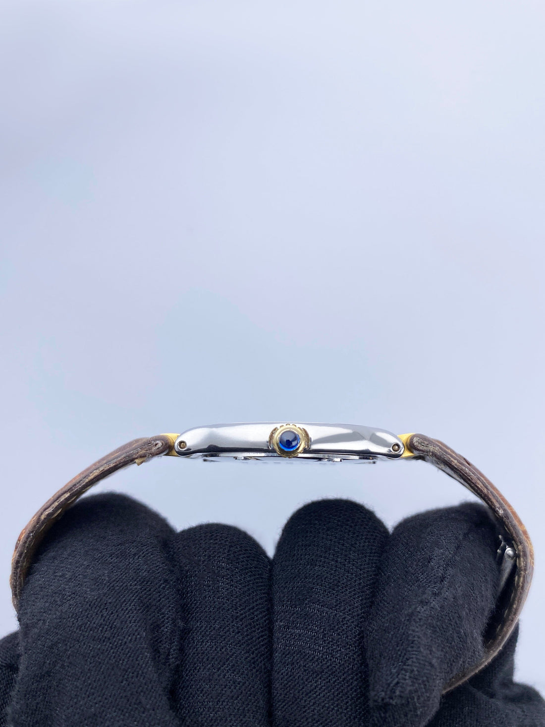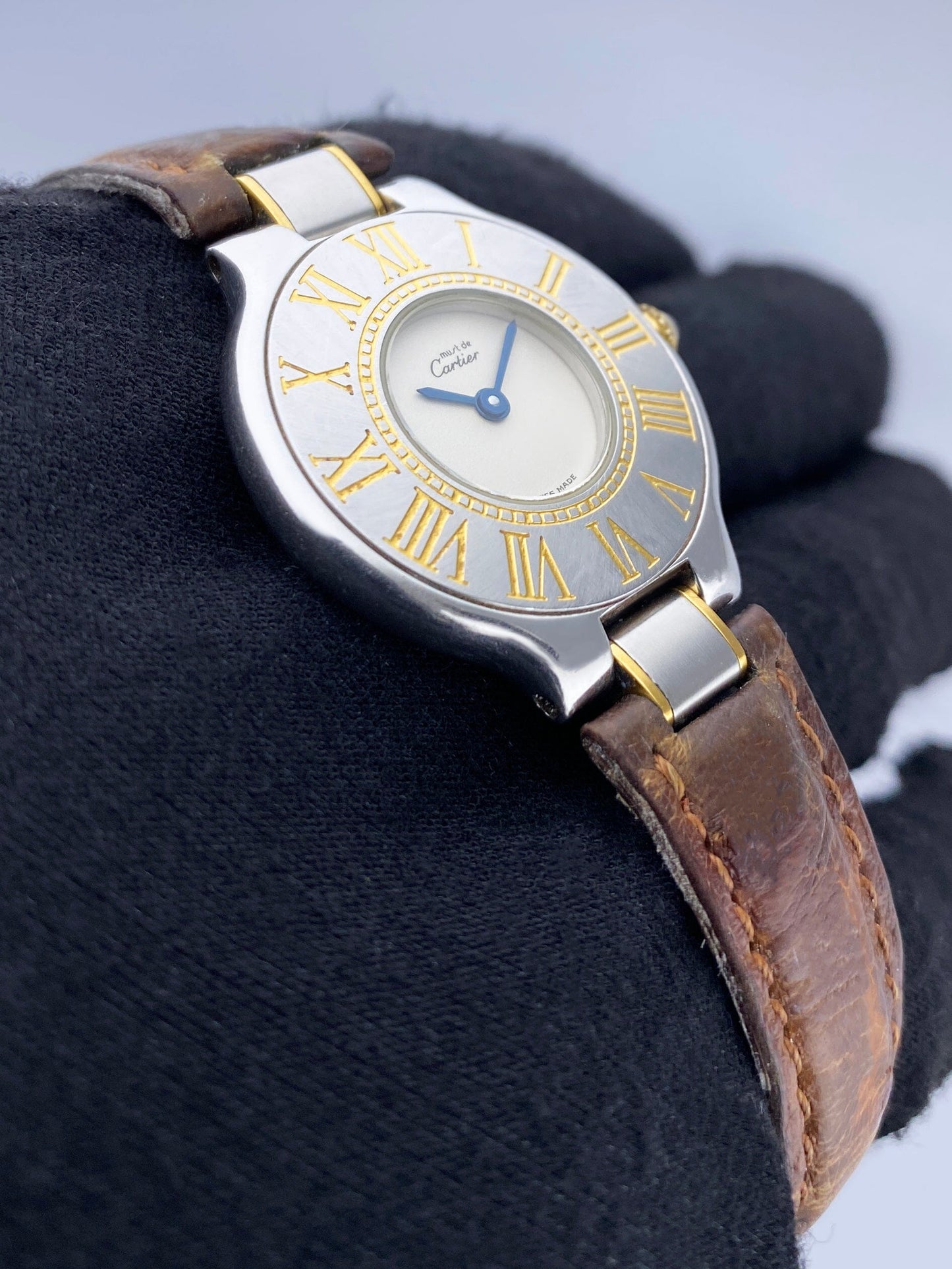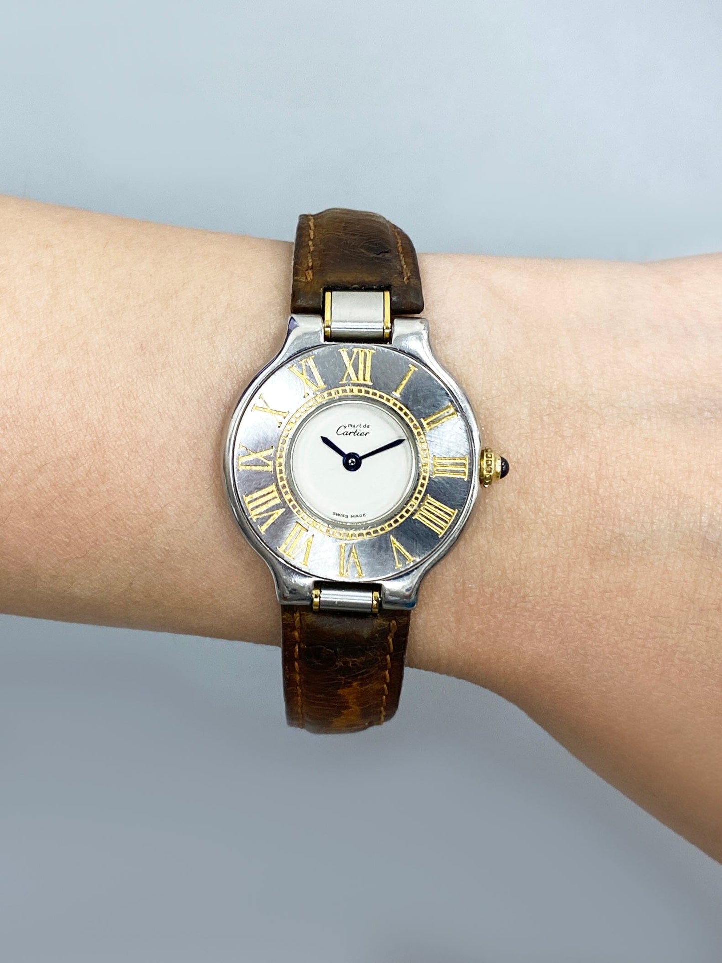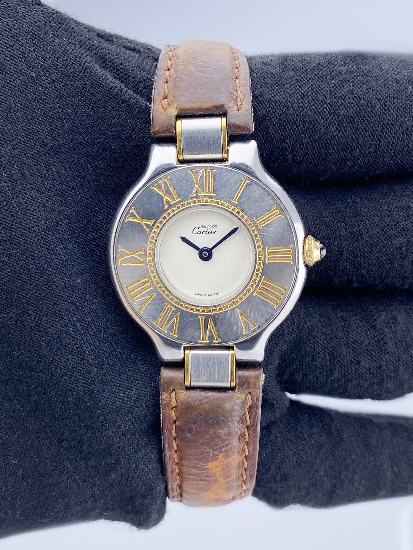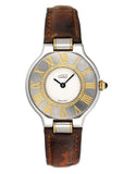 Cartier Must 21 W1005120 Ladies Watch. 28mm stainless steel case. Stainless steel bezel with engraving Roman numeral hour makers. Off-White dial with blue steel hands. Brown leather strap with deployment clasp. Will fit up to a 6.25-inch wrist. Sapphire crystal. Stainless steel case back. Quartz: Battery powered movement.