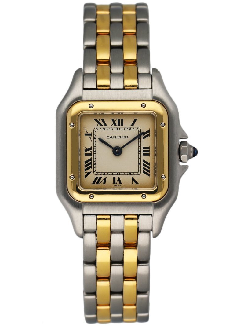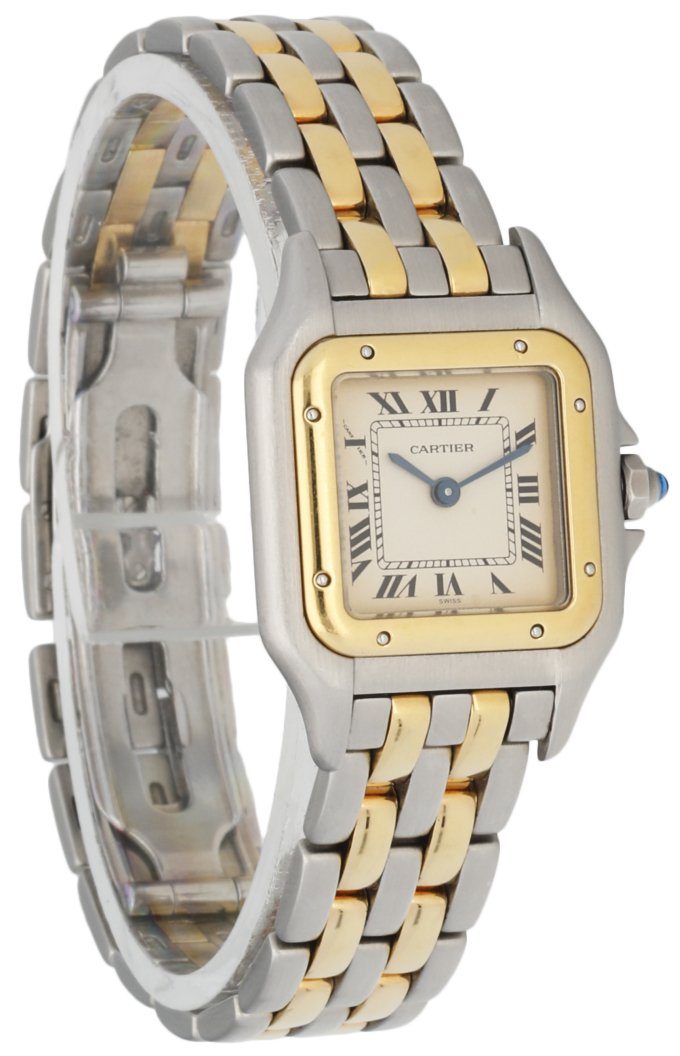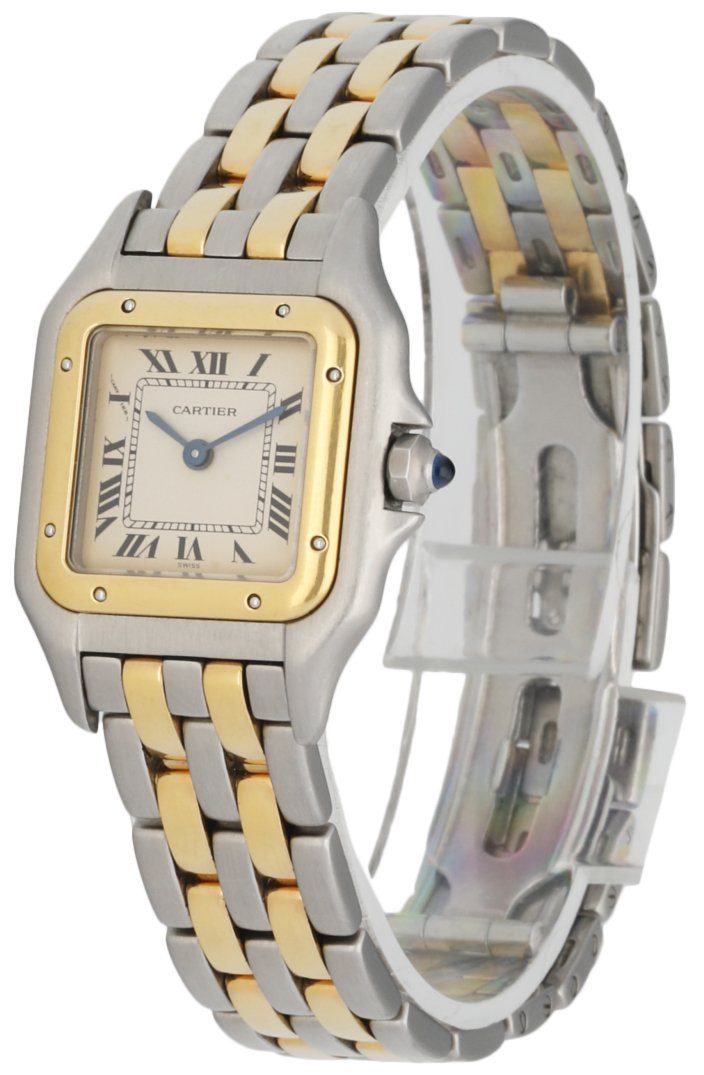 Cartier Panthere 1057917 Ladies Watch. 22mm Stainless Steel case. 18K Yellow Gold smooth bezel. Off-White dial with blue steel hands and Roman numeral hour markers.