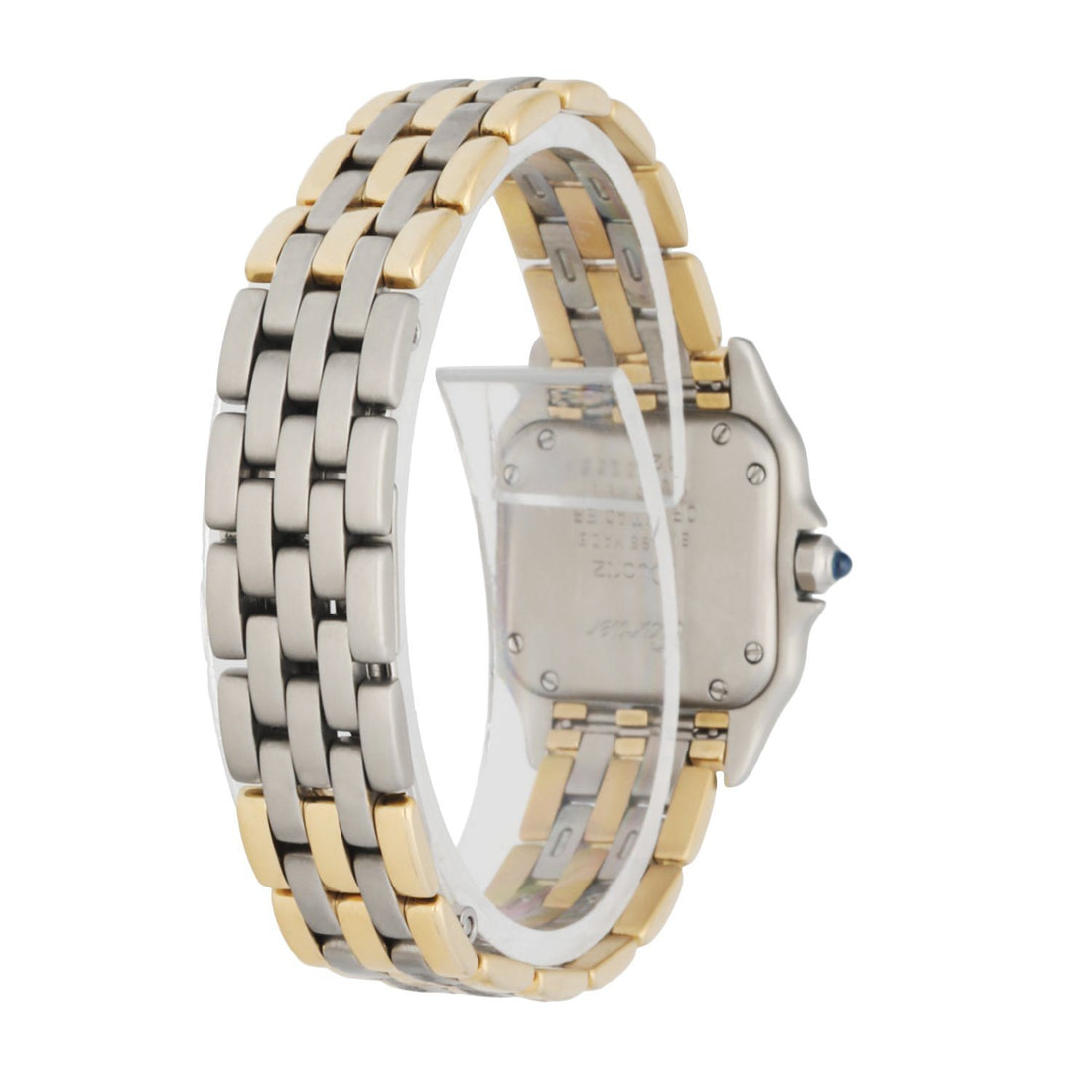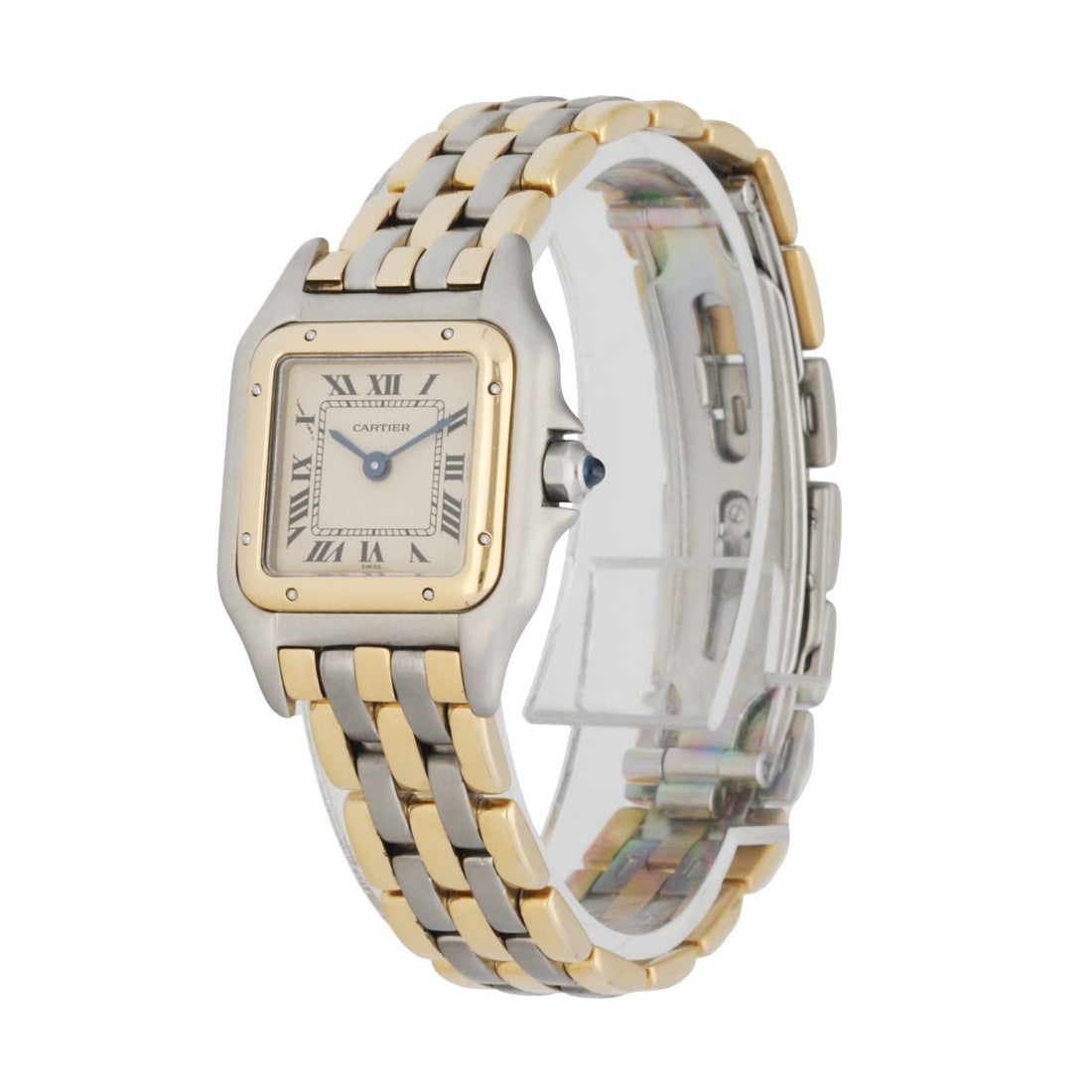 Cartier Panthere 1057917 Ladies Watch. 22mm Stainless Steel case. 18K Yellow Gold smooth bezel. Off-White dial with blue steel hands and Roman numeral hour markers. Minute markers on the inner dial. Two tone, stainless steel & 18k yellow gold, bracelet with stainless steel Hidden Butterfly Clasp. Will fit up to a 6-inch wrist. Sapphire Crystal, Stainless steel case back. Quartz: Battery powered movement.