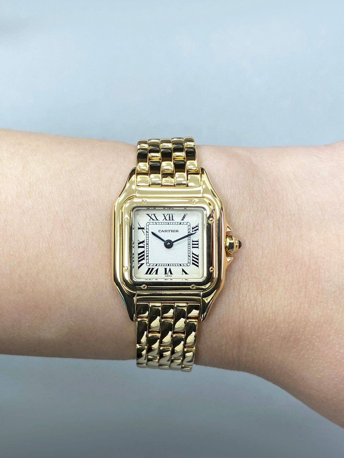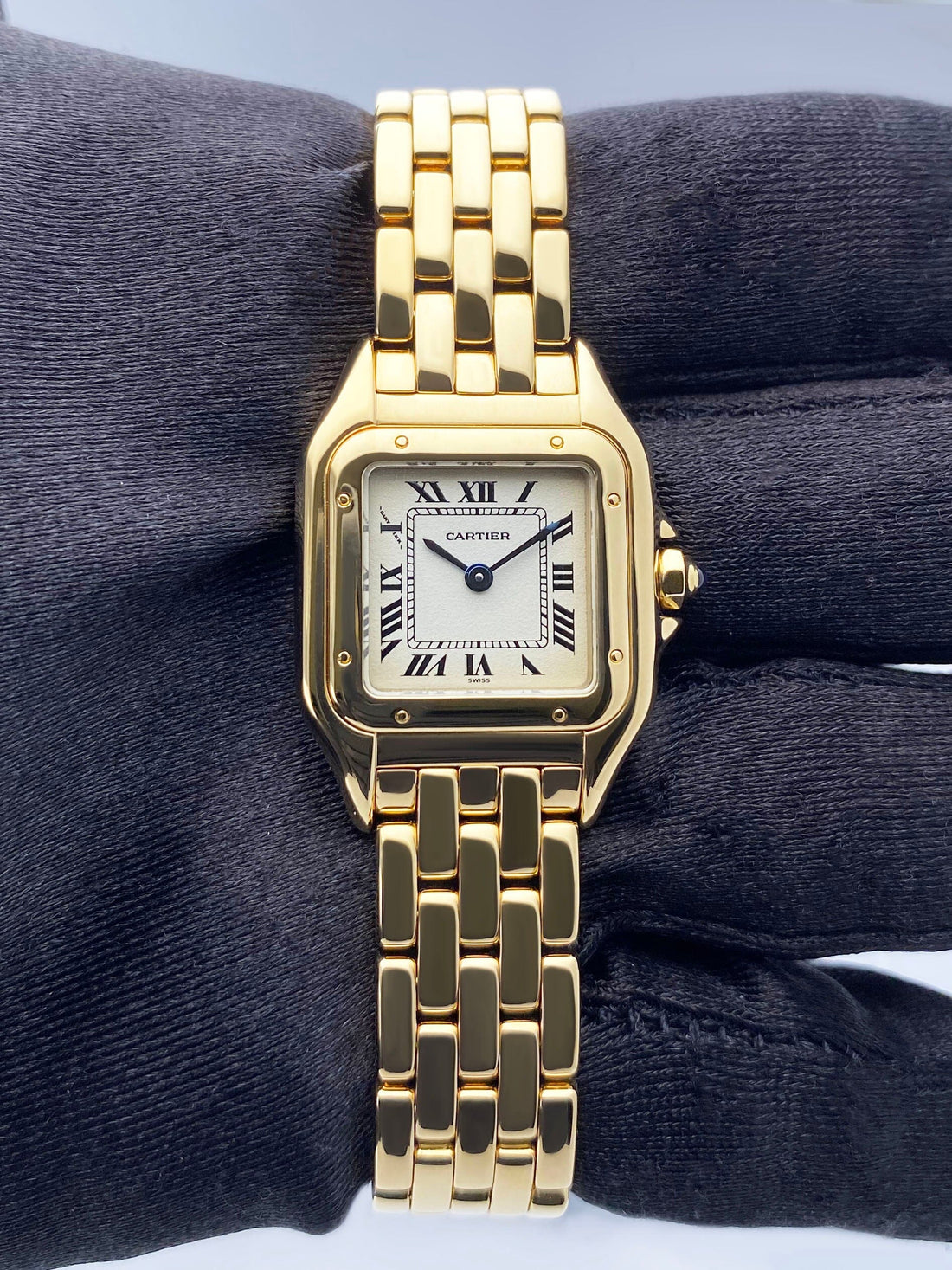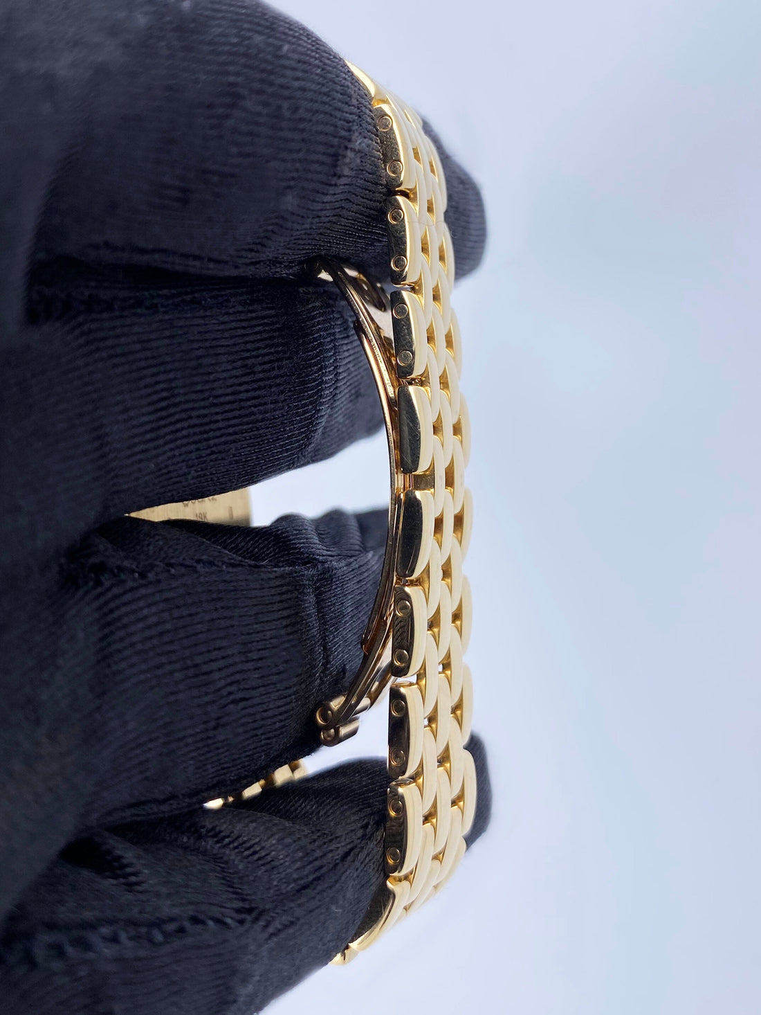 Cartier Panthere W25022B9 Ladies Watch. 22mm 18K yellow gold case. 18K yellow gold smooth bezel. Off-white dial with blue steel hands and Roman numeral hour markers. Minute markers on the inner dial. 18K yellow gold bracelet with hidden butterfly clasp. Will fit up to a 6-inch wrist. Sapphire crystal. 18K yellow gold case back. Quartz: battery powered movement.