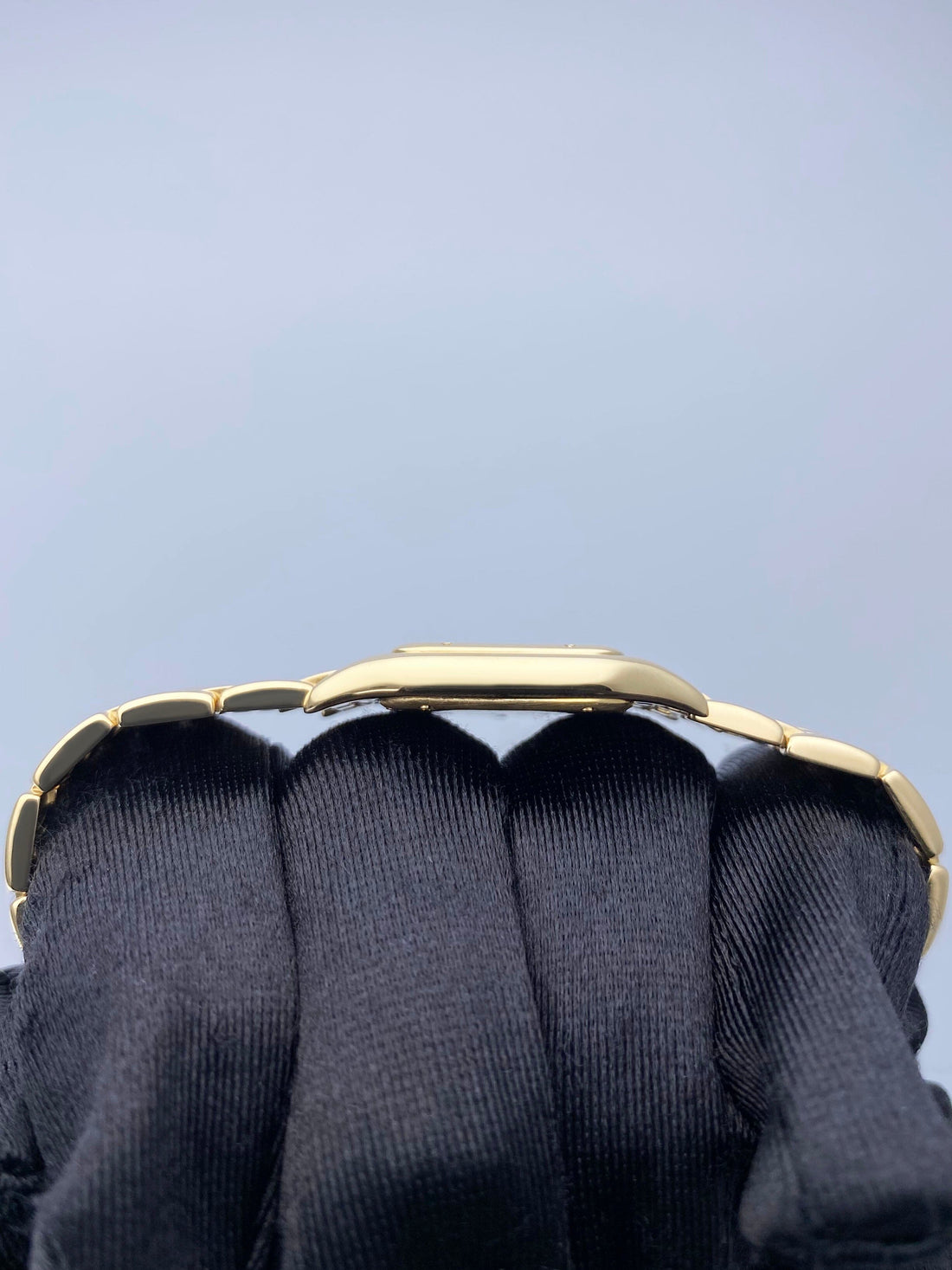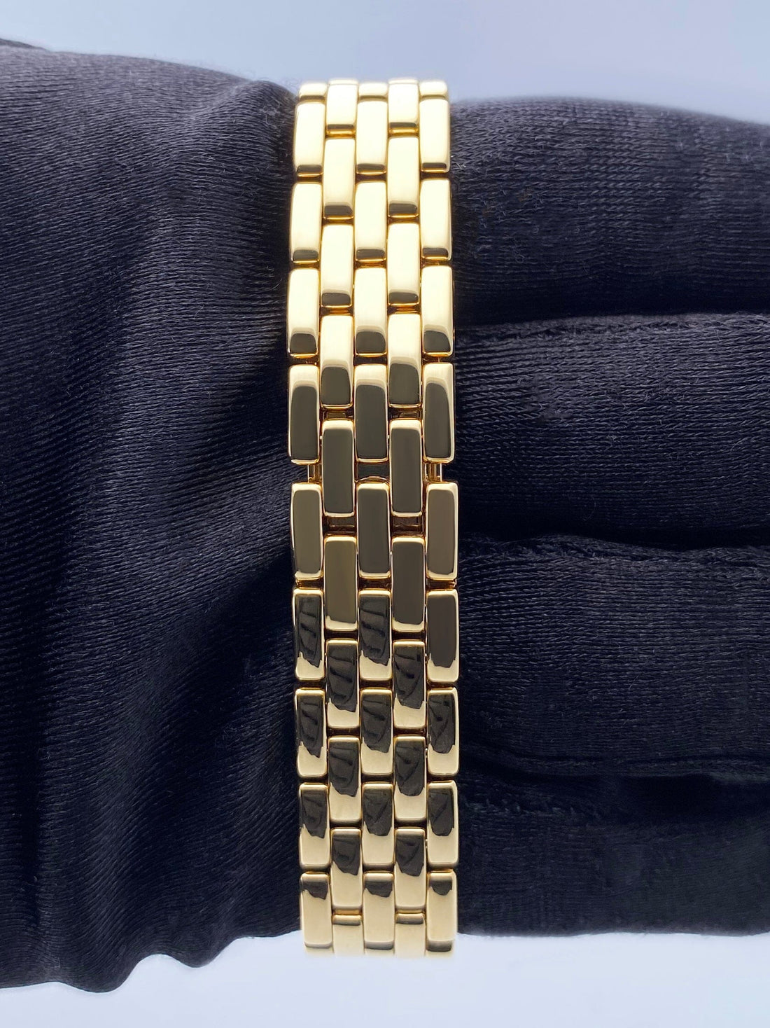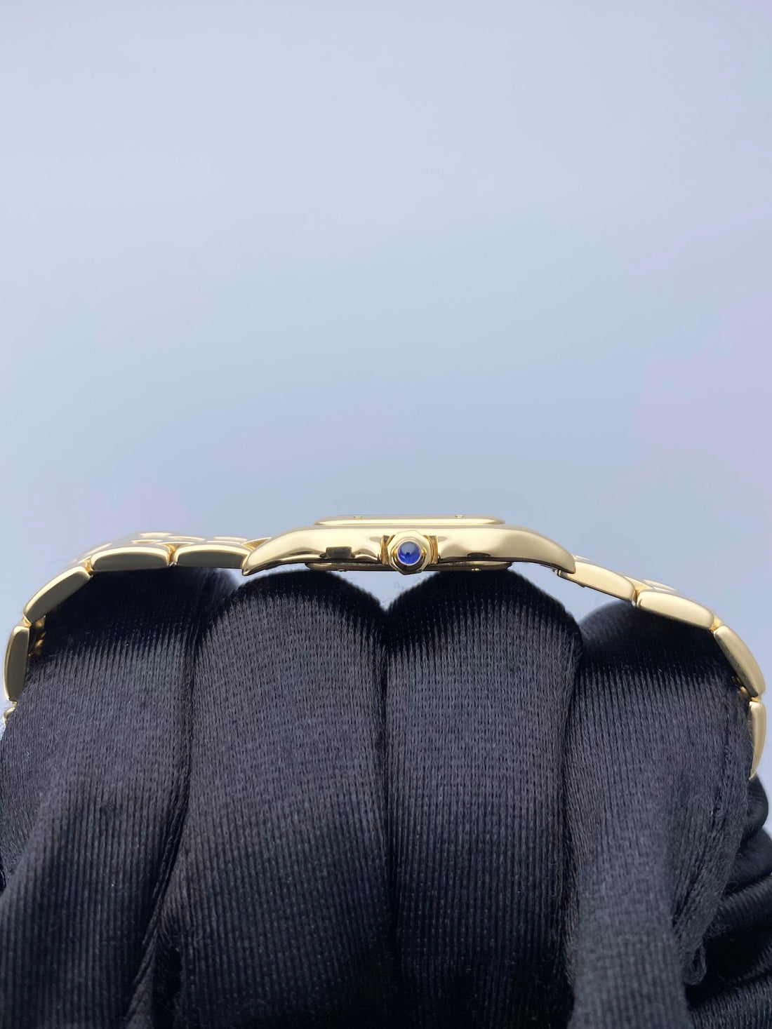 Cartier Panthere W25022B9 Ladies Watch. 22mm 18K yellow gold case. 18K yellow gold smooth bezel. Off-white dial with blue steel hands and Roman numeral hour markers. Minute markers on the inner dial. 18K yellow gold bracelet with hidden butterfly clasp. Will fit up to a 6-inch wrist. Sapphire crystal. 18K yellow gold case back. Quartz: battery powered movement.