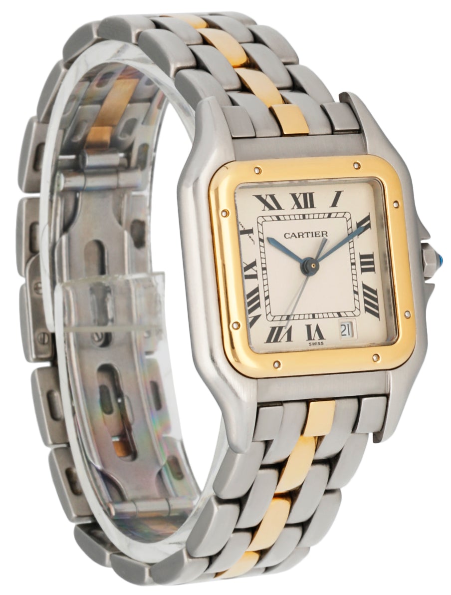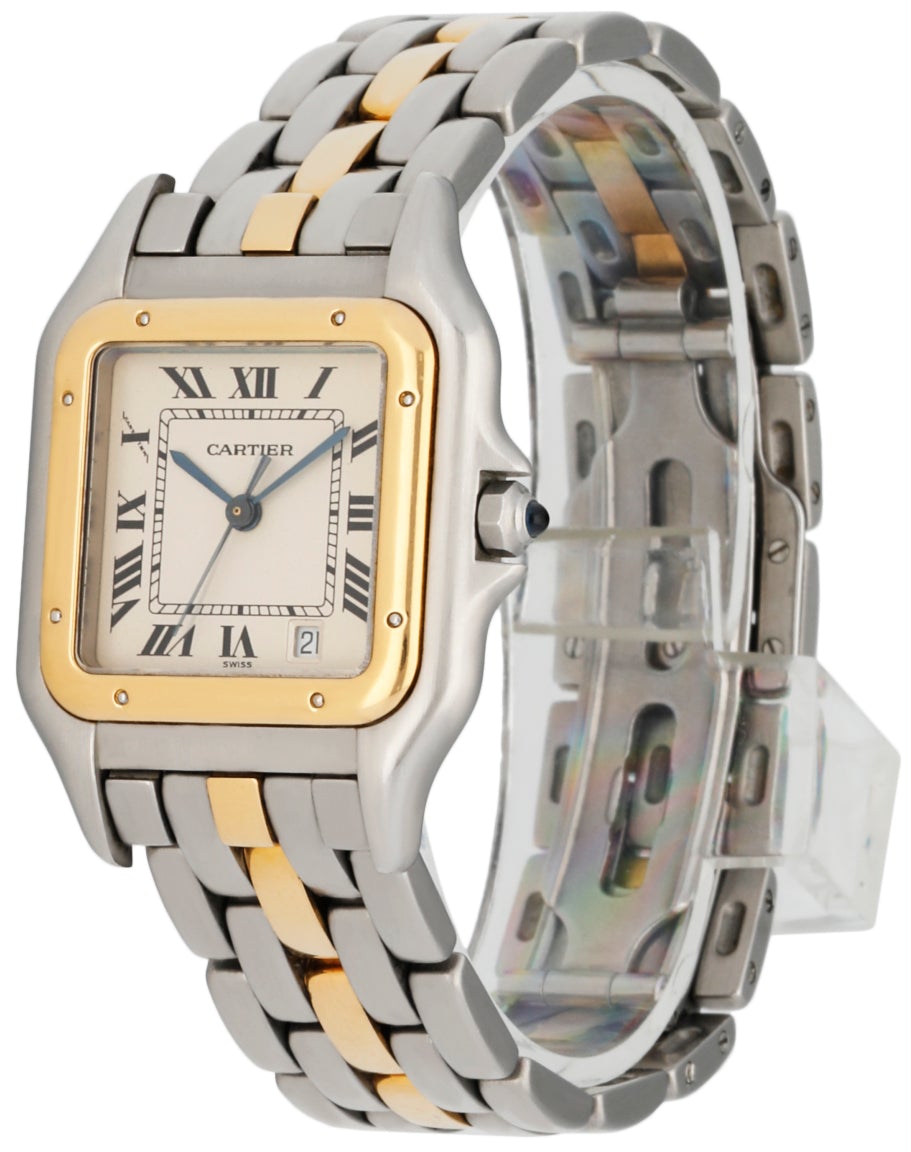 Cartier Panthere 1100 Midsize Ladies Watch. 27mm stainless steel case with a 18K yellow gold bezel. Off-White dial with blue steel hands and black Roman numerals hour markers. Date display at the 5 o'clock position. Two-tone stainless steel and one row 18k yellow gold bracelet with stainless steel hidden butterfly clasp. Will fit up to a 6.5-inch wrist. Quartz battery powered movement. Sapphire crystal, solid case back.