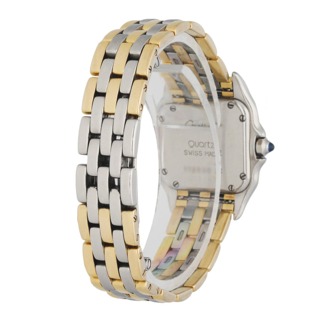 Cartier Panthere 112000R Ladies Watch. 23mm Stainless Steel case. 18K Yellow Gold fixt bezel. Off-White dial with Blue steel hands and black Roman numeral hour markers. Minute markers on the inner dial. Two-Tone Stainless Steel & 18K yellow gold Bracelet with Hidden Butterfly. Will fit up to a 6-inch wrist. Sapphire Crystal, Stainless steel case back. Quartz: Battery powered movement.