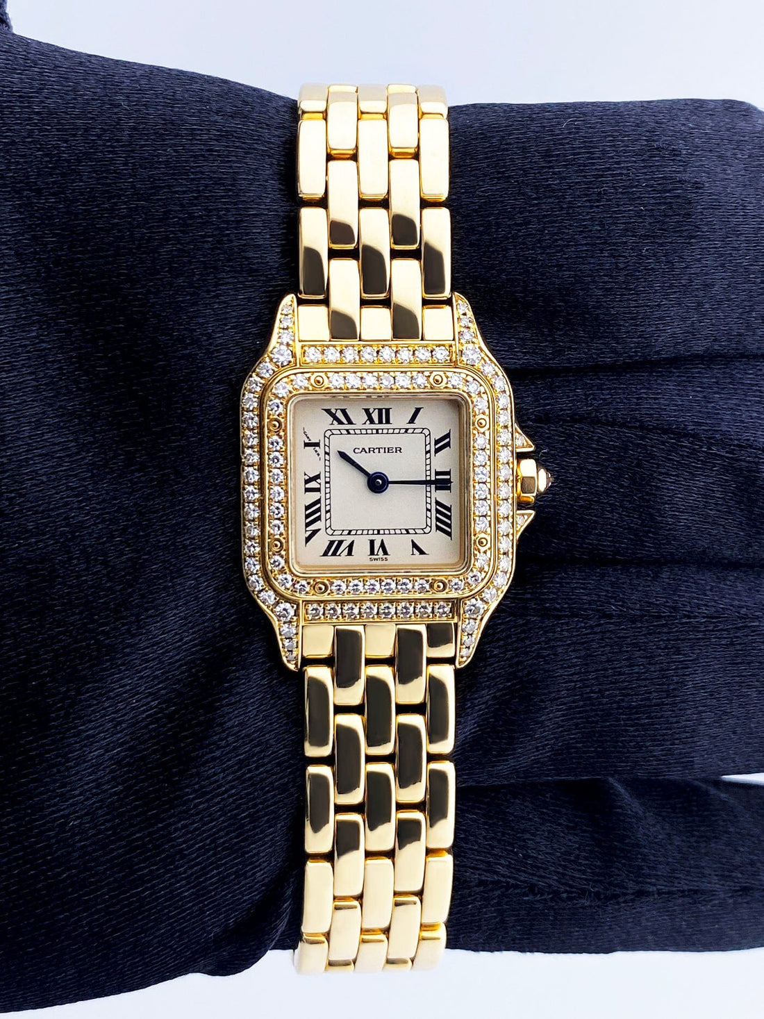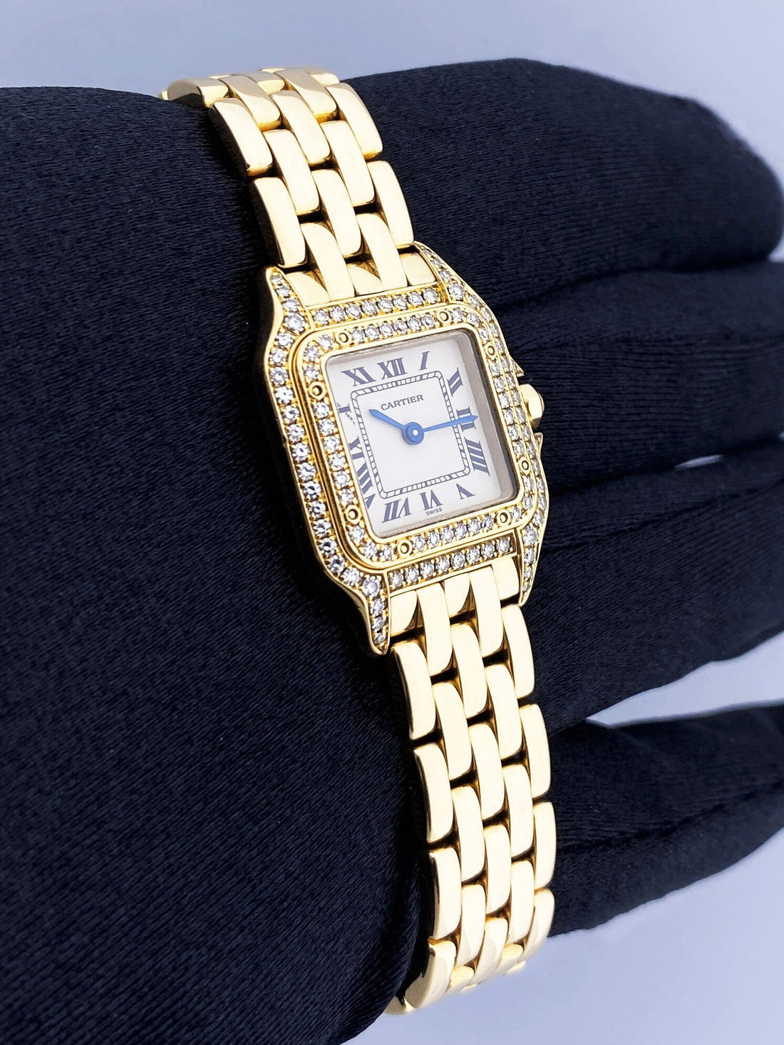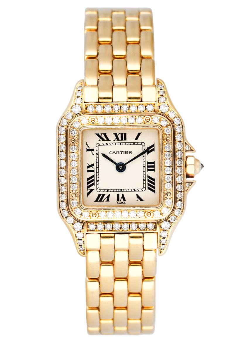 Cartier Panthere WF3229B9 / 1280 Ladies Watch. 22mm 18K yellow gold with original factory diamond set case. 18K yellow gold bezel with original factory diamond set. Off-white dial with black Roman numeral hour marker and blue hands. 18K yellow gold bracelet with hidden butterfly clasp. Will fit up to a 6-inch wrist. Sapphire crystal. 18K yellow gold case back. Quartz battery powered movement.
