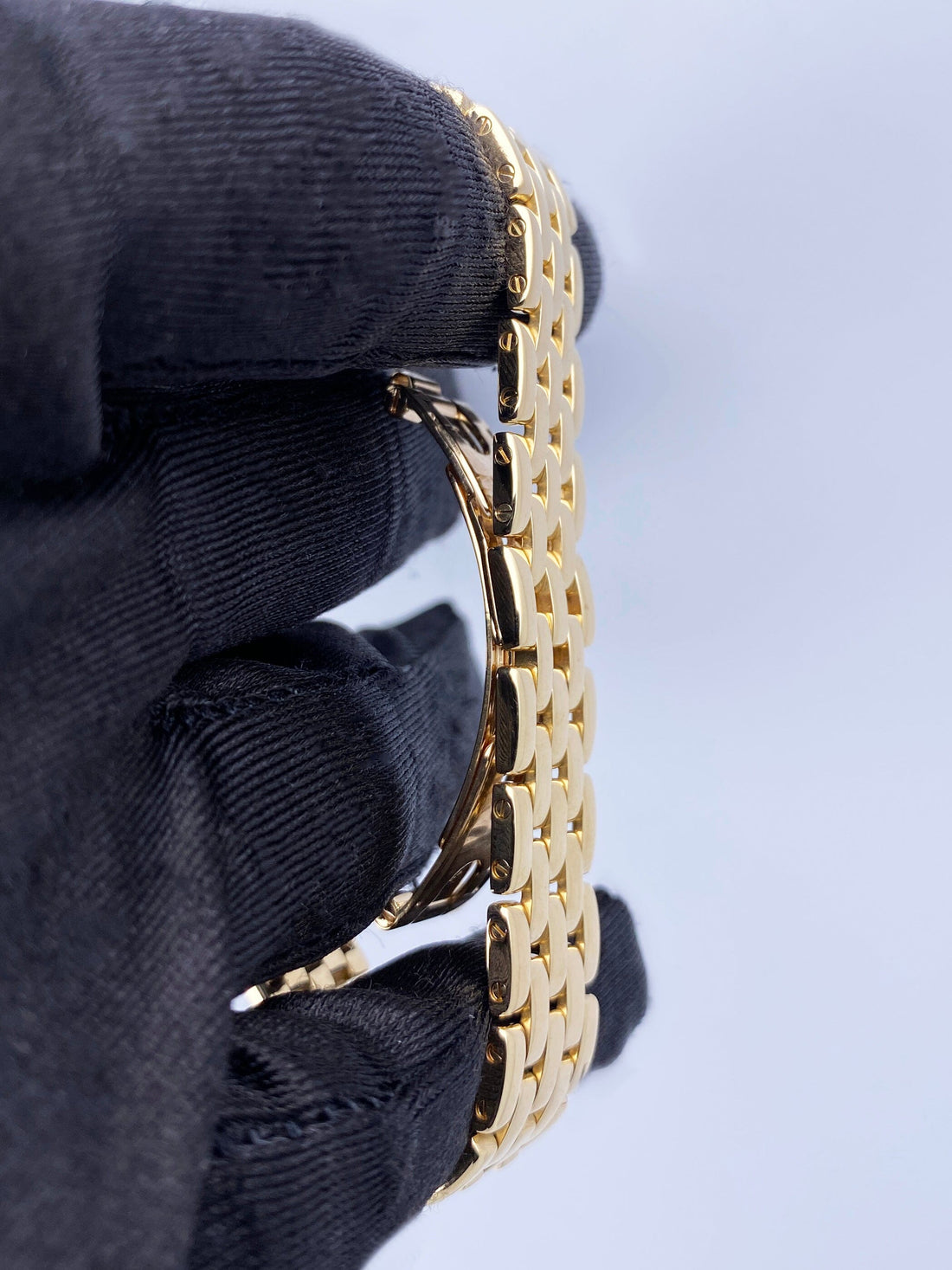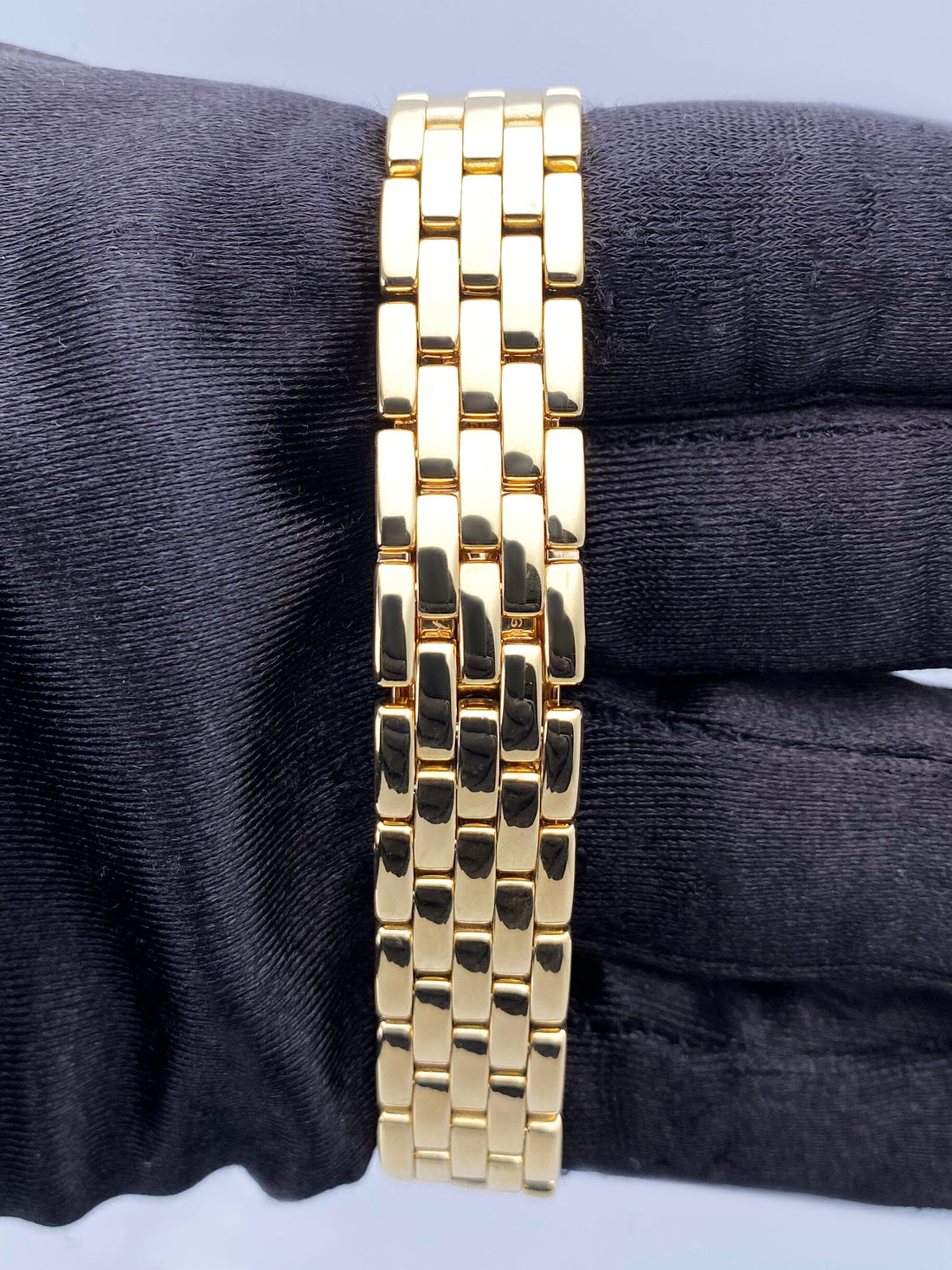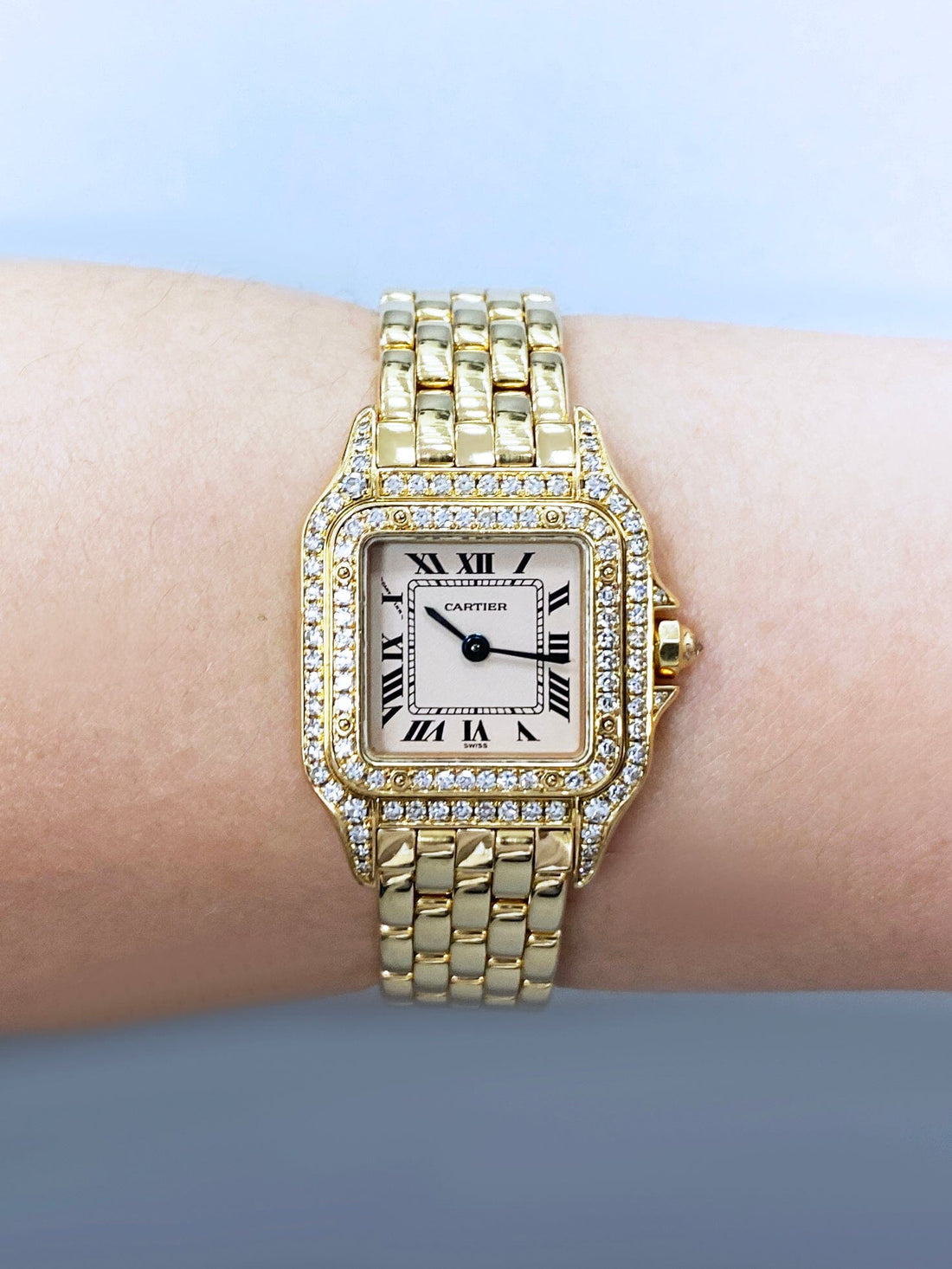 Cartier Panthere WF3229B9 / 1280 Ladies Watch. 22mm 18K yellow gold with original factory diamond set case. 18K yellow gold bezel with original factory diamond set. Off-white dial with black Roman numeral hour marker and blue hands. 18K yellow gold bracelet with hidden butterfly clasp. Will fit up to a 6-inch wrist. Sapphire crystal. 18K yellow gold case back. Quartz battery powered movement.