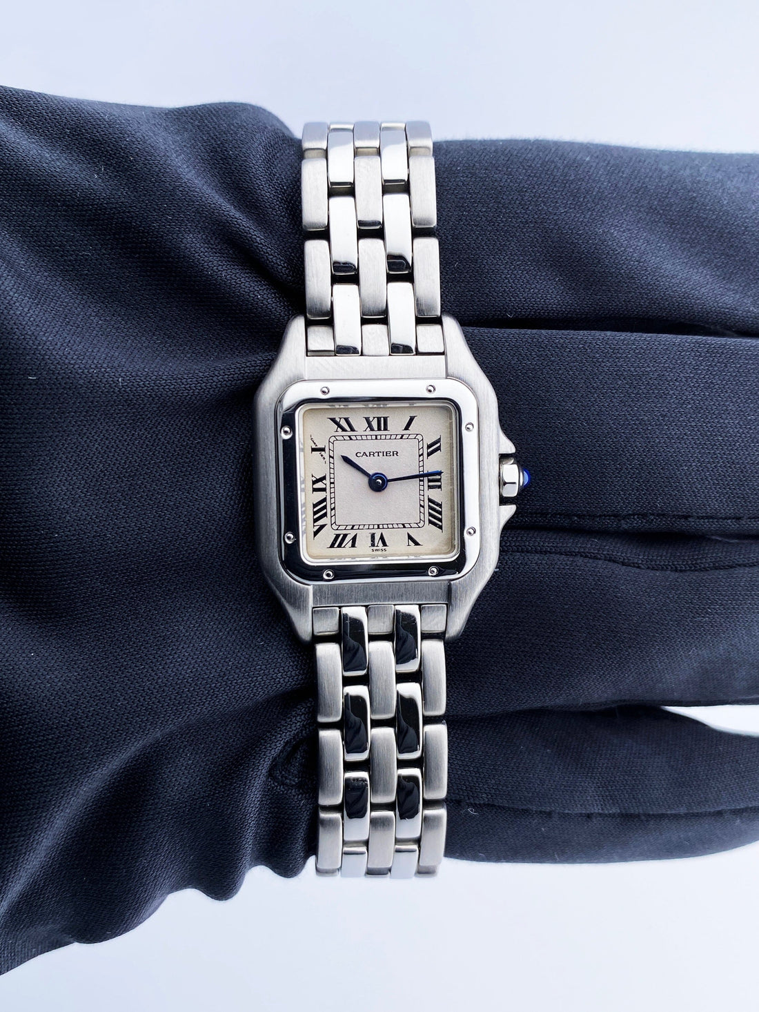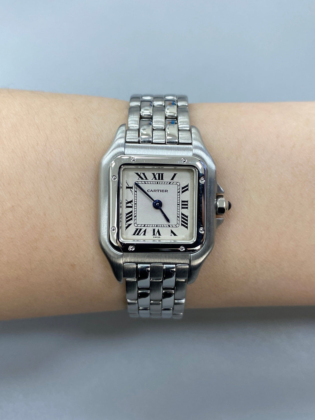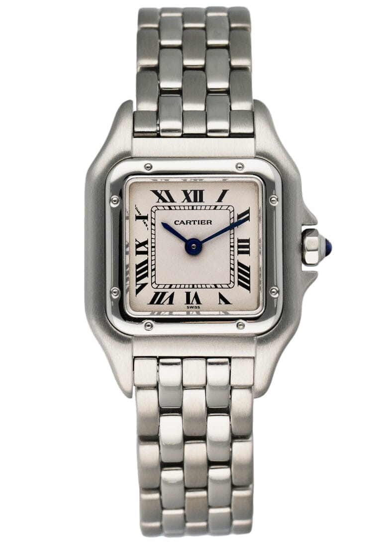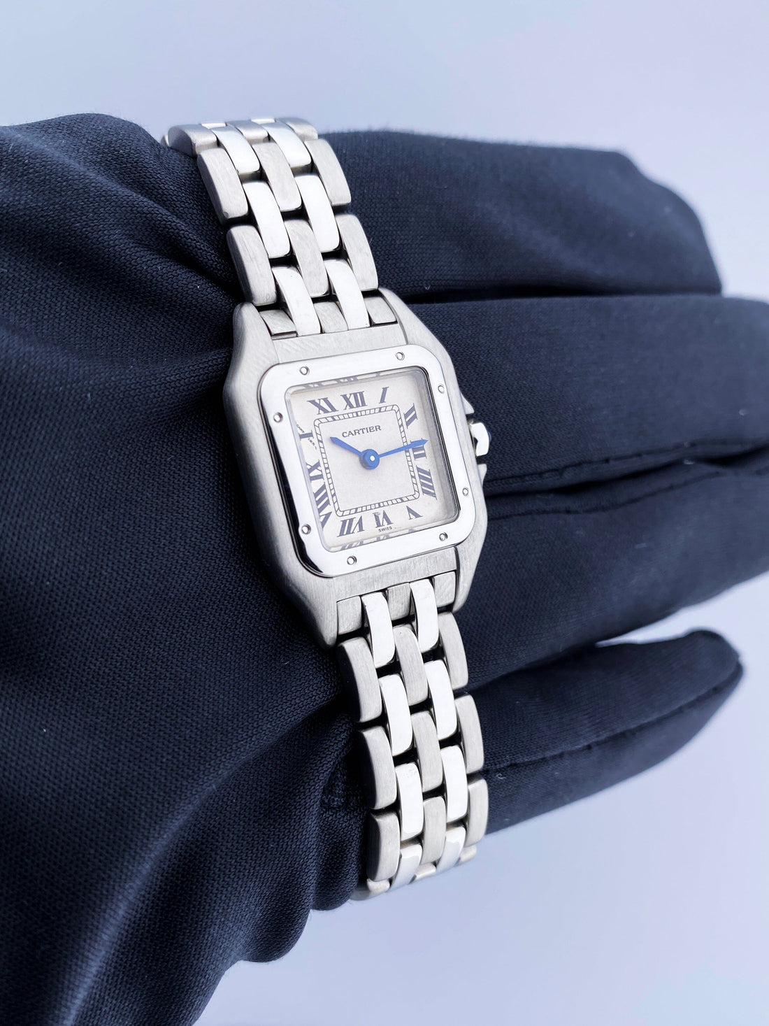 Cartier Panthere W25033P5 / 1320 Ladies Watch. 22mm stainless steel case. Stainless steel smooth bezel. Off-White dial with blue steel hands and index hour markers. Minute markers on the inner dial. Stainless steel bracelet with hidden butterfly clasp. Will fit up to a 6-inch wrist. Sapphire crystal. Stainless steel case back. Quartz: Battery powered movement.