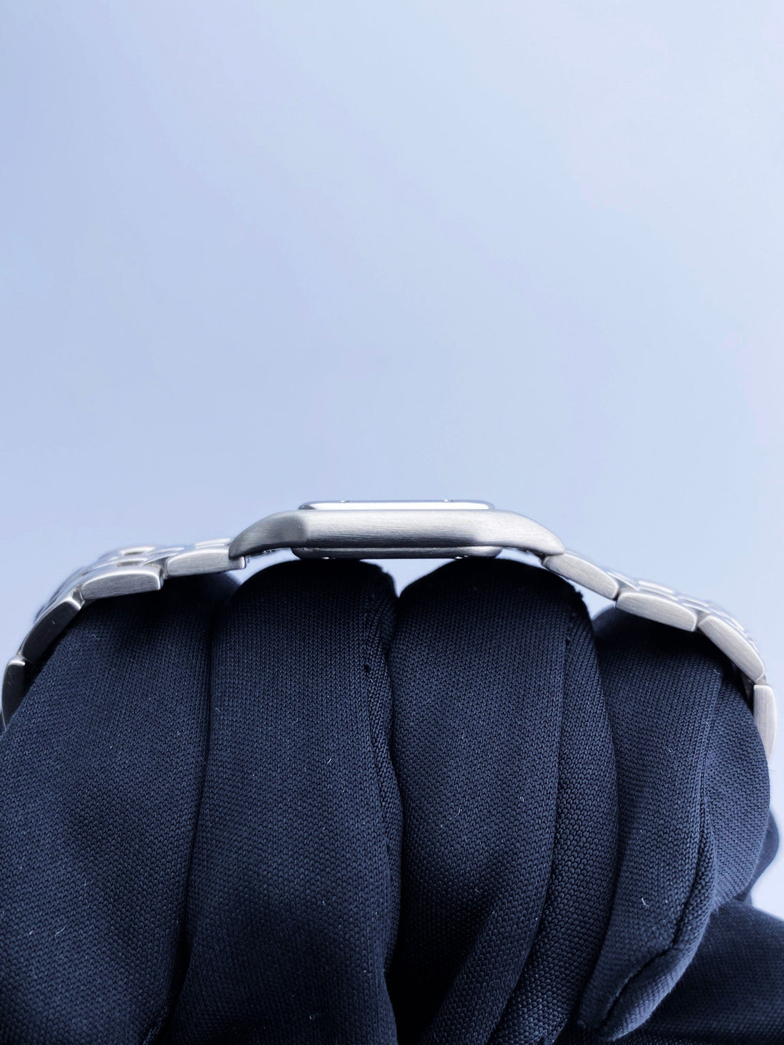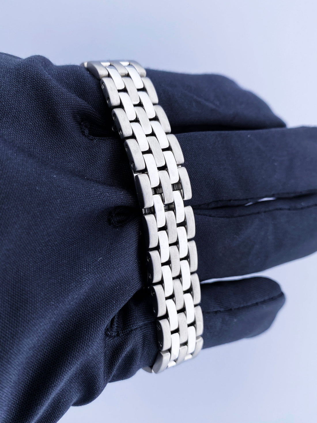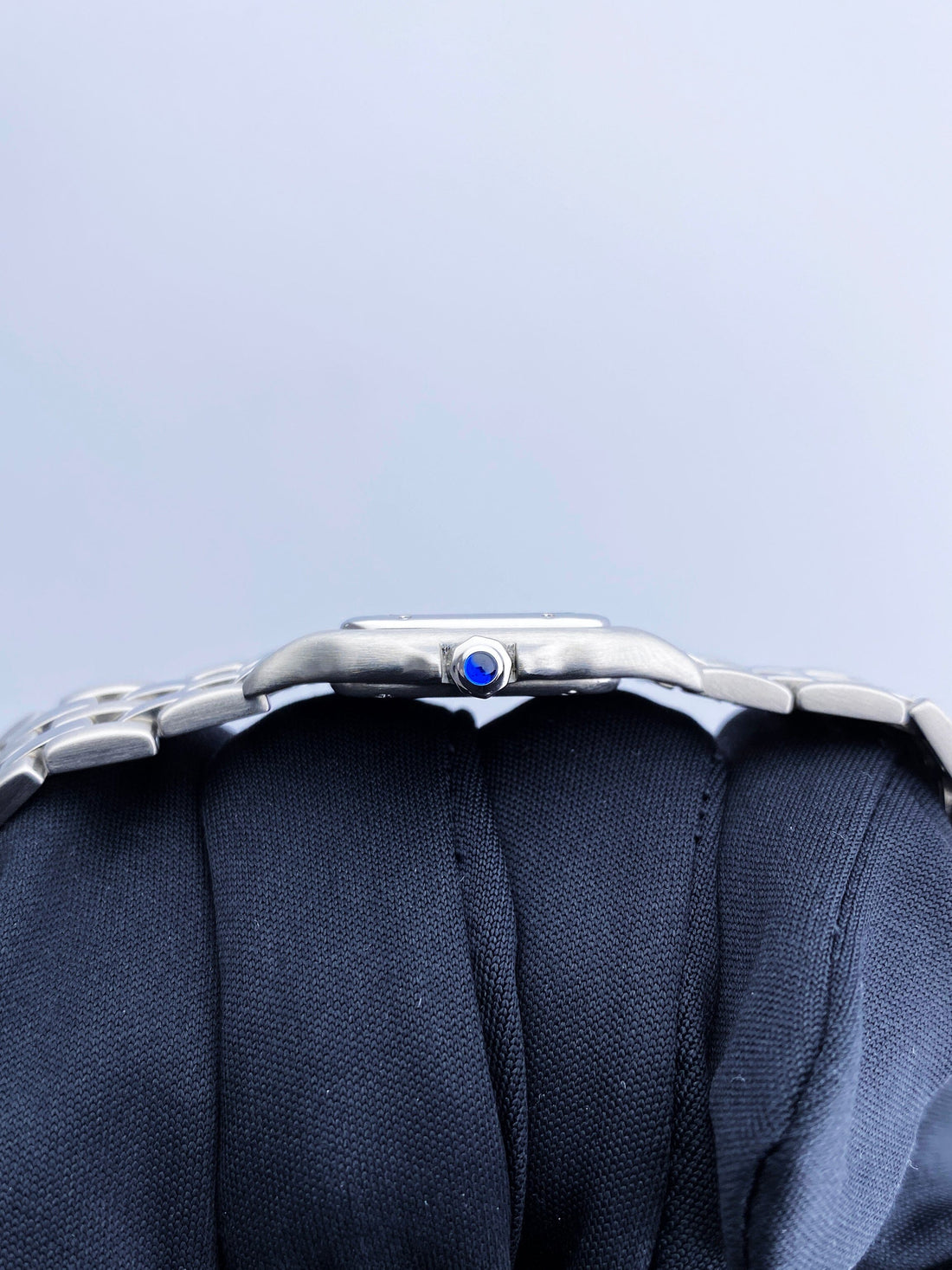 Cartier Panthere W25033P5 / 1320 Ladies Watch. 22mm stainless steel case. Stainless steel smooth bezel. Off-White dial with blue steel hands and index hour markers. Minute markers on the inner dial. Stainless steel bracelet with hidden butterfly clasp. Will fit up to a 6-inch wrist. Sapphire crystal. Stainless steel case back. Quartz: Battery powered movement.