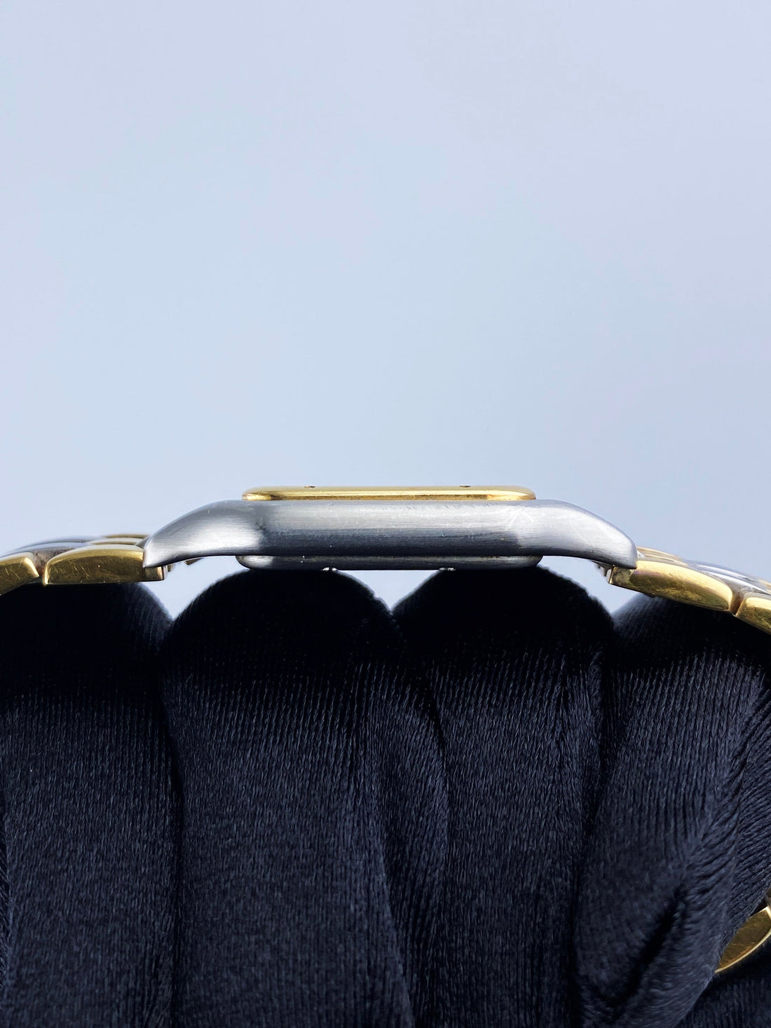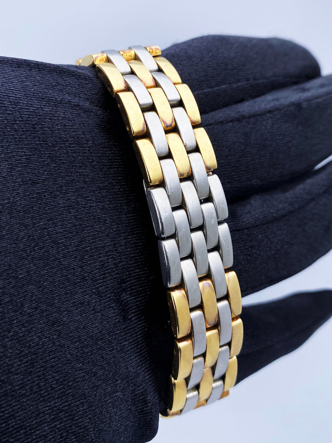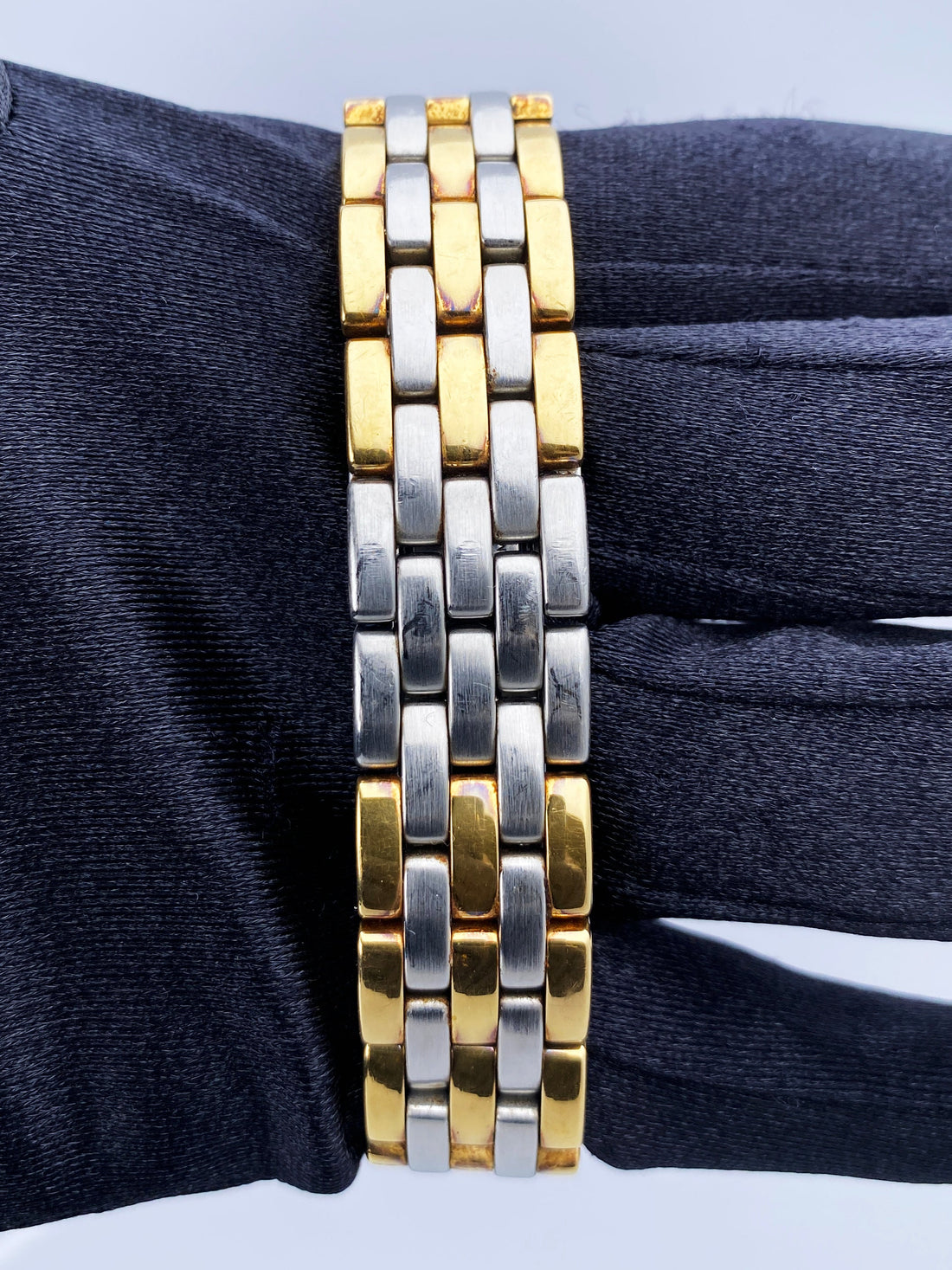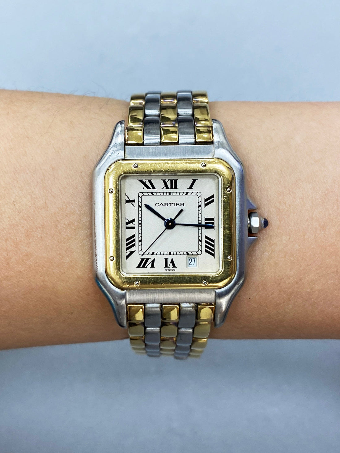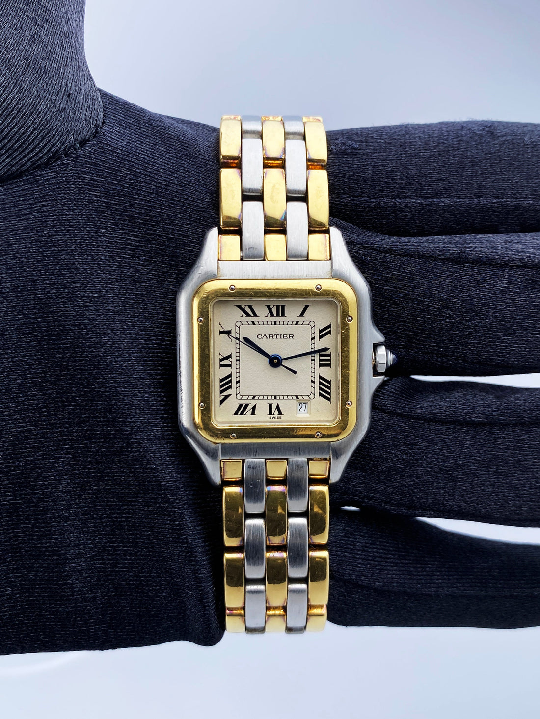 Cartier Panthere Midsize Ladies Watch. 27mm stainless steel case. 18K yellow gold bezel. Off-White dial with blue steel hands and Roman numeral hour markers. Minute markers on the inner dial. Date display at the 5 o'clock position. Stainless steel & three rows of 18K yellow gold bracelet with hidden stainless steel butterfly clasp. Will fit up to a 6-inch wrist. Sapphire crystal. Stainless steel case back. Quartz: Battery powered movement.