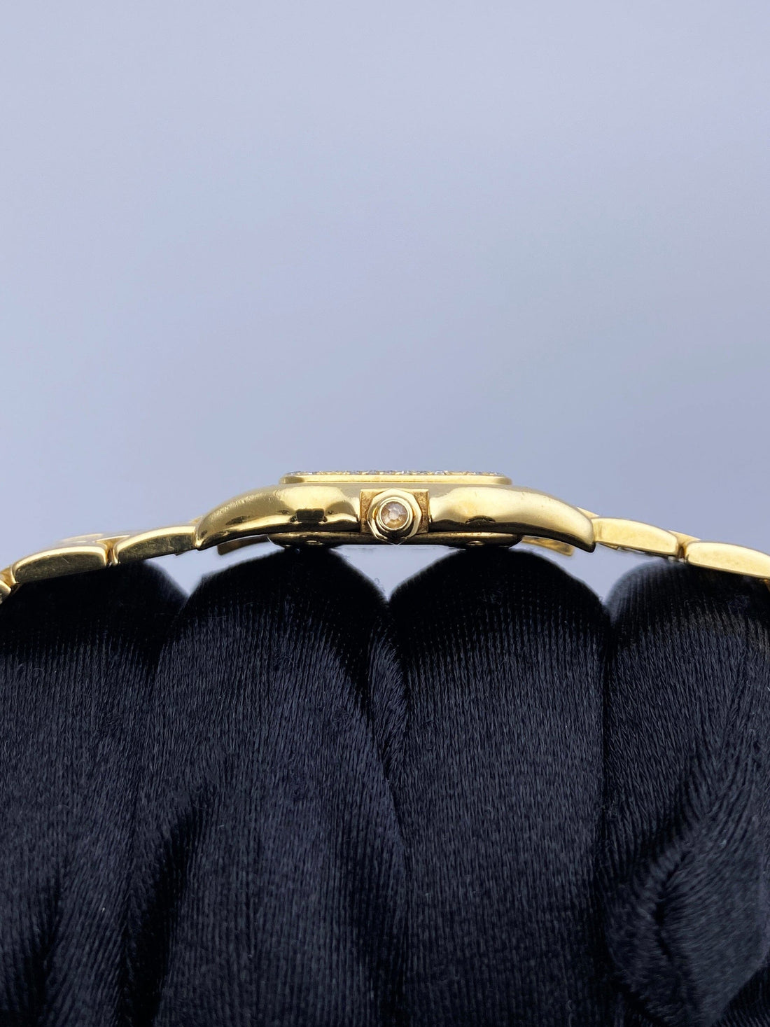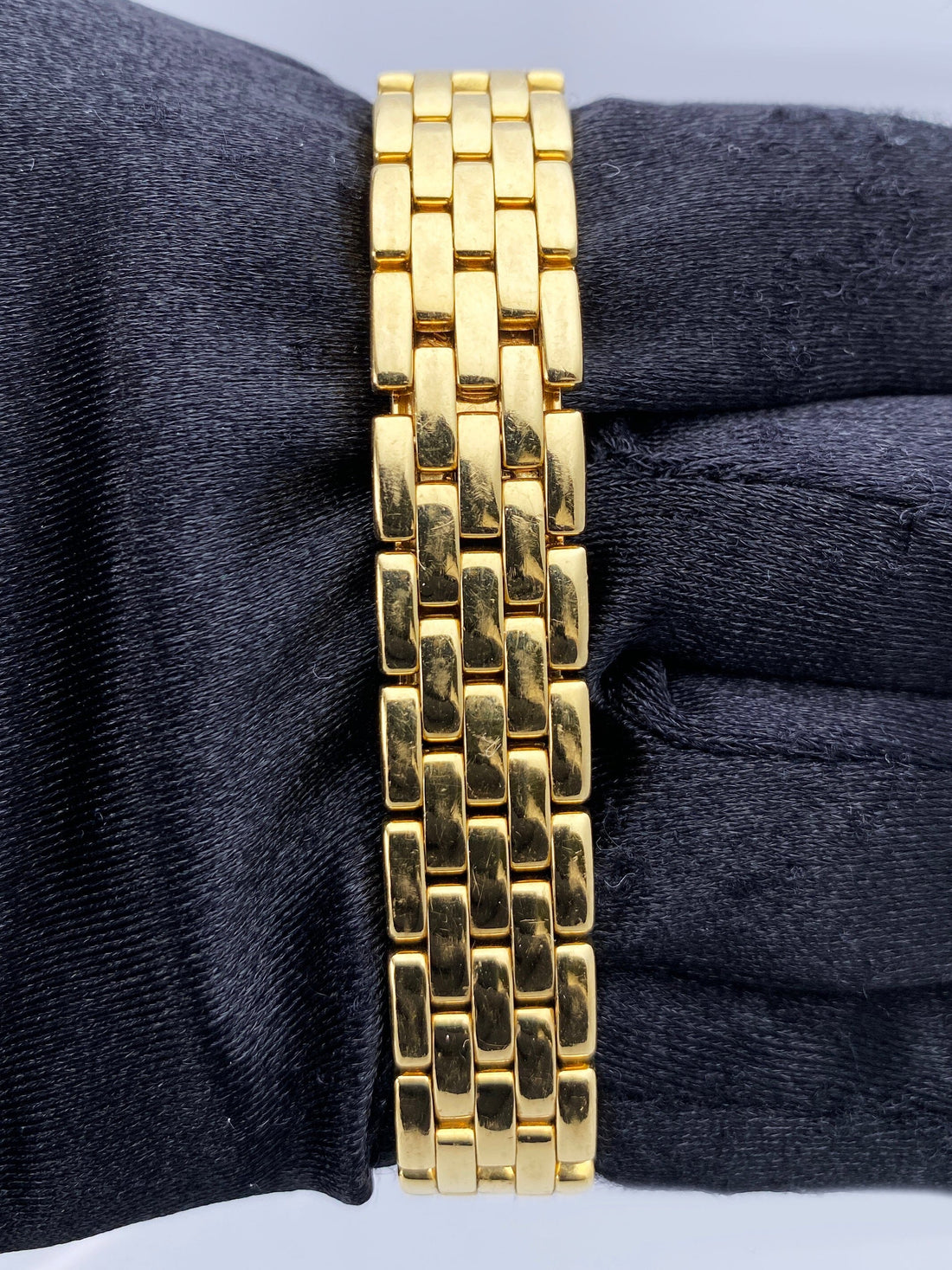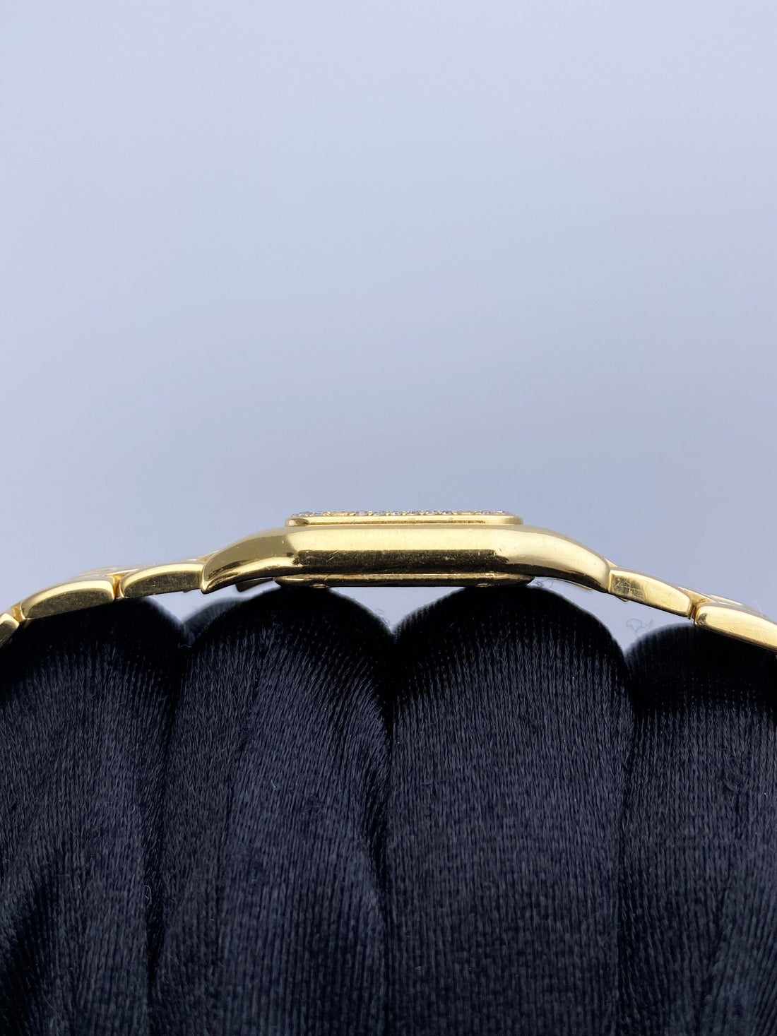 Cartier Panthere Ladies Watch. 22mm 18K yellow gold case. 18K yellow gold bezel with original factory diamond set. Off-white dial with blue hands and Roman numeral hour makers. Minute markers on the inner dial. 18K yellow gold bracelet with an 18K yellow gold hidden butterfly clasp. Will fit up to 6-inch wrist. Sapphire crystal. 18K yellow gold case back. Quartz: Battery powered movement. This will come with the original Box and Papers
