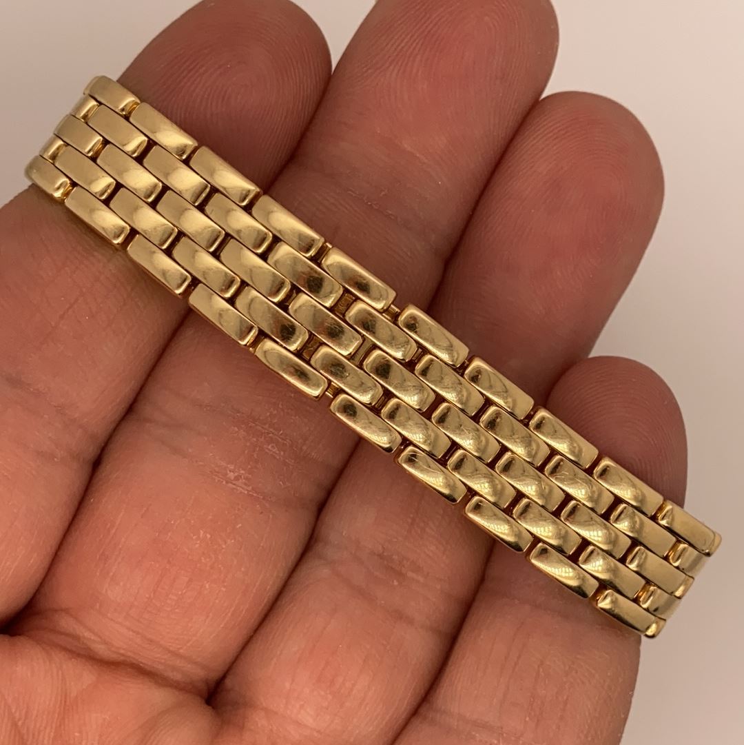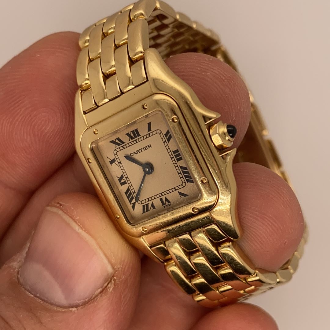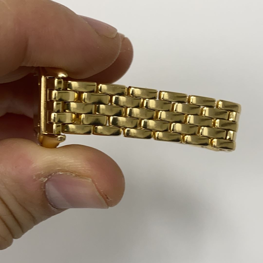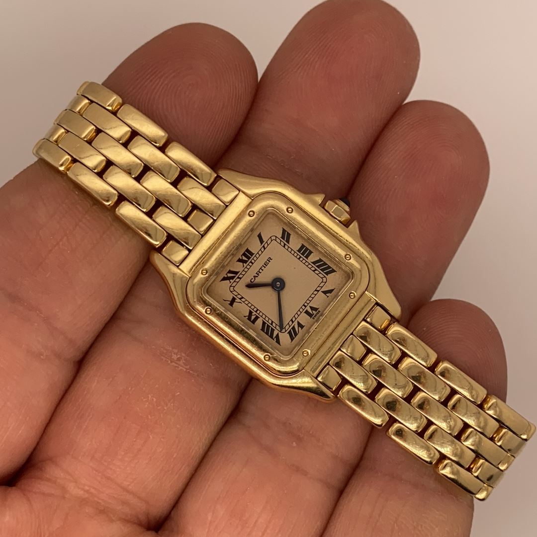 Cartier Panthere ladies watch. 22MM 18K yellow gold case with 18K yellow gold bezel. Off-White dial with blue hands and black Roman numeral hour marker. 18K yellow gold bracelet with 18K yellow gold hidden butterfly clasp. Will fit up to 6-Inch comfortable. Sapphire crystal and 18K yellow gold case back. Quartz battery powered movement.
