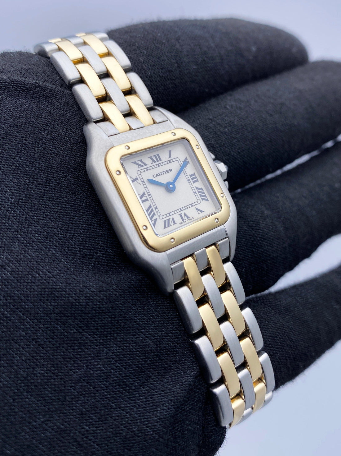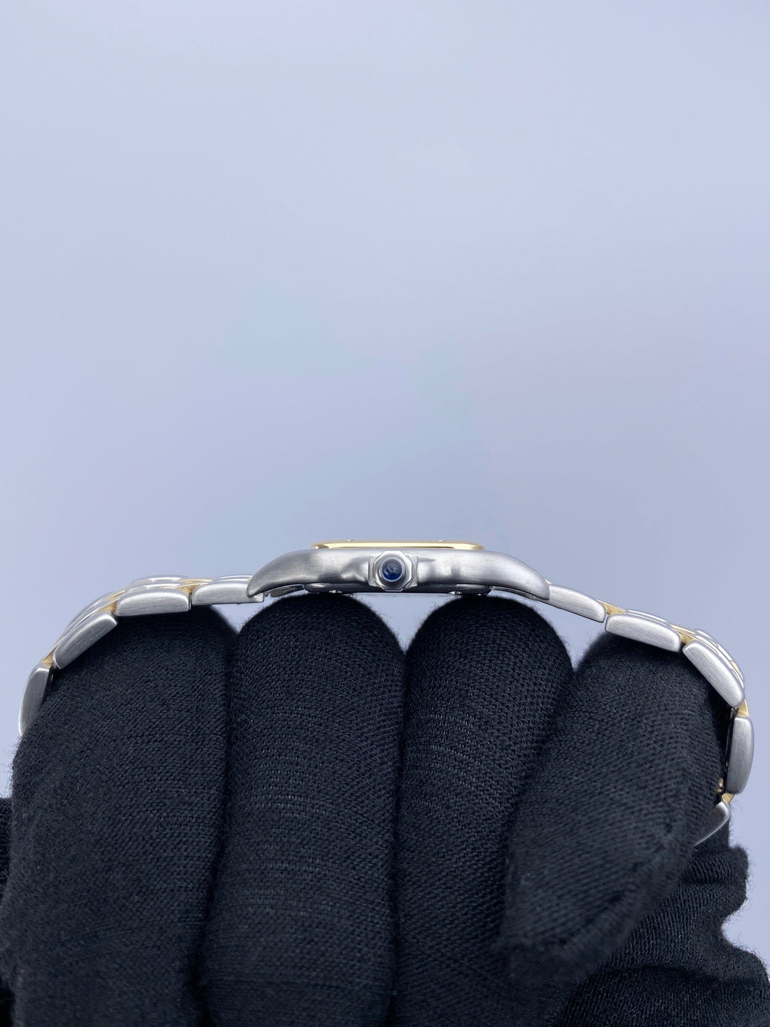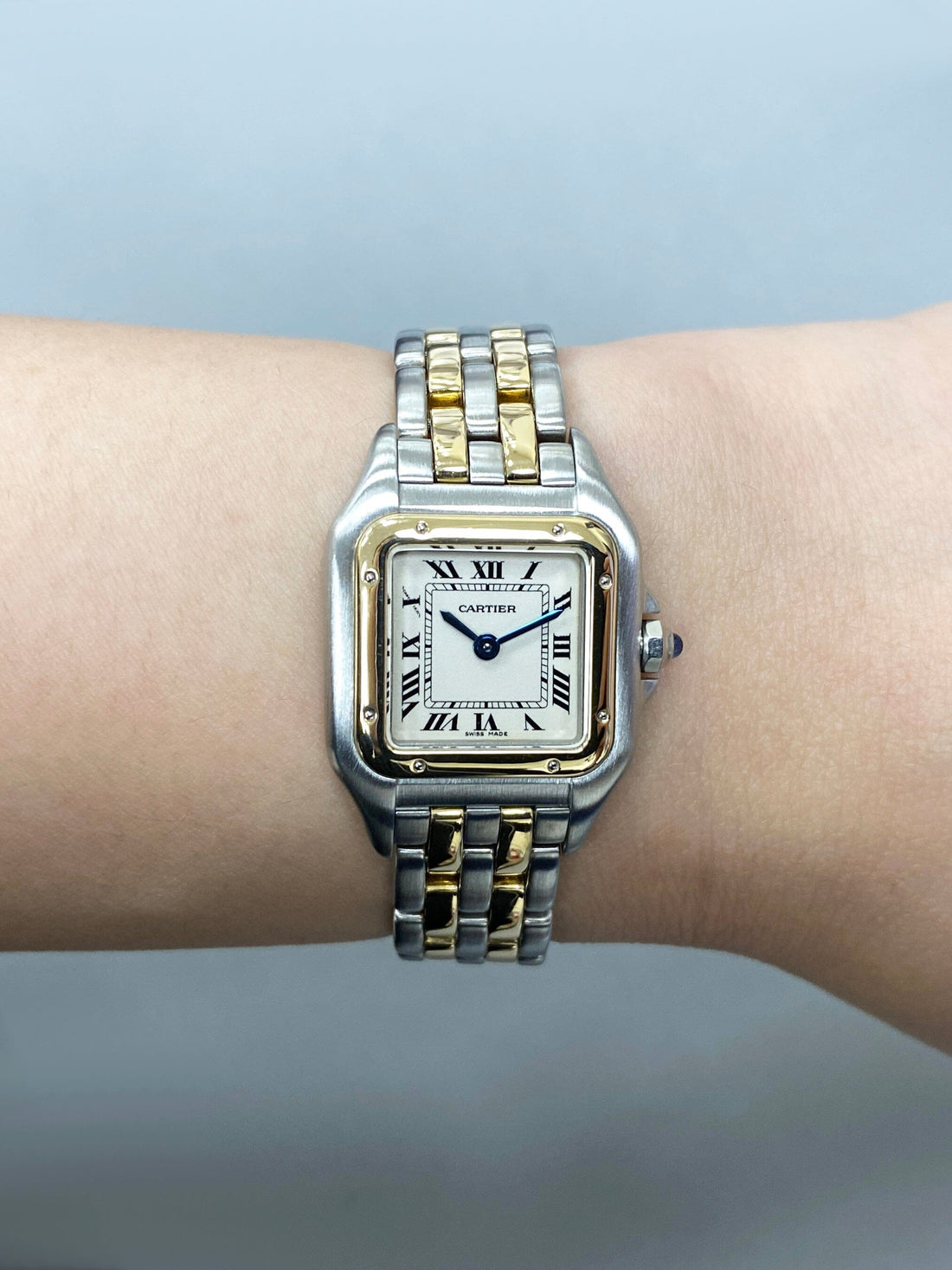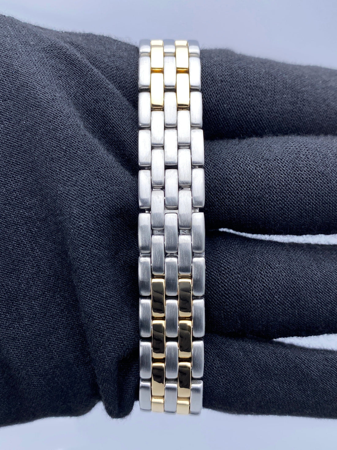 Cartier Panthere 6692 Ladies Watch. 22mm stainless steel case. 18K yellow gold bezel. Off-white dial with Blue steel hands and Roman numeral hour markers. Minute markers on the inner dial. Stainless steel & Two rows of 18K yellow gold bracelet with hidden butterfly Clasp. Will fit up to a 6-inch wrist. Sapphire crystal. Stainless steel case back. Quartz: Battery powered movement.