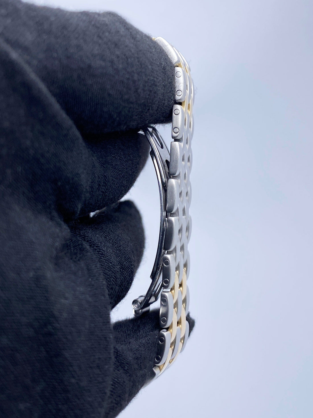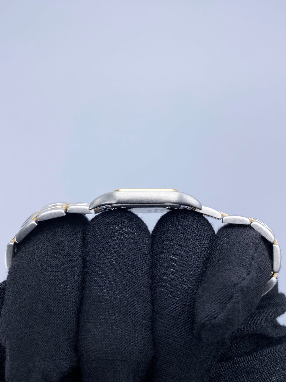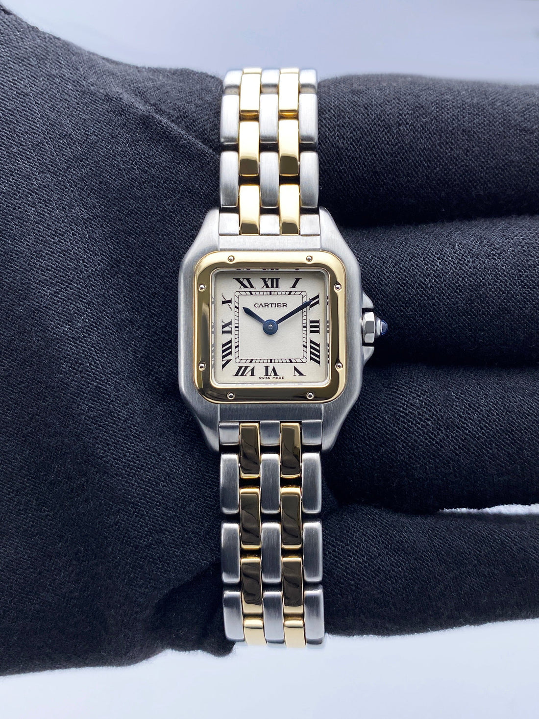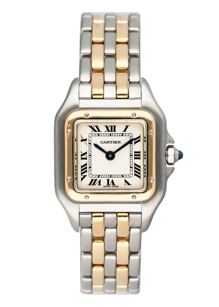 Cartier Panthere 6692 Ladies Watch. 22mm stainless steel case. 18K yellow gold bezel. Off-white dial with Blue steel hands and Roman numeral hour markers. Minute markers on the inner dial. Stainless steel & Two rows of 18K yellow gold bracelet with hidden butterfly Clasp. Will fit up to a 6-inch wrist. Sapphire crystal. Stainless steel case back. Quartz: Battery powered movement.