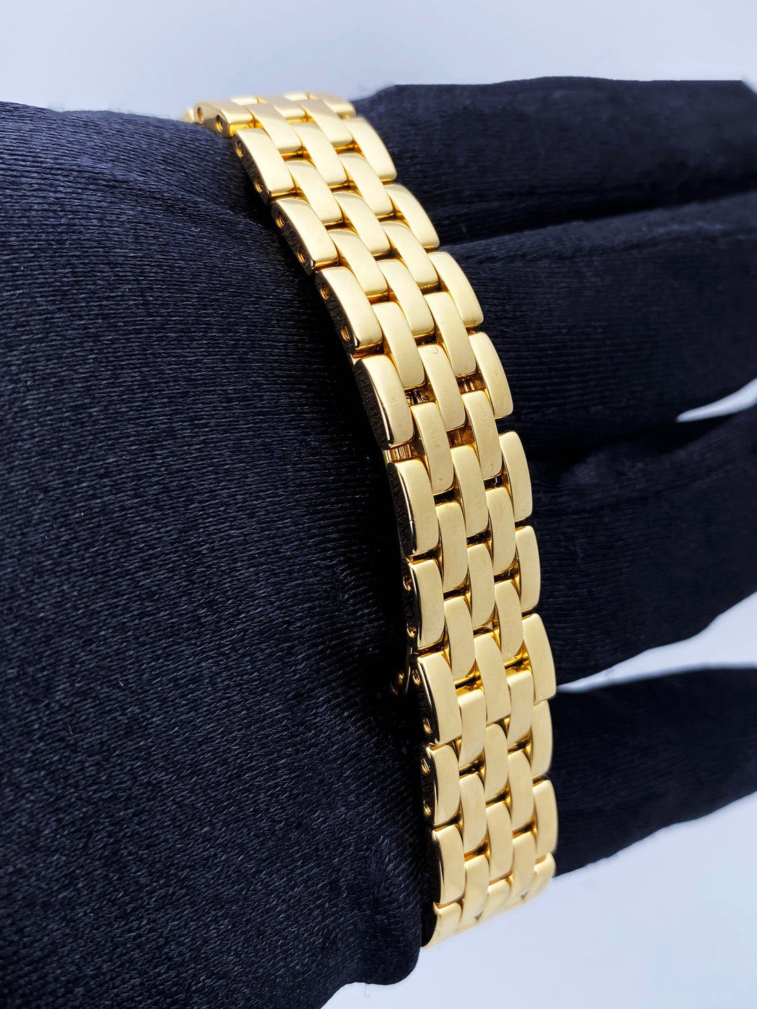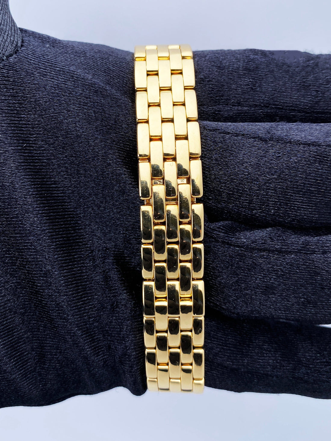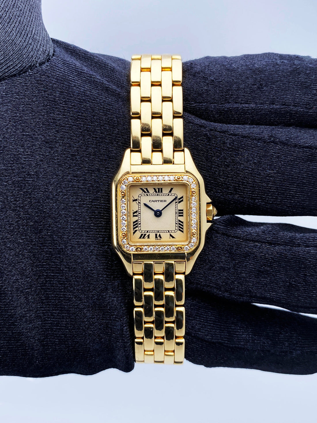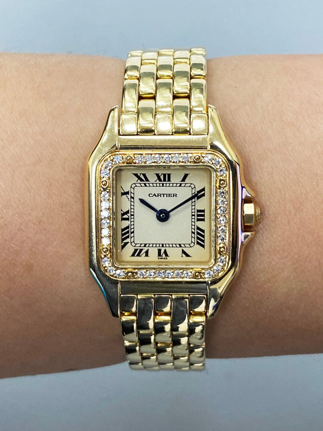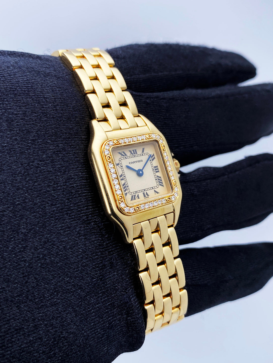 Cartier Panthere 8057915 Ladies Watch. 22mm 18k yellow gold case. 18k yellow gold and factory diamond bezel. Off-white dial with blue hands and Roman numeral hour makers. 18k yellow gold bracelet with an 18k yellow gold hidden butterfly clasp. Will fit up to 6-inch wrist. Sapphire crystal. 18k yellow gold case back. Quartz: battery powered movement.