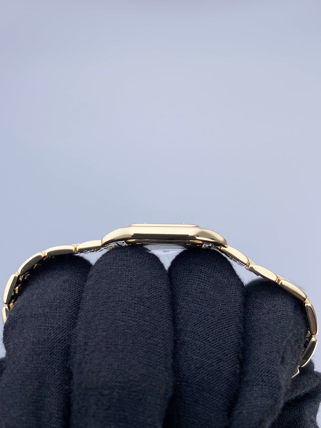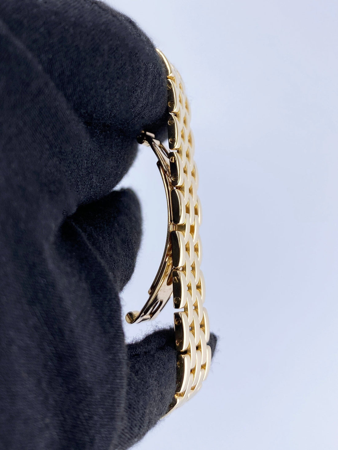 Cartier Panthere 84783747 / 8669 Ladies Watch. 22mm 18K yellow gold case. 18K yellow gold smooth bezel. Off-White dial with blue steel hands and Roman numeral hour markers. Minute markers on the inner dial. 18K yellow gold bracelet with hidden butterfly clasp. Will fit up to a 5.5-inch wrist. Sapphire crystal. 18K yellow gold case back. Quartz: Battery powered movement.