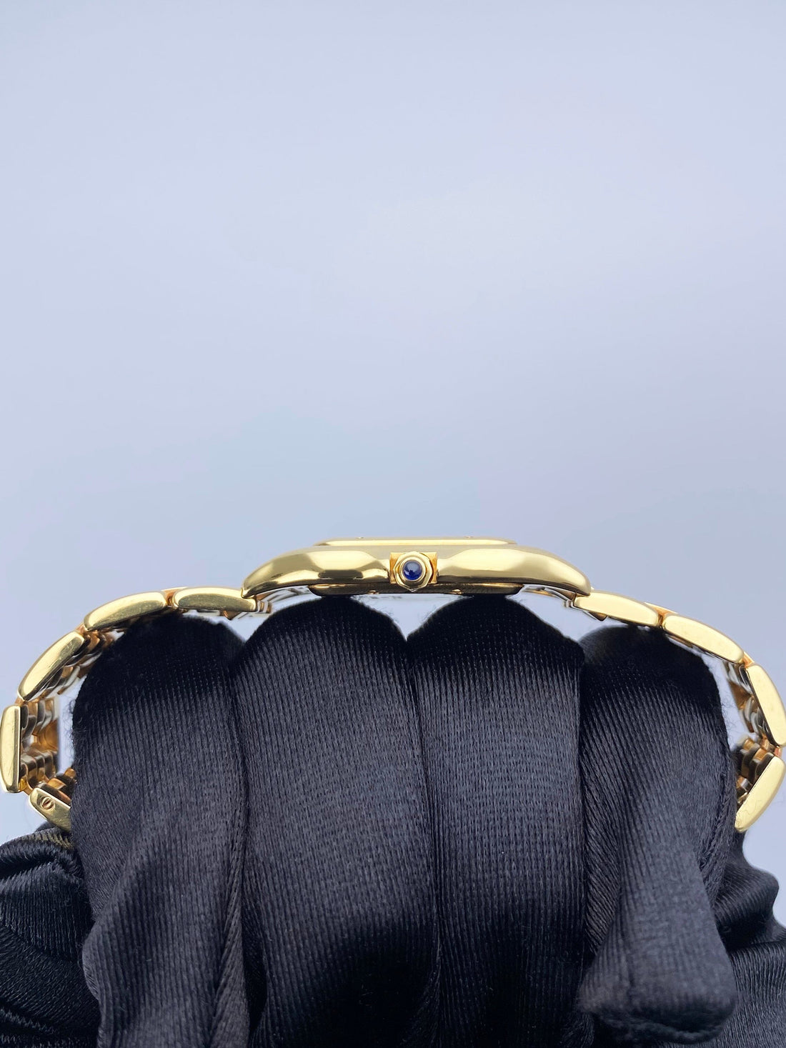 Cartier Panthere 8839 Midsize Ladies Watch. 27mm 18K yellow gold case. 18K yellow gold bezel. Off-White dial with blue steel hands and Roman numeral hour markers. Minute markers on the inner dial. Date display at the 5 o'clock position. 18K yellow gold bracelet with hidden butterfly clasp. Will fit up to a 6-inch wrist. Sapphire crystal. 18K yellow gold case back. Quartz: Battery powered movement.