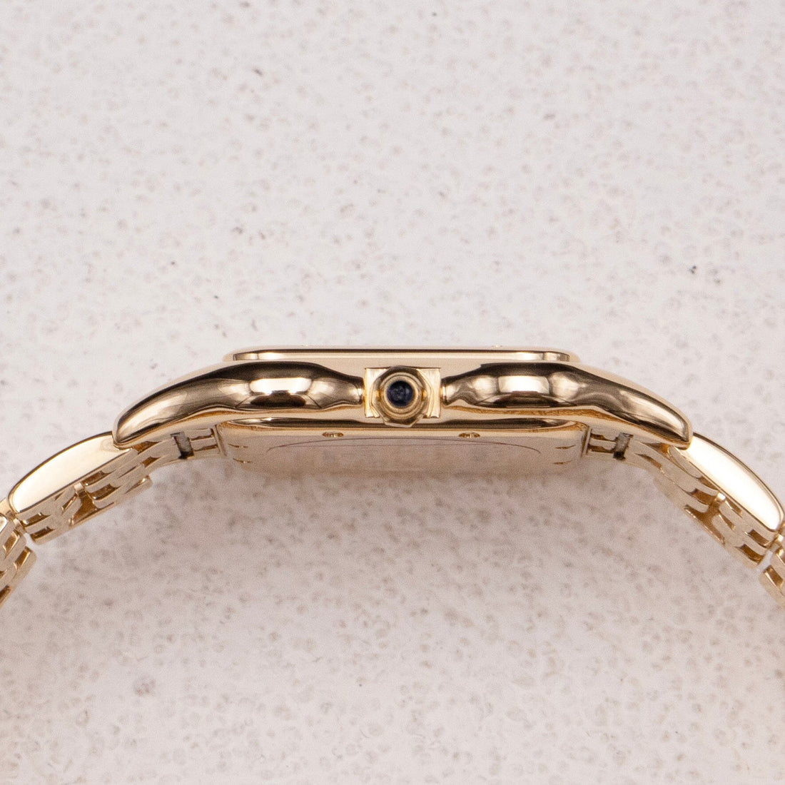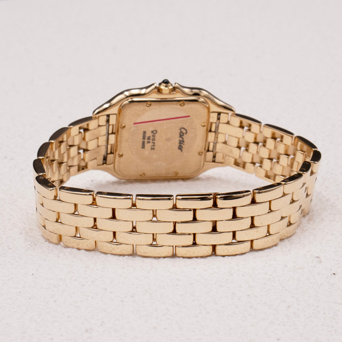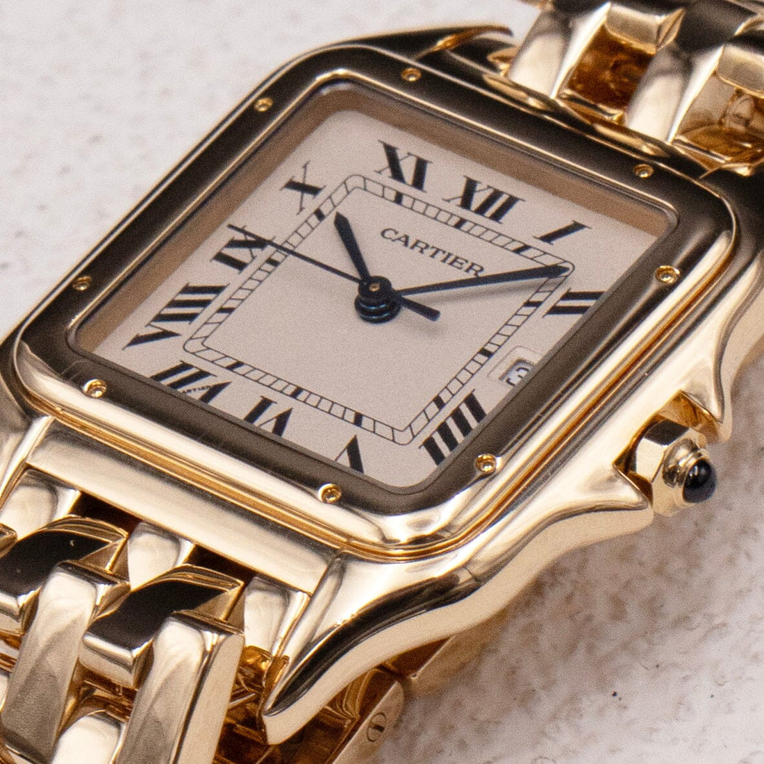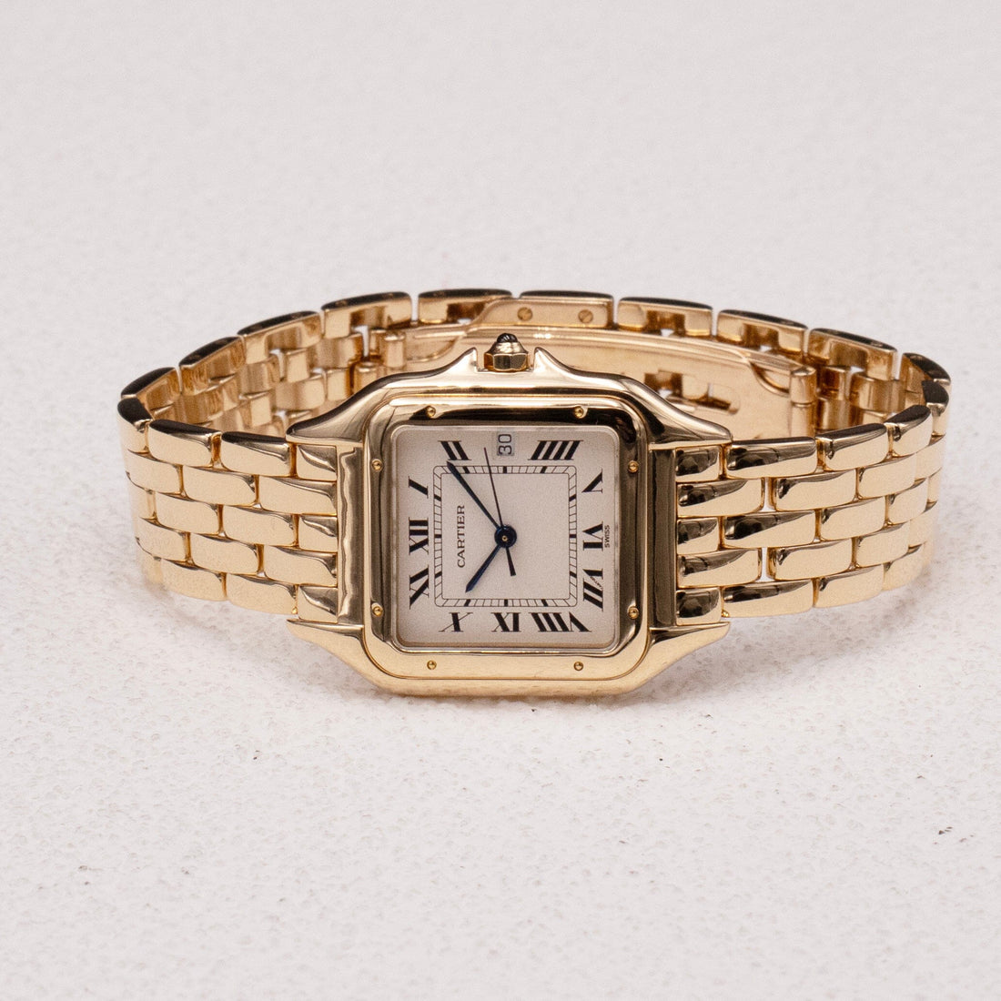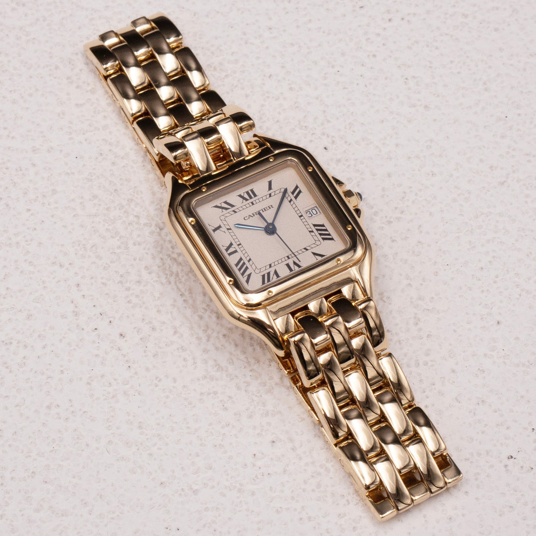 Cartier Panthere Large Watch. 29mm 18K yellow gold case with 18K yellow gold smooth bezel. Off-White dial with blue steel hands and black Roman numeral hour markers. Minute markers on the inner dial. Date display at the 3 o'clock position. 18k yellow gold bracelet with butterfly clasp. Will fit up to a 6.5-inch wrist. Sapphire crystal. 18K yellow gold case back. Quartz: Battery powered movement.