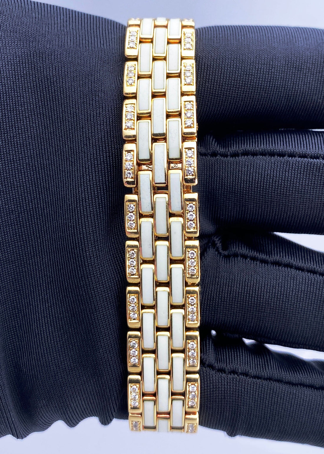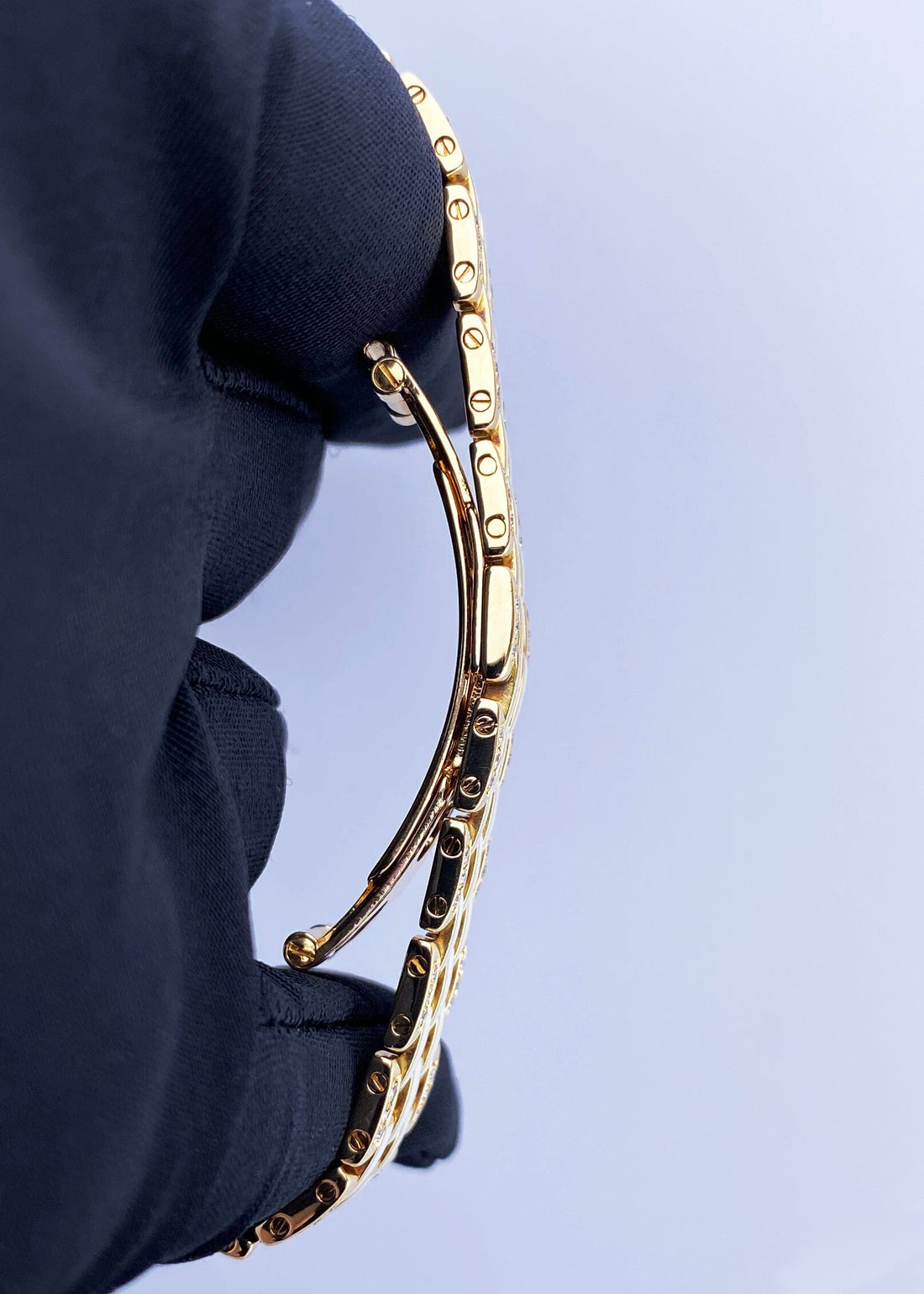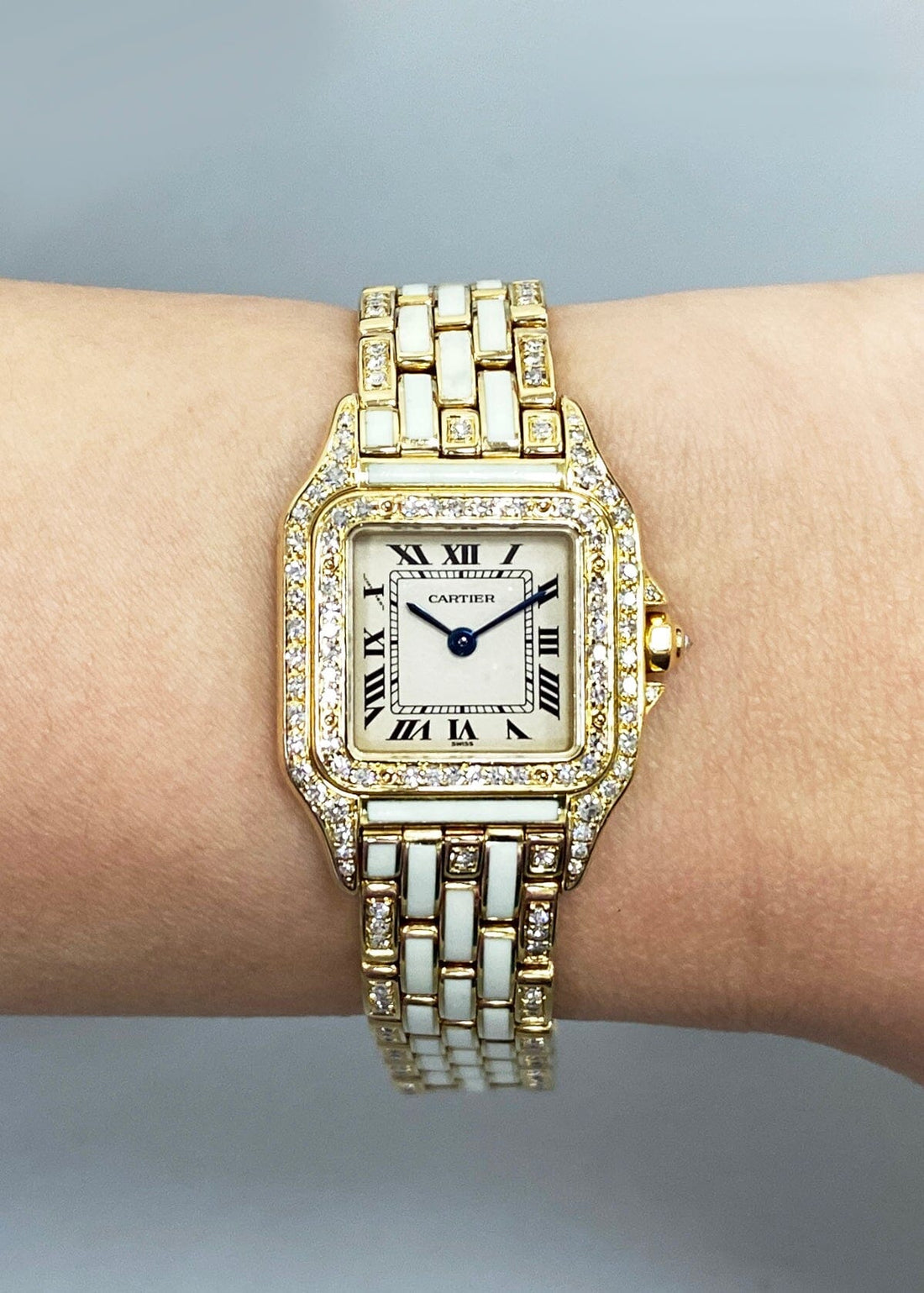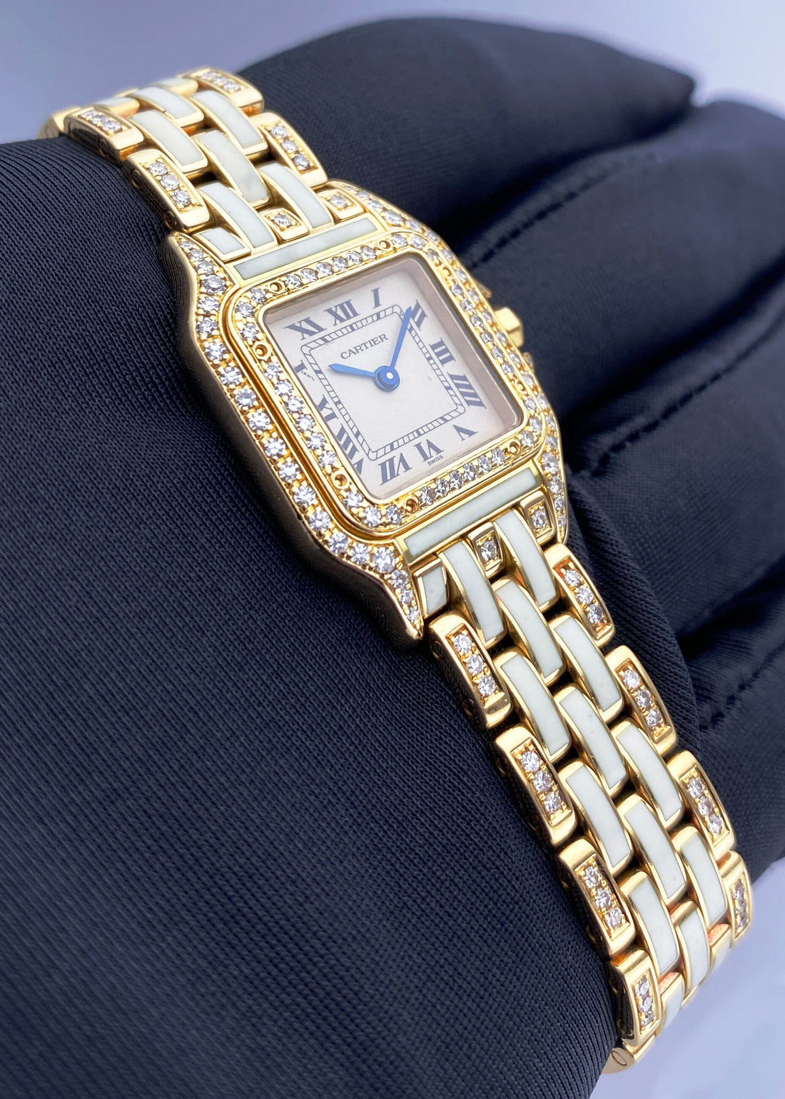 Cartier Panthere GGC98010 / 8057915 Ladies Watch. 22mm 18K yellow gold & original factory diamond set case with 18K yellow gold & original factory diamond set bezel. Off-white dial with blue hands. Black Roman numeral hour marker. 18K yellow gold bracelet insert with factory diamond and white enamel. Hidden butterfly clasp. Will fit up to 6.5-Inch wrist. Sapphire crystal. 18K yellow gold case back. Quartz: battery powered movement.