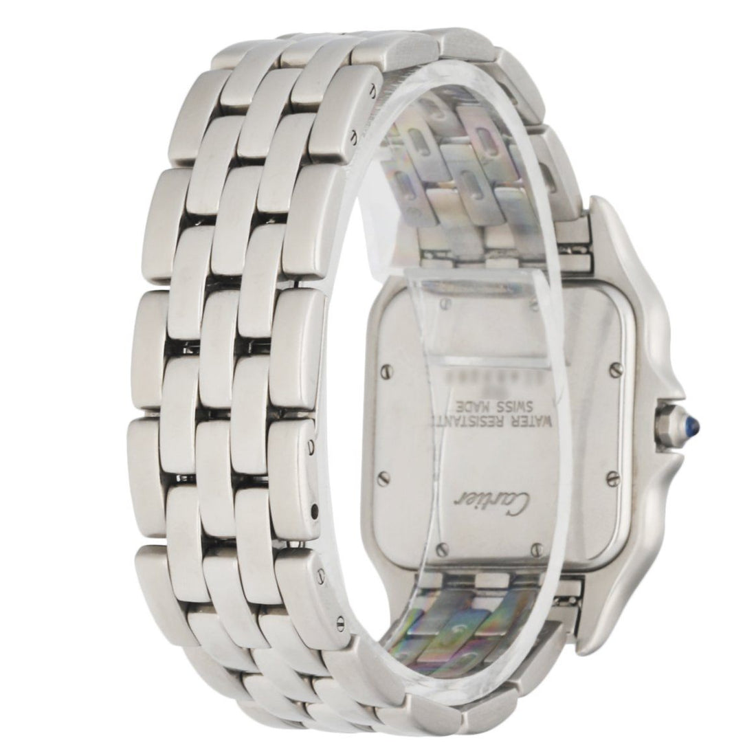 Cartier Panthere Jumbo 1300 Men's Watch. 30mm stainless steel case with stainless steel Bezel. Off White dial with blue steel hands and black Roman numeral hour markers. Date display at the 3 o'clock position. Stainless steel bracelet with a hidden butterfly clasp. Will fit up to a 6.75-inch wrist. Quartz battery powered movement. Sapphire crystal. stainless steel case back.