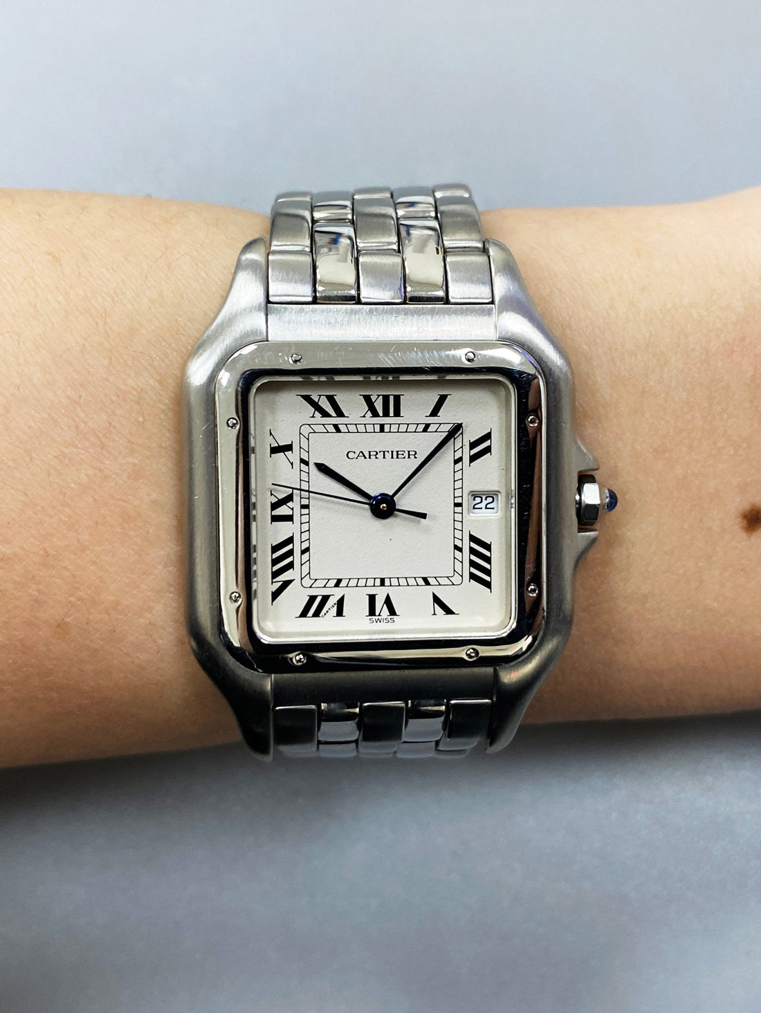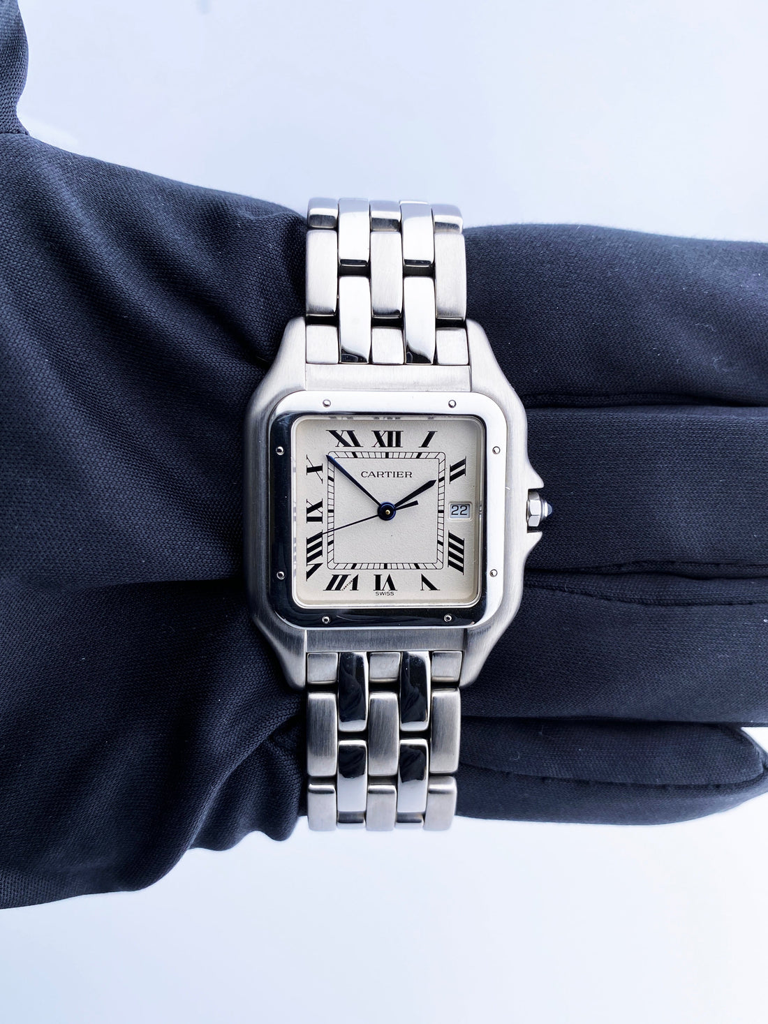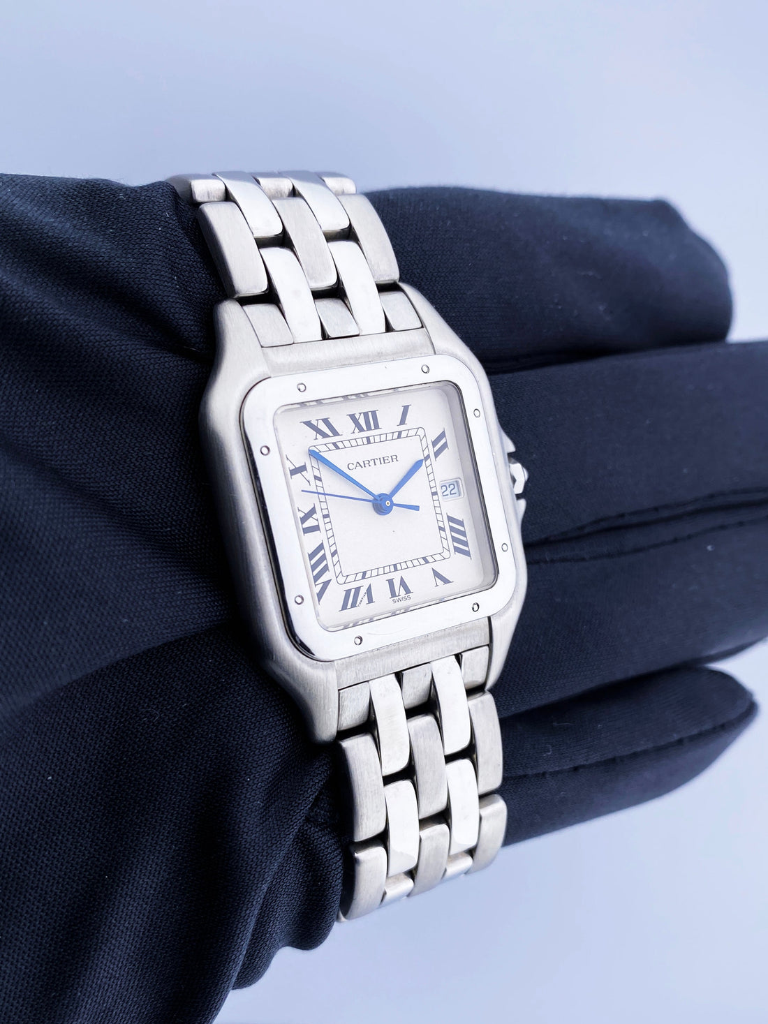 Cartier Panthere Jumbo 1300 Mens Watch. 29mm stainless steel case with stainless steel bezel. Off-White dial with blue steel hands and black Roman numeral hour markers. Date display at the 3 o'clock position. Stainless steel bracelet with a hidden butterfly clasp. Will fit up to a 5.75-inch wrist. Quartz battery powered movement. Sapphire crystal. stainless steel case back.