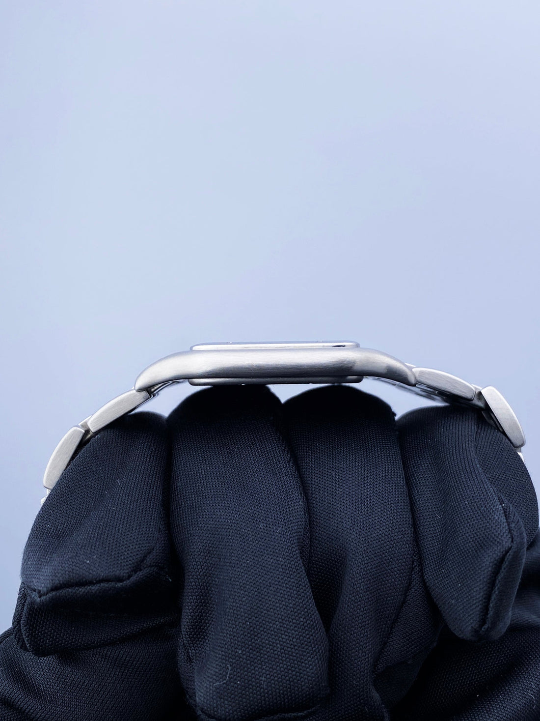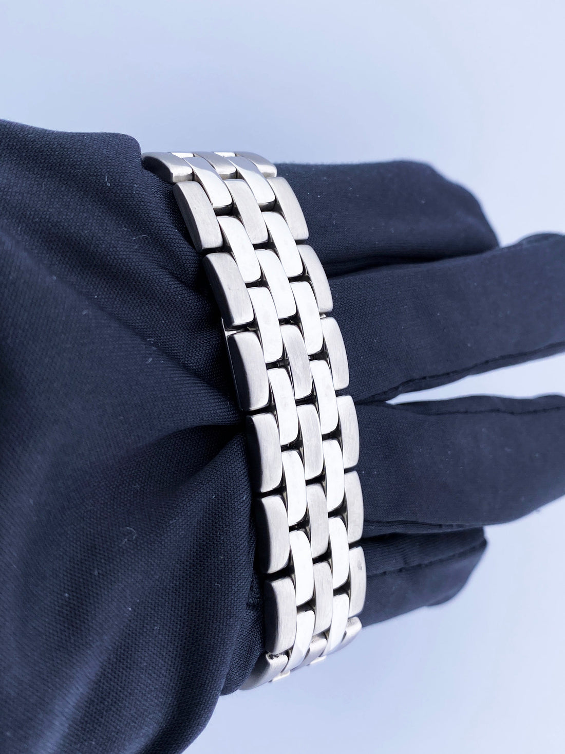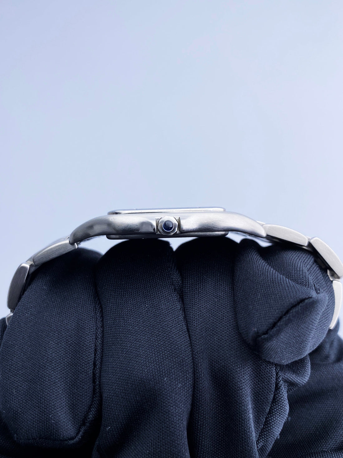 Cartier Panthere Jumbo 1300 Mens Watch. 29mm stainless steel case with stainless steel bezel. Off-White dial with blue steel hands and black Roman numeral hour markers. Date display at the 3 o'clock position. Stainless steel bracelet with a hidden butterfly clasp. Will fit up to a 5.75-inch wrist. Quartz battery powered movement. Sapphire crystal. stainless steel case back.