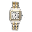 Cartier Panthere Jumbo W25027B6 / 187957 Mens Watch. 31mm stainless steel case. 18K yellow gold bezel. Off-White dial with blue steel hands and black Roman numeral hour markers. Minute markers on the inner dial. Date display at the 3 o'clock position. Stainless steel & one row of 18k yellow gold bracelet with hidden butterfly clasp. Will fit up to a 7-inch wrist. Sapphire crystal. Stainless steel case back. Quartz: Battery powered movement.