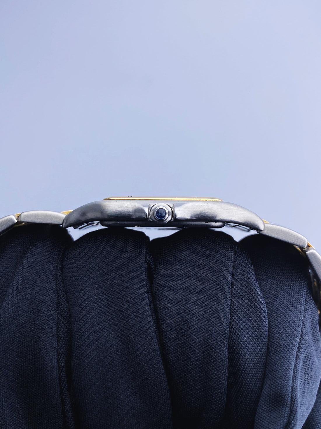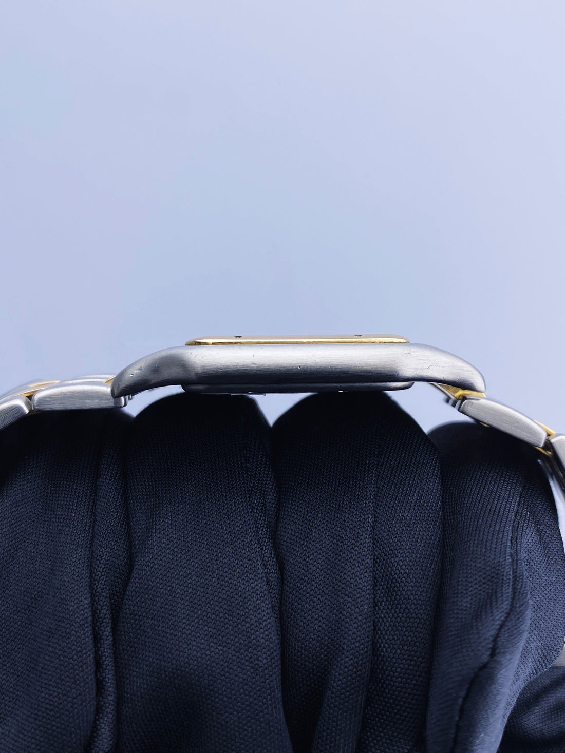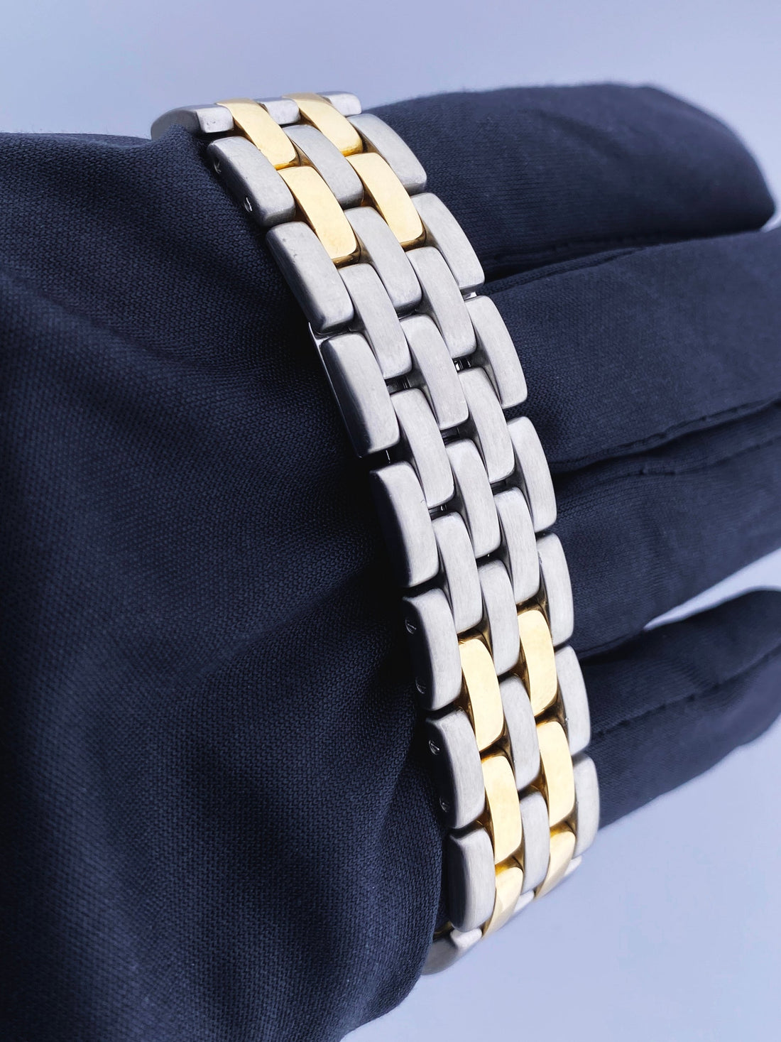 Cartier Panthere Large Mens Watch. 31mm stainless steel case with 18K yellow gold smooth bezel. Off-White dial with blue steel hands and black Roman numeral hour markers. Minute markers on the inner dial. Date display at the 3 o'clock position. 18k yellow gold & stainless steel bracelet with butterfly clasp. Will fit up to a 6.75-inch wrist. Sapphire crystal. Stainless steel case back. Quartz: Battery powered movement.
