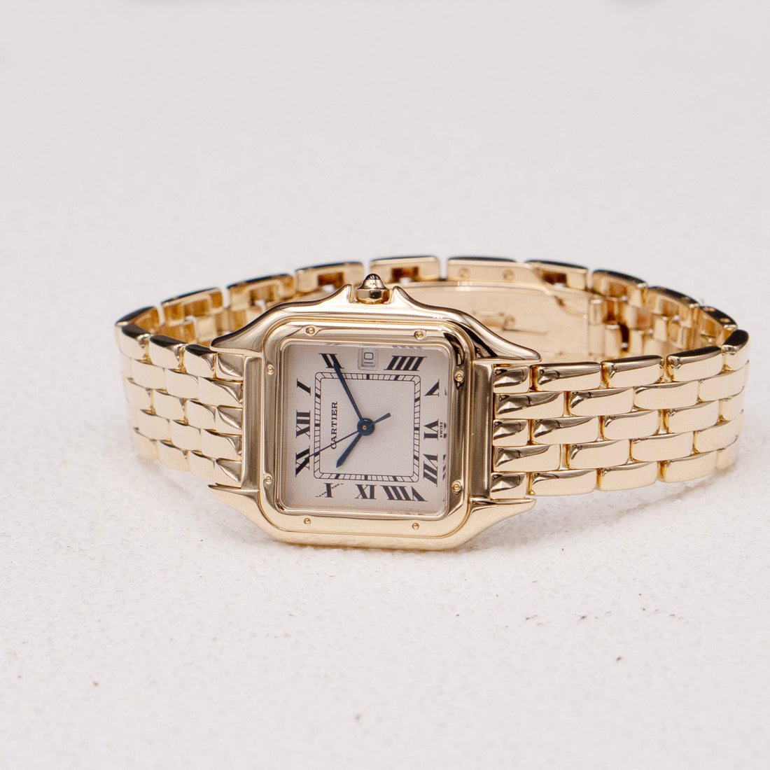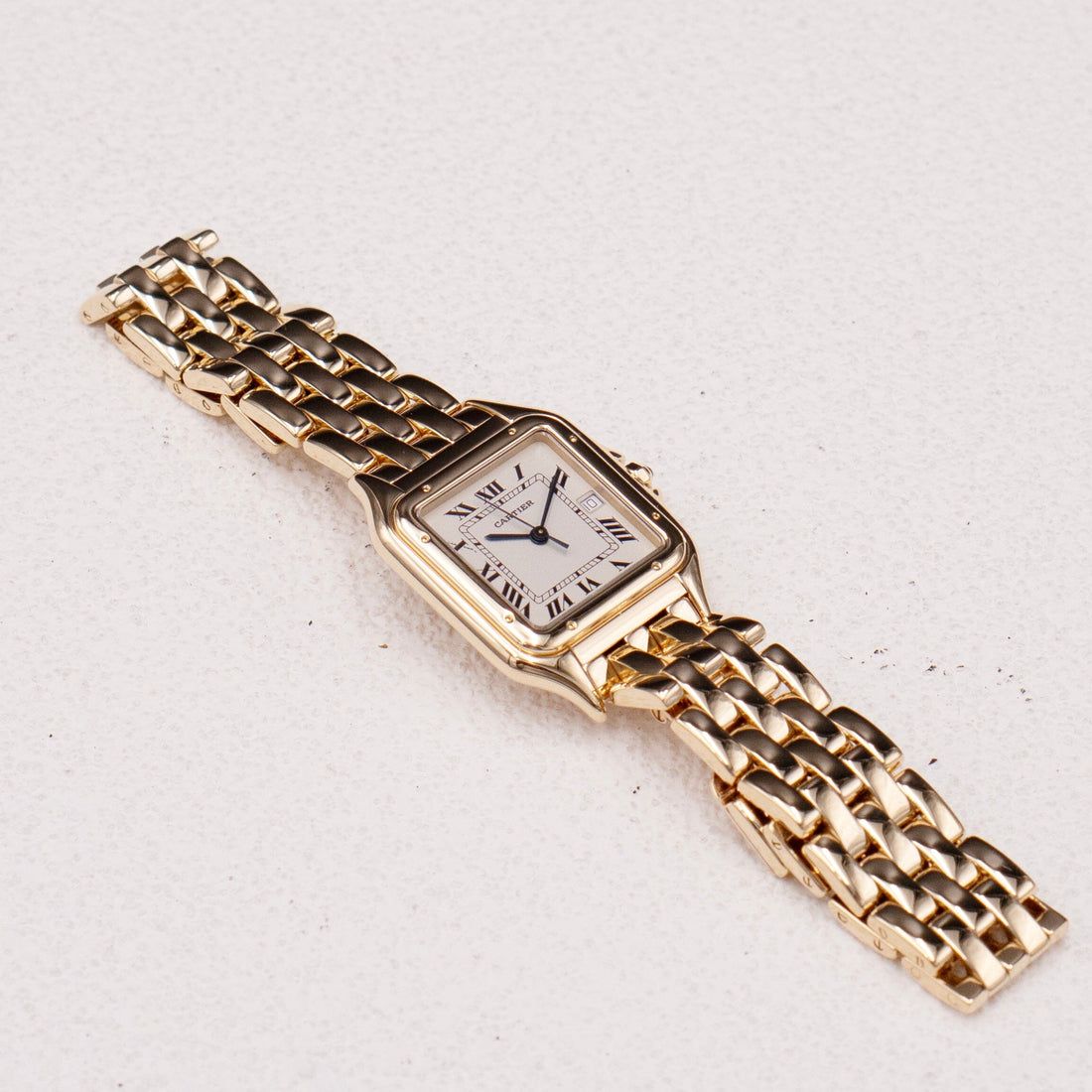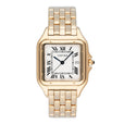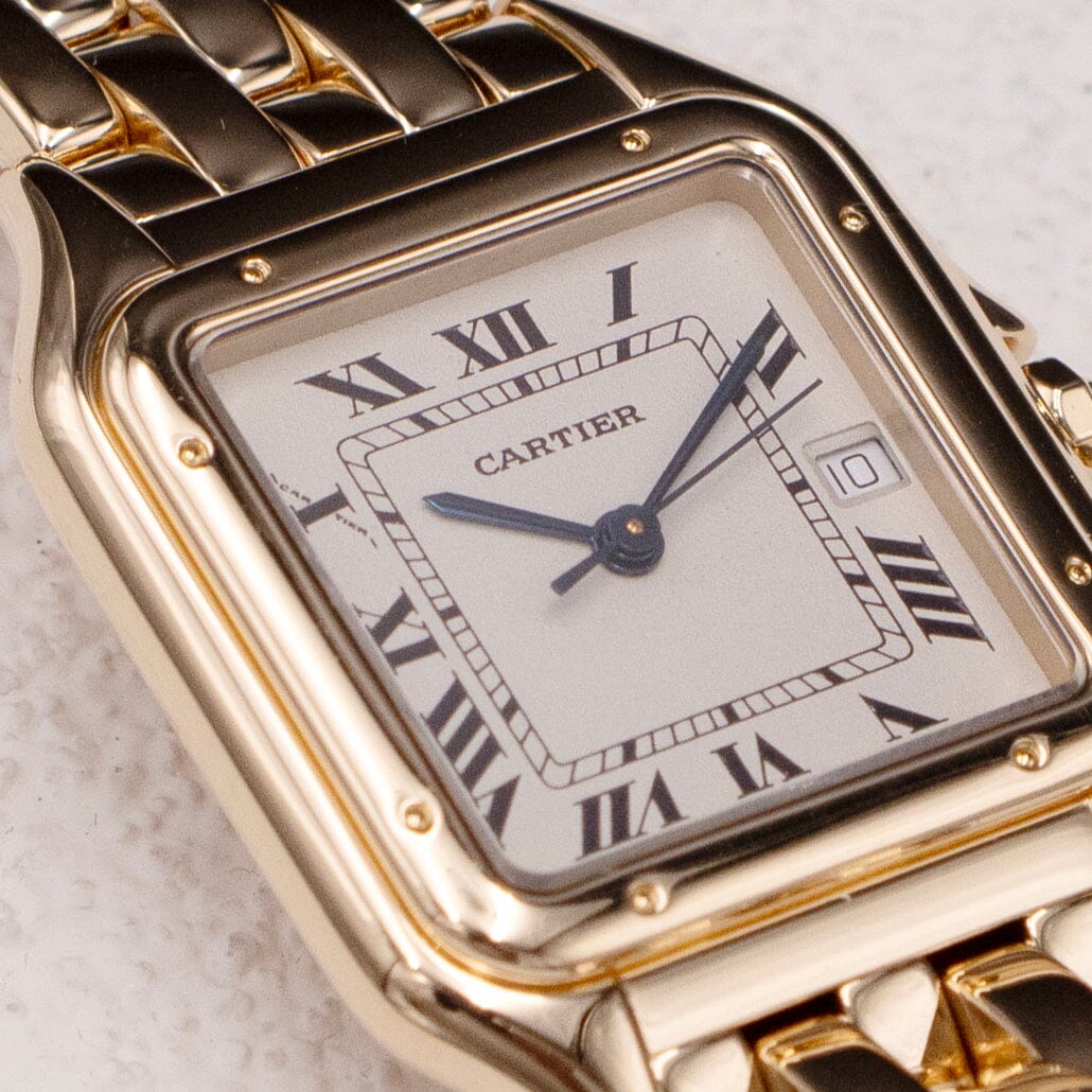 Cartier Panthere Large Mens Watch. 29mm 18K yellow case with 18K yellow gold bezel. Off-white dial with blue steel hands and black Roman numeral hour markers. Date display at the 3 o'clock position. Minute markers on the inner dial. 18K yellow gold bracelet with a hidden butterfly clasp. Will fit up to a 6.5-inch wrist. Sapphire crystal. 18K yellow gold case back. Quartz: battery powered movement.