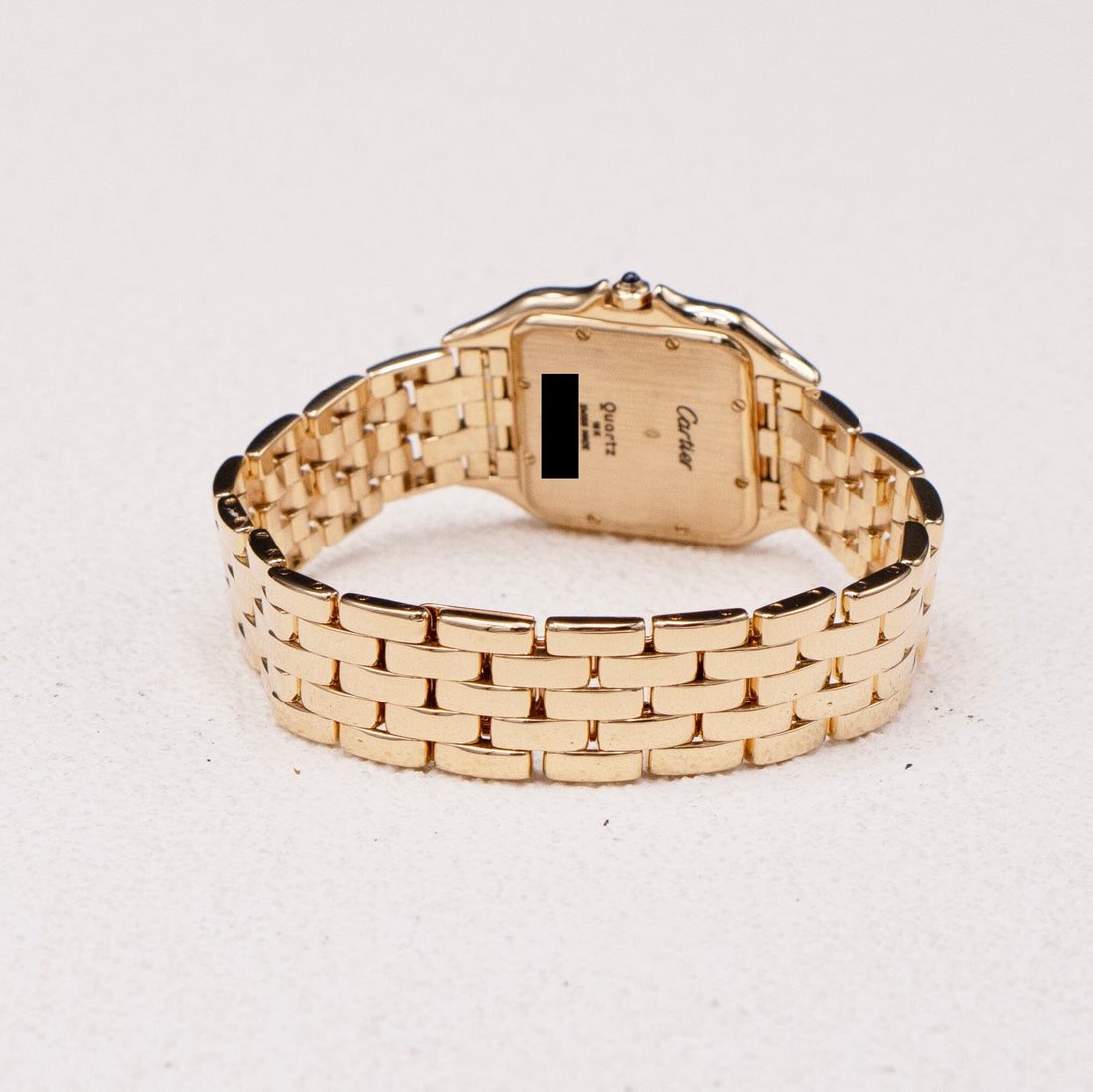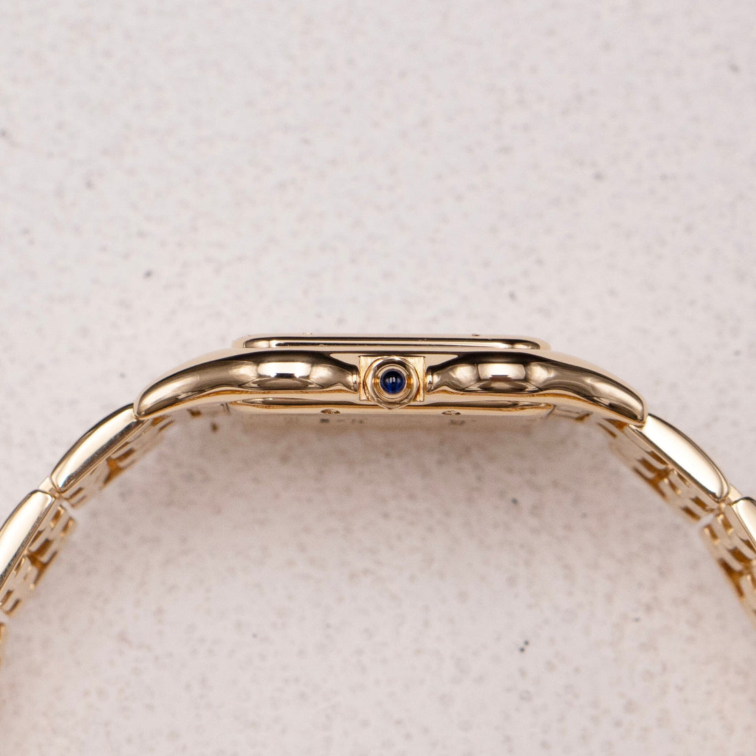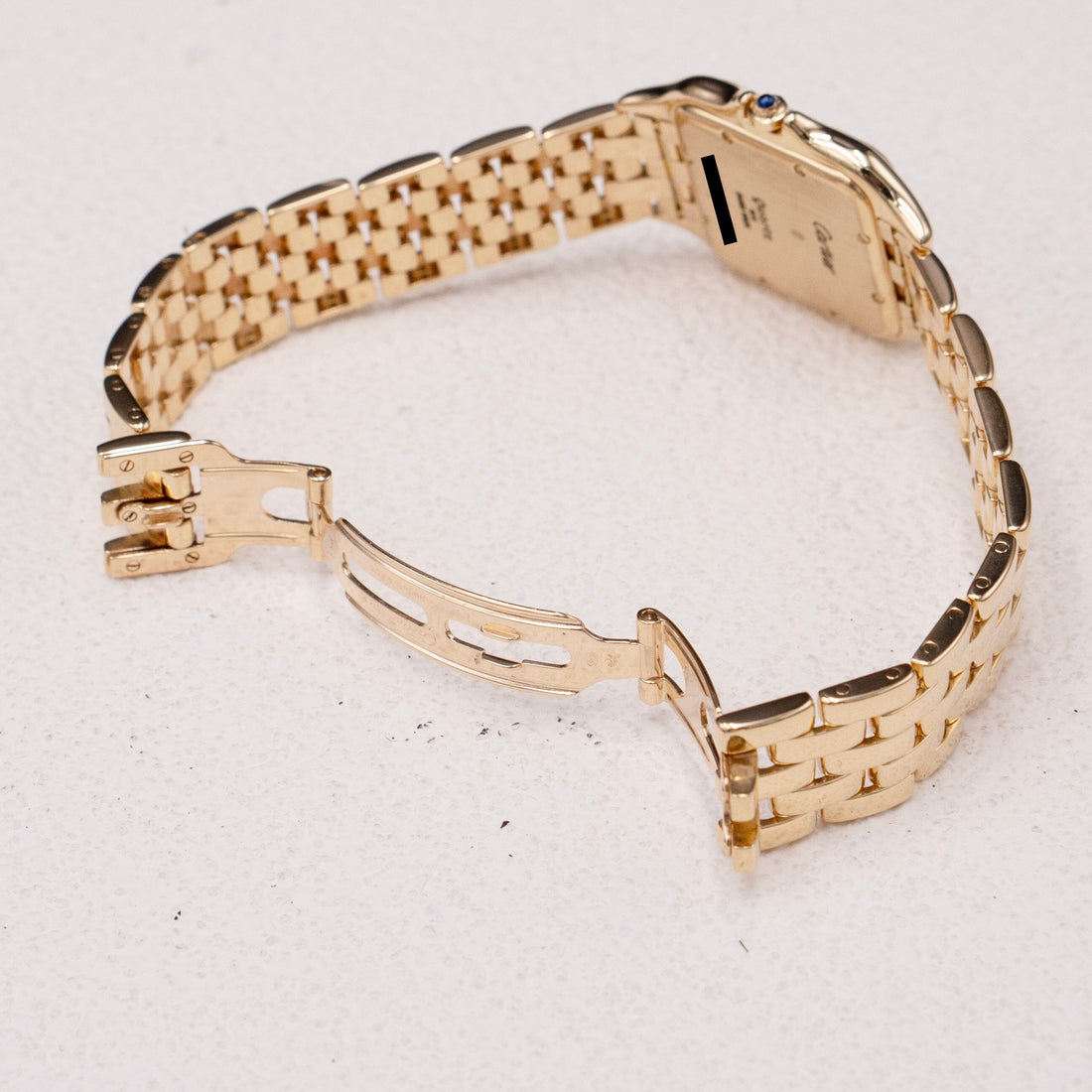 Cartier Panthere Large Mens Watch. 29mm 18K yellow case with 18K yellow gold bezel. Off-white dial with blue steel hands and black Roman numeral hour markers. Date display at the 3 o'clock position. Minute markers on the inner dial. 18K yellow gold bracelet with a hidden butterfly clasp. Will fit up to a 6.5-inch wrist. Sapphire crystal. 18K yellow gold case back. Quartz: battery powered movement.