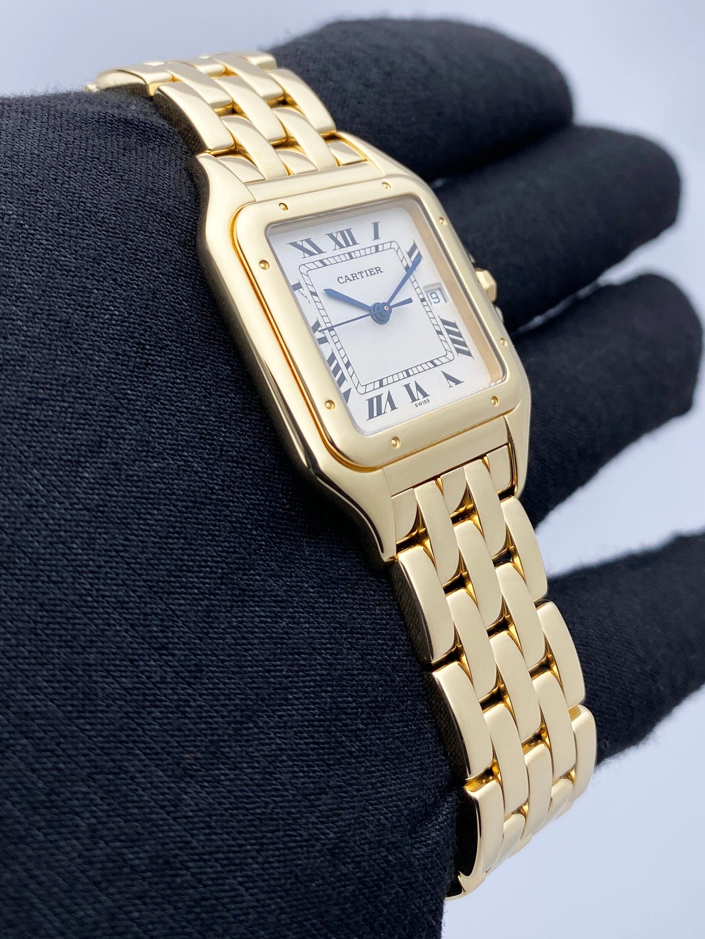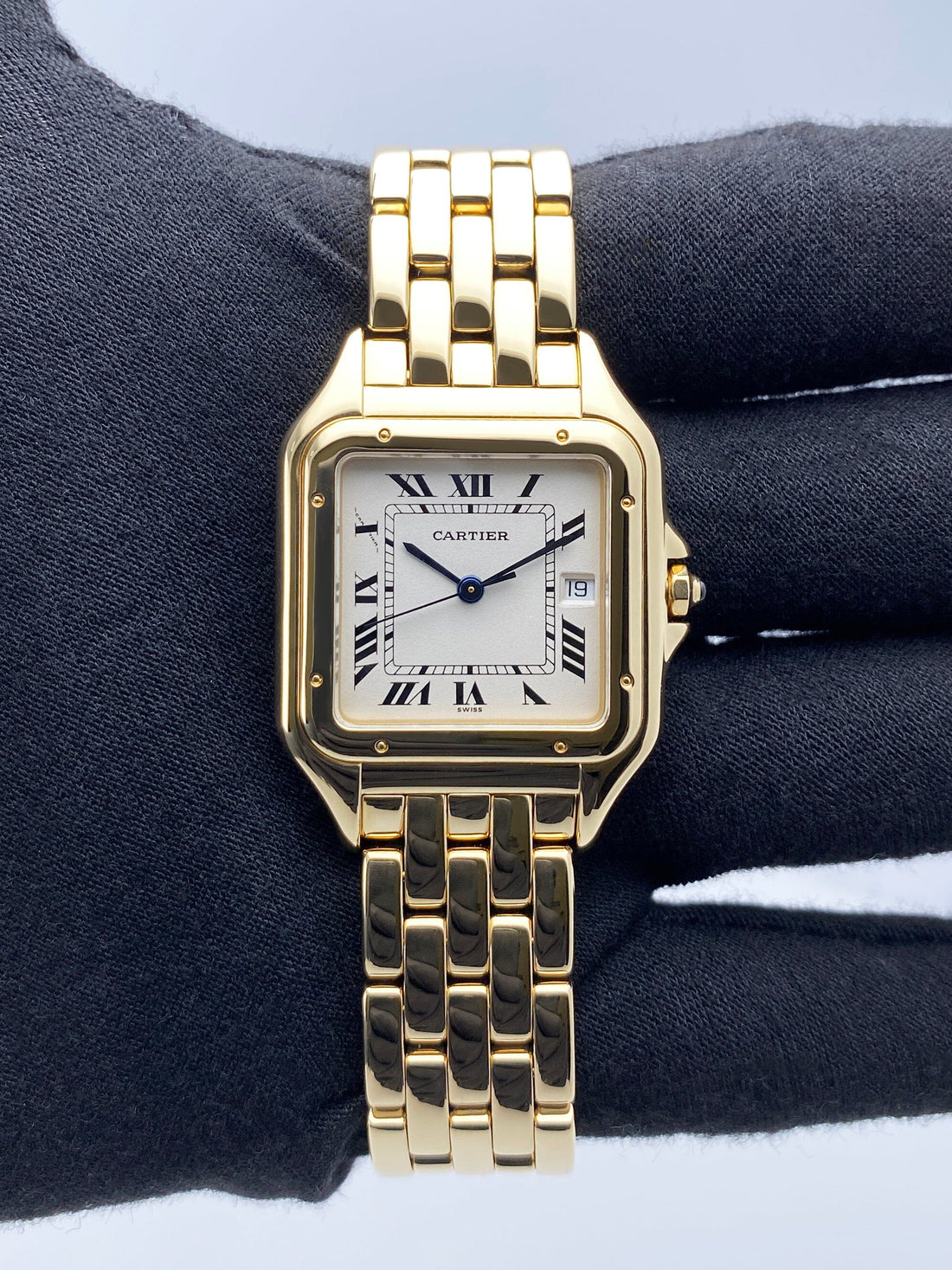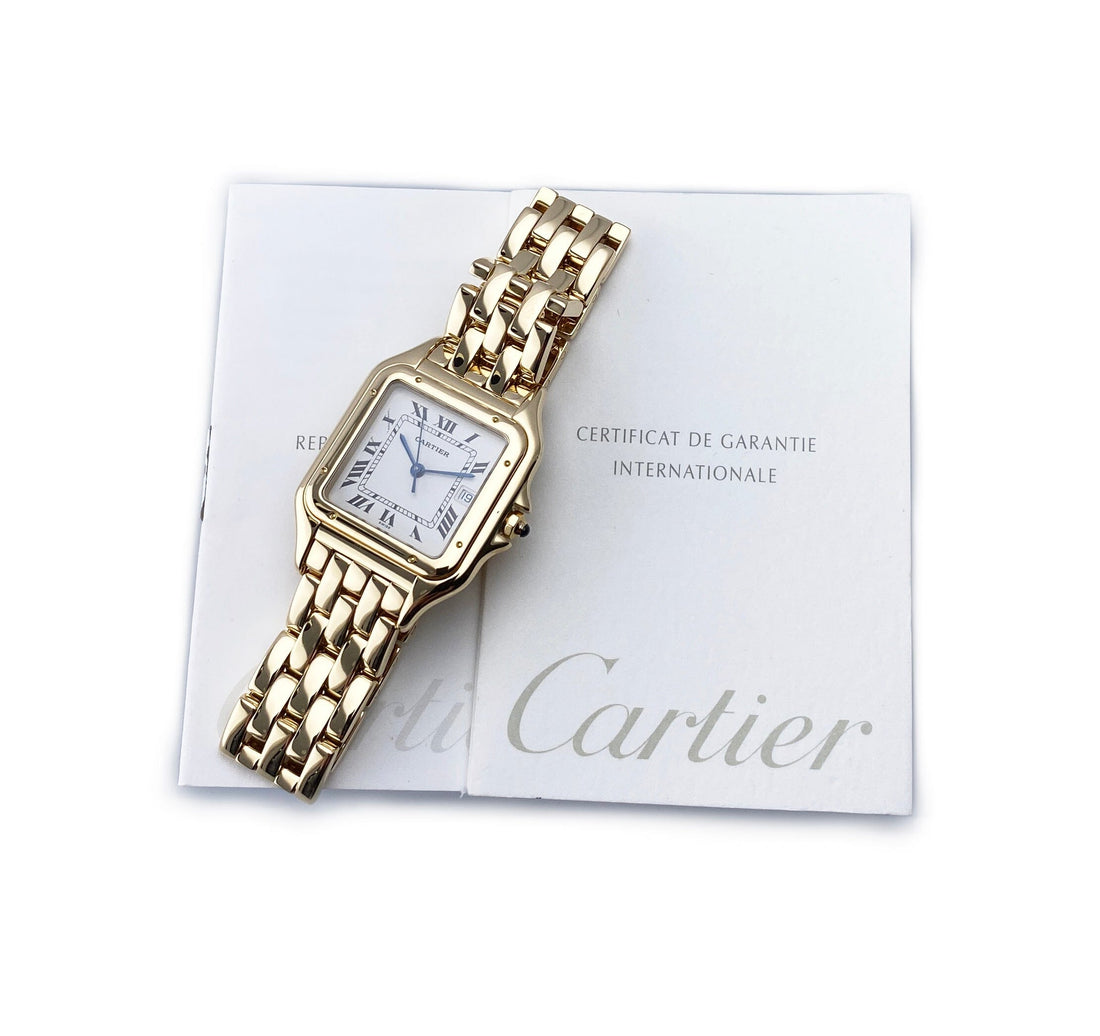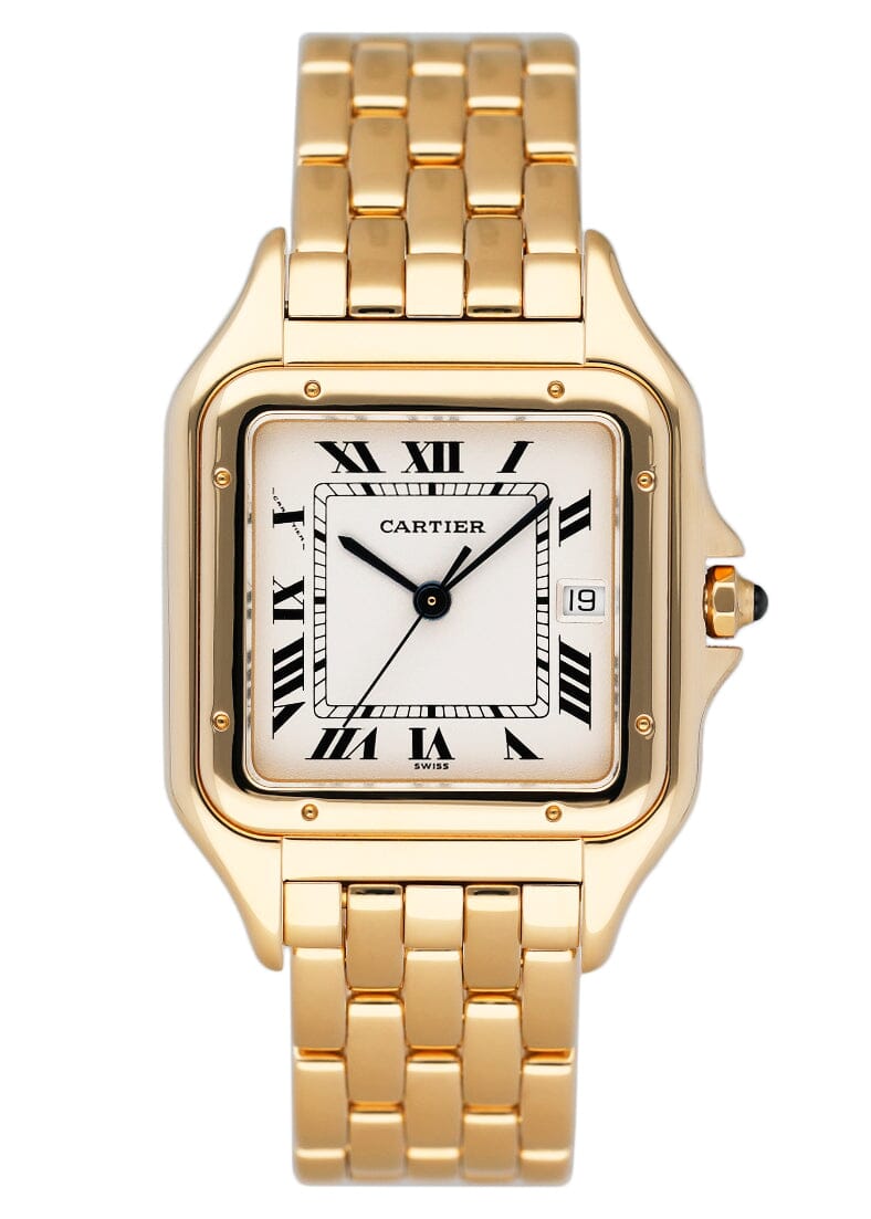 Cartier Panthere Large W25014B9 / 1060 Mens Watch. 29mm 18K yellow case with 18K yellow gold bezel. Off-white dial with blue steel hands and black Roman numeral hour markers. Date display at the 3 o'clock position. Minute markers on the inner dial. 18K yellow gold bracelet with a hidden butterfly clasp. Will fit up to a 7.5-inch wrist. Sapphire crystal. 18K yellow gold case back. Quartz: battery powered movement. This watch comes with original Box and Papers.