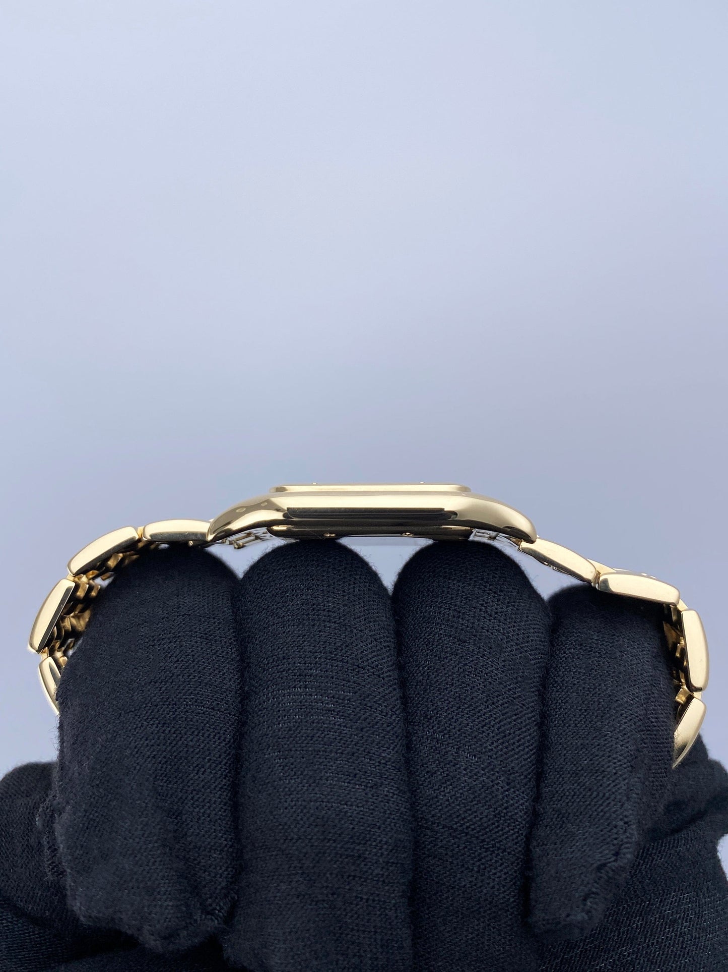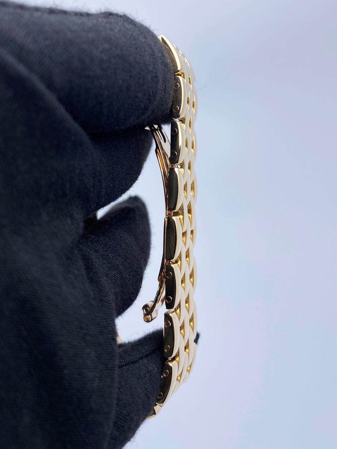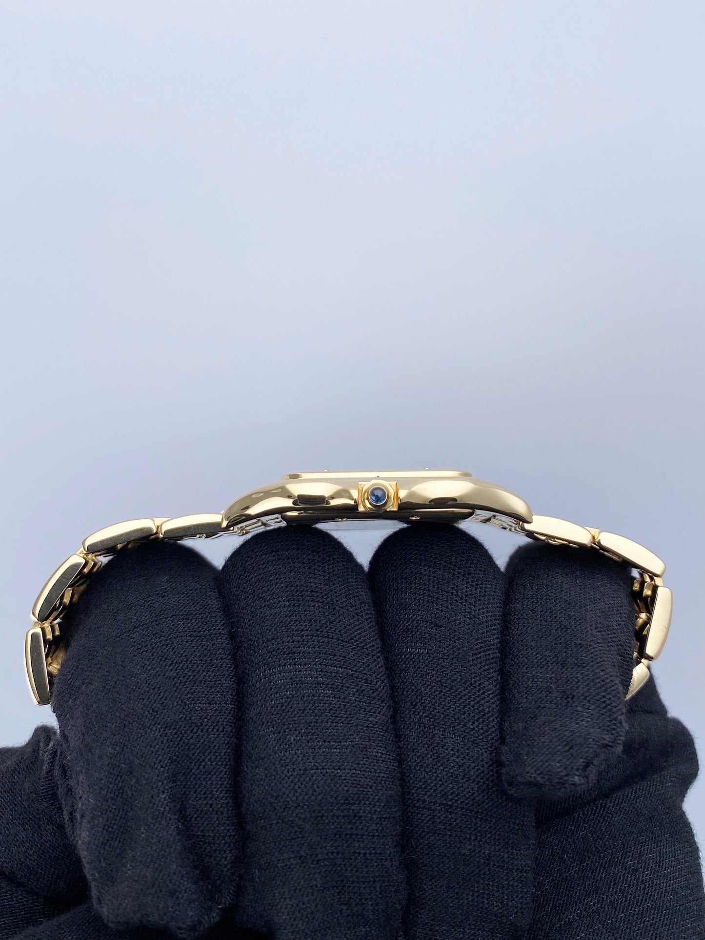 Cartier Panthere Large W25014B9 / 1060 Mens Watch. 29mm 18K yellow case with 18K yellow gold bezel. Off-white dial with blue steel hands and black Roman numeral hour markers. Date display at the 3 o'clock position. Minute markers on the inner dial. 18K yellow gold bracelet with a hidden butterfly clasp. Will fit up to a 7.5-inch wrist. Sapphire crystal. 18K yellow gold case back. Quartz: battery powered movement. This watch comes with original Box and Papers.