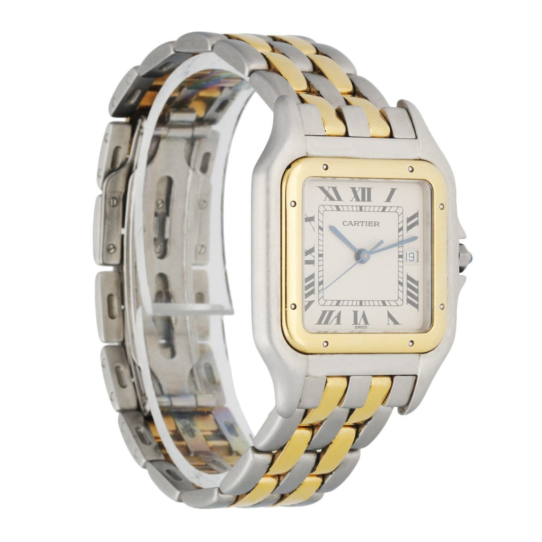 Cartier Panthere Large Men's Watch. 29mm Stainless Steel case. 18K Yellow Gold bezel. Off-White dial with Blue steel hands and black Roman numeral hour markers. Minute markers on the inner dial. Date display at the 3 o'clock position. Stainless Steel & 18k Yellow Gold Bracelet with Butterfly Clasp. Will fit up to a 6.75-inch wrist. Sapphire Crystal, Stainless steel case back. Quartz: Battery powered movement.